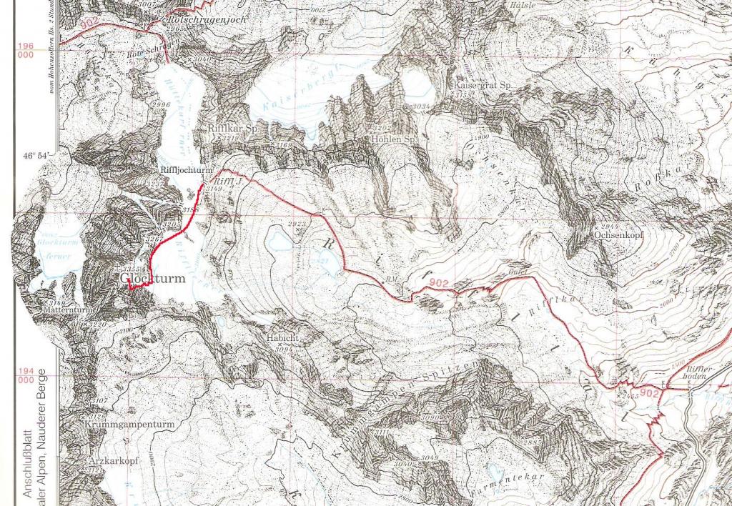 Si sale lungo il comodo sentiero palinato con n. 902, prima fra prati poi, oltre i 2700 su terreno morenico e fine detrito; si superano così due laghetti (2.820 e 2.890 m. ca) per arrivare sotto il Riffljochl (3.149 m.) a cui si giunge fra ripidi detriti. Dal passo seguire le indicazioni per il Glockturm e le tracce che scavalcano un piccolo dosso, passano un colletto con sentiero in piano fino ad arrivare ad una forcella dove da destra giunge il canaletto dell’itinerario dal rifugio Hohenzollern Haus. Da qui si sale una breve rampa in diagonale con passaggi attrezzati con corde fisse tra alcune roccette; si prosegue sempre attraversando a sinistra su tratti di sfasciumi e roccia stabili (qualche facile passo di I) fino alla base del pendio finale di sfasciumi che ben tracciato porta alla croce di vetta (3.355 m.).