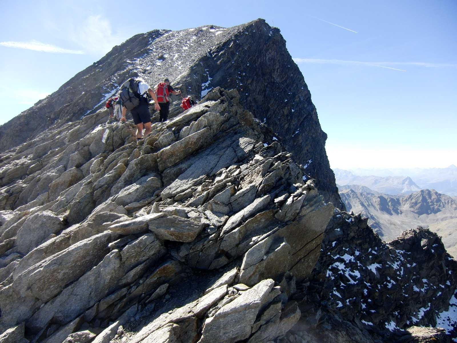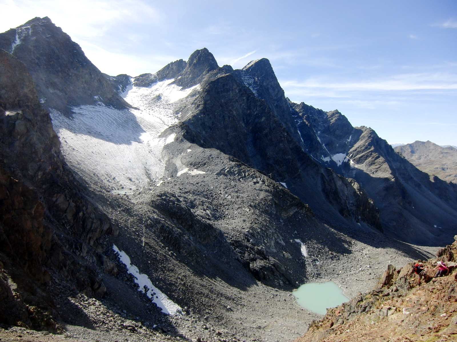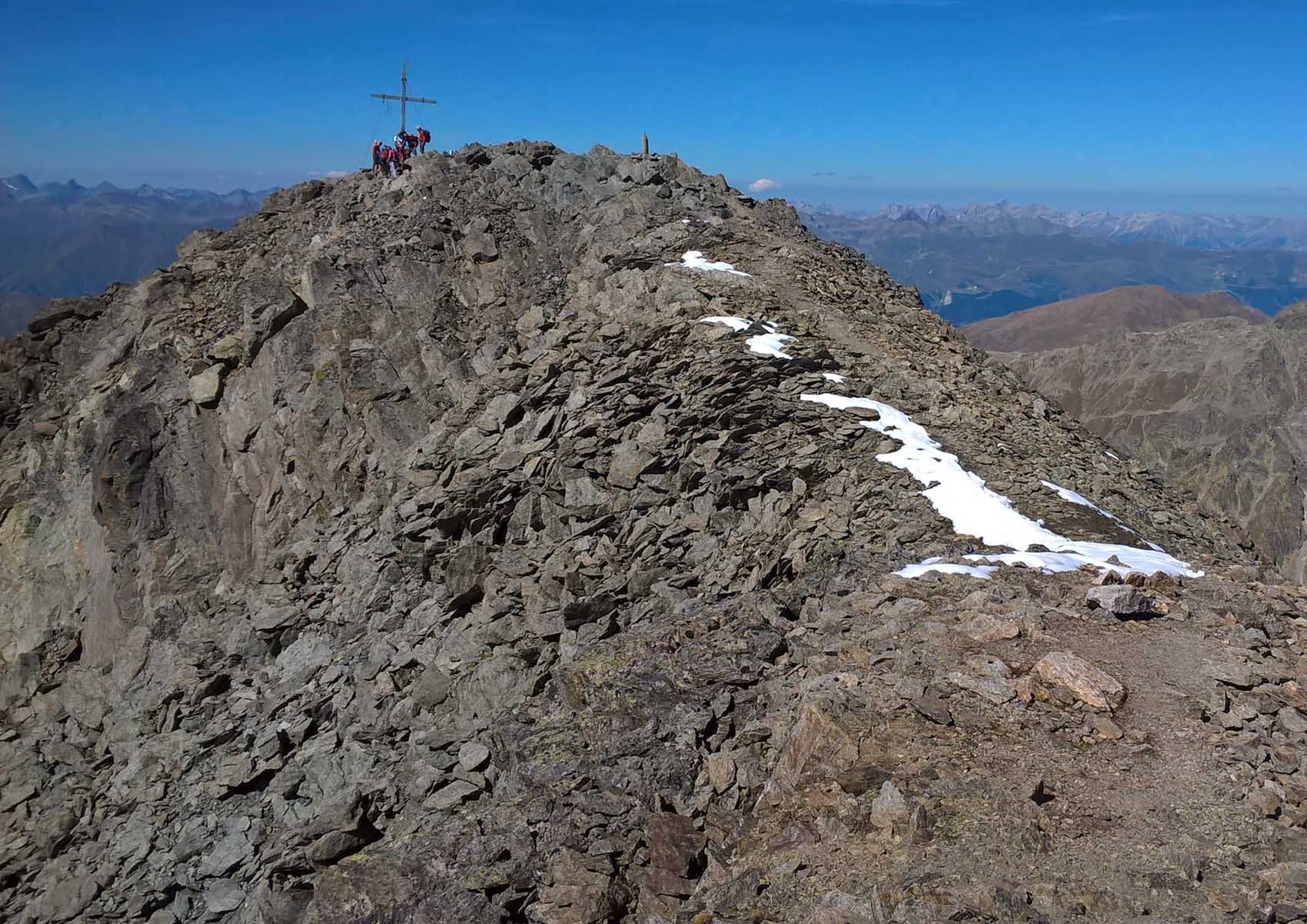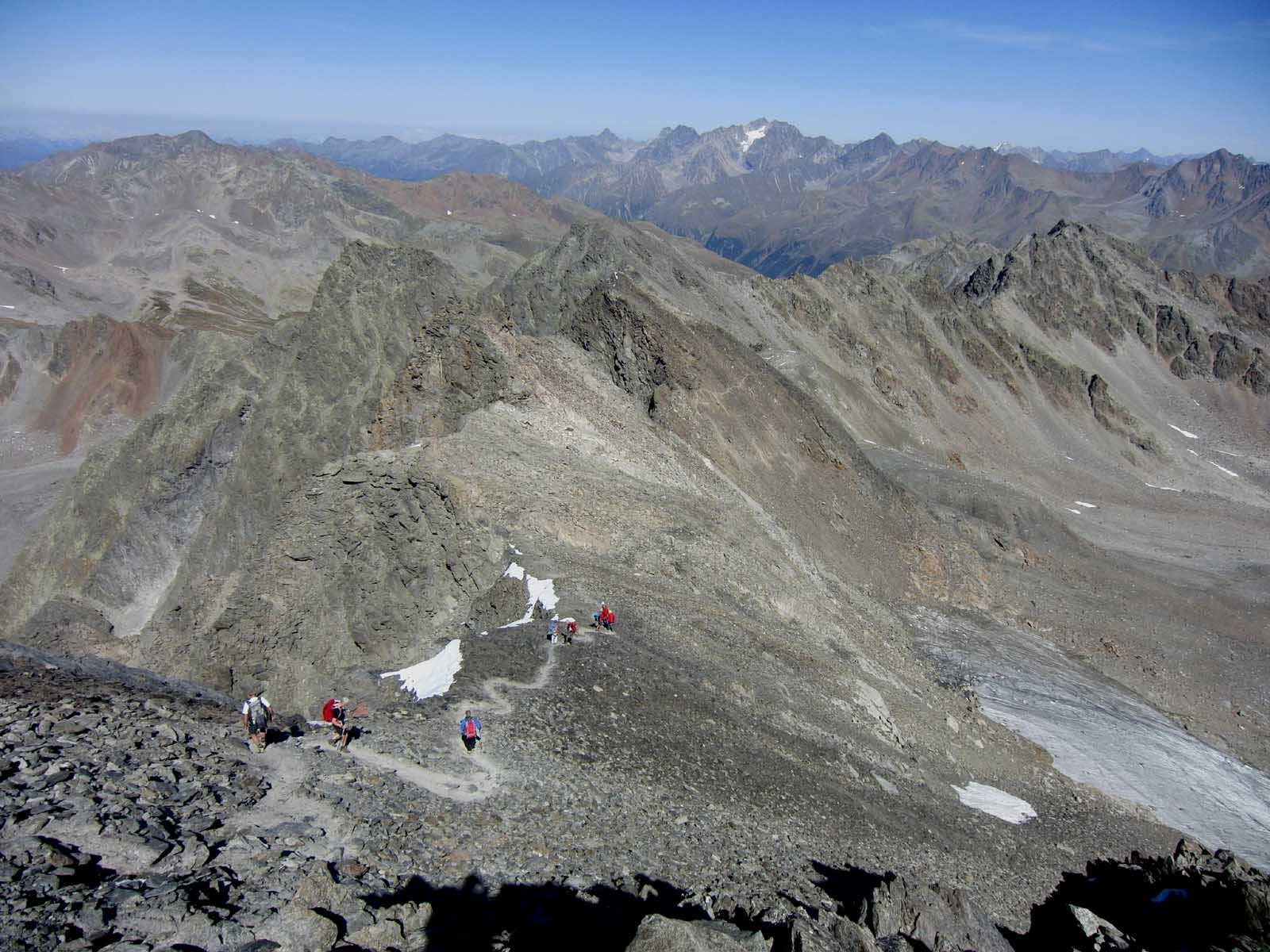 Non salire a sinistra verso il colle RotschragenJoch, ma deviare a destra, attraversare su sfasciumi e raggiungere il residuo del ghiacciaio Huttekarferner che si sale verso un canaletto un po’ ripido che porta ad una selletta dove si incontra il sentiero della normale che giunge da sinistra dal Riffljoch (versante del rifugio Gepatschhaus), per proseguire con l’itinerario comune sulla cresta verso la vetta.