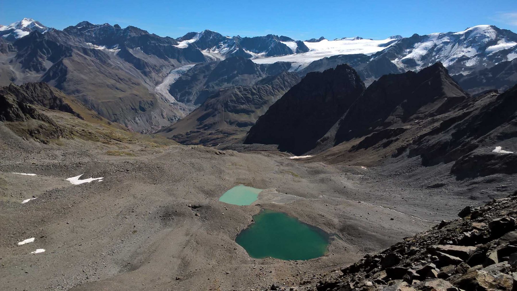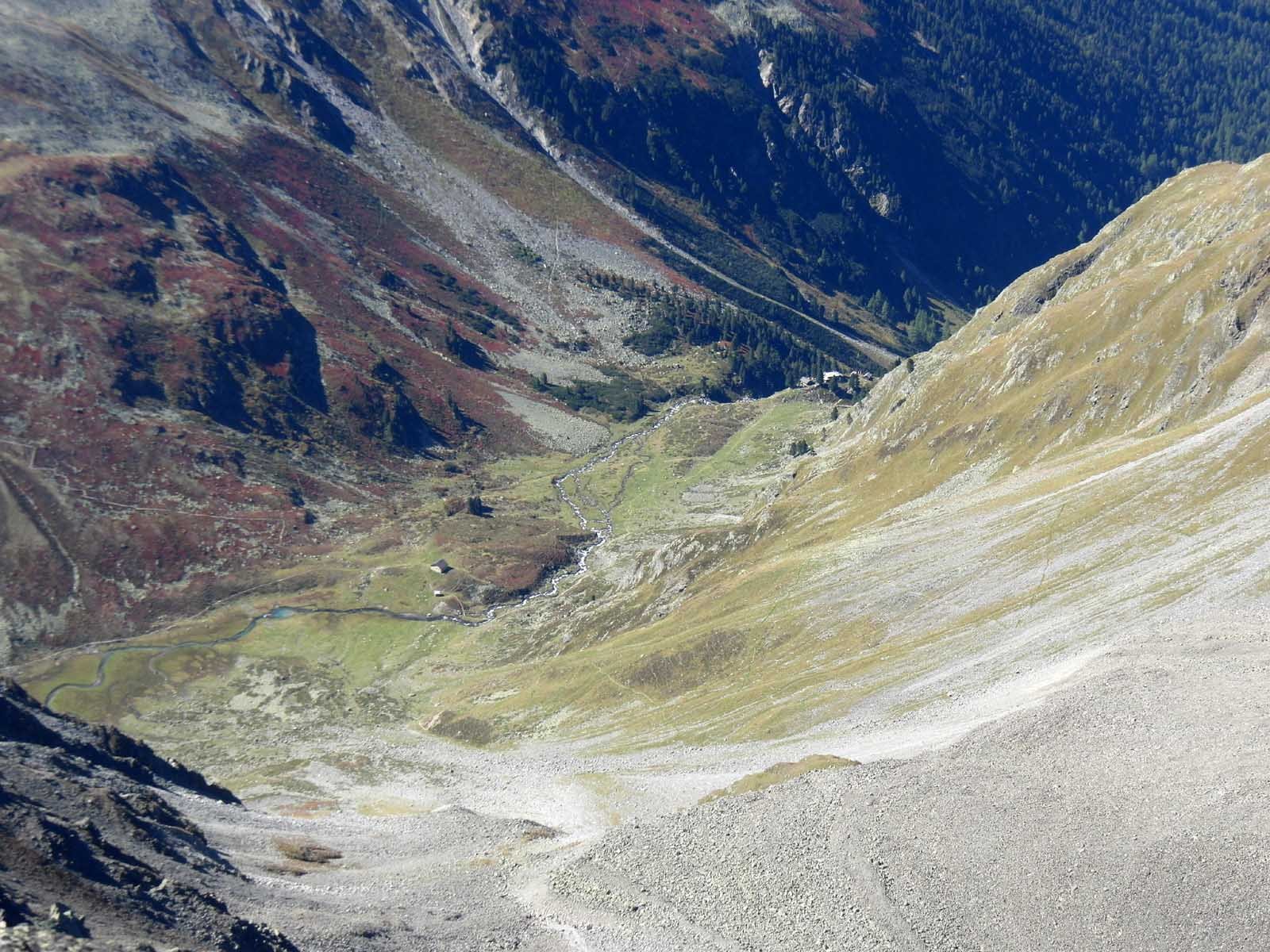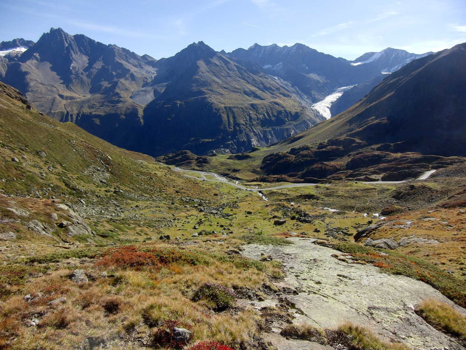 2) Dal rifugio Hohenzollernhaus, si risale il sentiero fino al bivio nei pressi della casetta Zollhutte; non si supera la passerella ma si sale a sinistra sul sentiero 902 il quale si inoltra in un valloncello e procede facilmente fino ad un passaggio alla sinistra di una testata morenica da superare su roccette con l’ausilio di un breve tratto di corde fisse e si prosegue sul sentiero che attraversa varie pietraie e zone erbose fino ad un bivio.