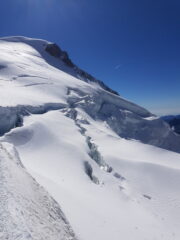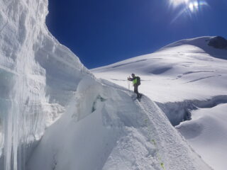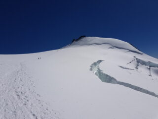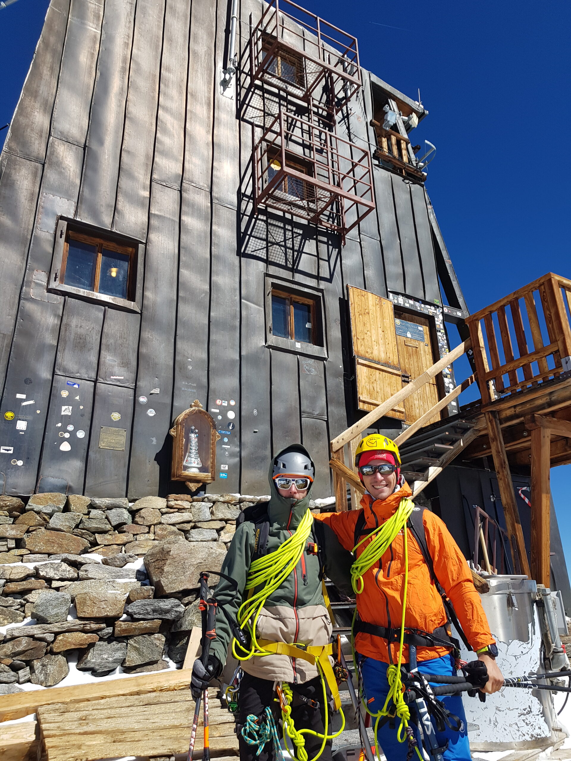 Sparata alla Margherita chiaramente in giornata. Con tutta la calma del mondo ci leghiamo verso le 10, sguardo in alto e saliamo tra l’infinito dedalo di crepacci dietro la cap. Gnifetti, pazzesco! Le temperature malgrado il sole picchi forte rimangono belle fresche e i ponti tengono da dio. La traccia è ottima, ben segnata, nessuna difficoltà a parte un ponte saltato che costringe a un salto su una rottura di 60cm circa, e un altro paio di passaggi un pò delicati che forniscono l’unico misero ingaggio di una salita dalle difficoltà tecniche nulle. Malgrado il socio non sia in forma alle 13.15 siamo in capanna, gli ultimi clienti della stagione! Rimasti solo noi alle 13.30 scendiamo. Fa caldo ma le condizioni rimangono ottime, in discesa dal colle del Lys in giù attenzione, è un campo minato e non sono belli aperti ed evitabili come dalla Vincent in giù. Alle 15.30 siamo alla Gnifetti dove scorrono letteralmente fiumi d’acqua. Gran uscita dopo due mesi di stop per caviglia sfanculata, meteo super, mi spiace per il socio. Scrivo la recensione per fare un doveroso comunicato sulla situazione del ghiacciaio: è completamente aperto nella zona bassa, ma comunque sicuro seguendo la traccia(meglio vederli ed evitarli che passarci sopra a cuor leggero). Non attardarsi nel scendere. Le cadute di blocchi dai seracchi non sono da prendere sottogamba, soprattutto sotto la Parrot e sotto la punta Gnifetti. Dopo 3 mesi da un’uscita fatta a Giugno non sembra lo stesso posto. Il ghiacciaio di Indren è ridotto a un terzo, spavanentoso. 3 stelle solo per il tipo di salita che non mi fa impazzire. Chiaramente l’ambiente è spaziale, con giornate così poi non parliamone, fotonico