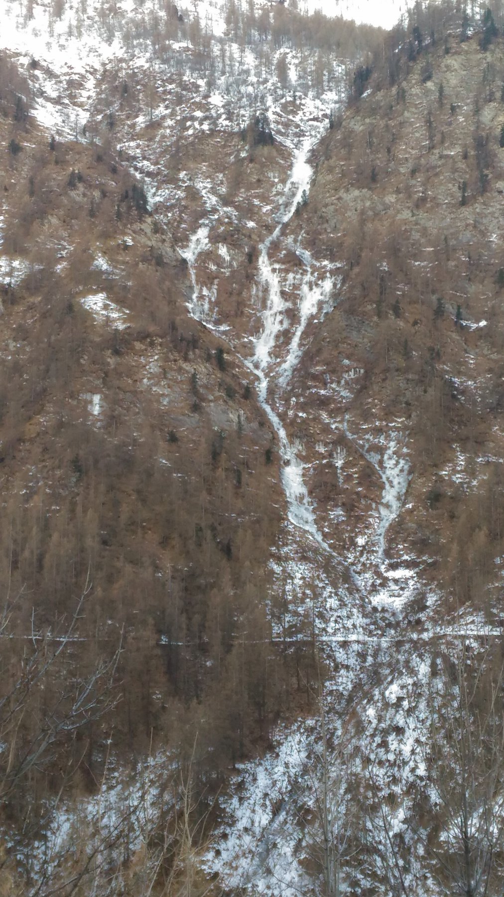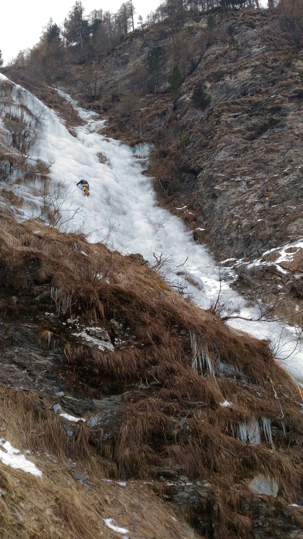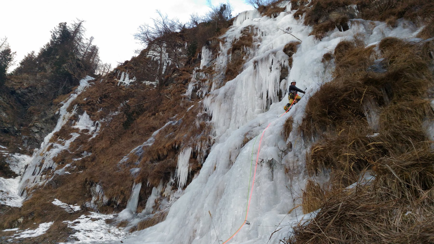 La cascata è formata da tre muri separati da canali nevosi/ghiacciati e boschi radi. Il salto centrale, il più impegnativo, presenta diverse possibilità di salita.