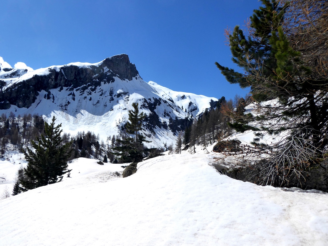 Si prosegue nel lariceto, alternando strappetti a tratti più dolci, costeggiando dall’alto (non visibile) il torrente Bardoney con il rumore delle sue cascate.
