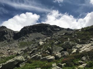Dal colle alla cima i numerosi ometti indicano la via, ripida e faticosa, su terreno a volte sdrucciolevole.