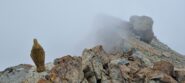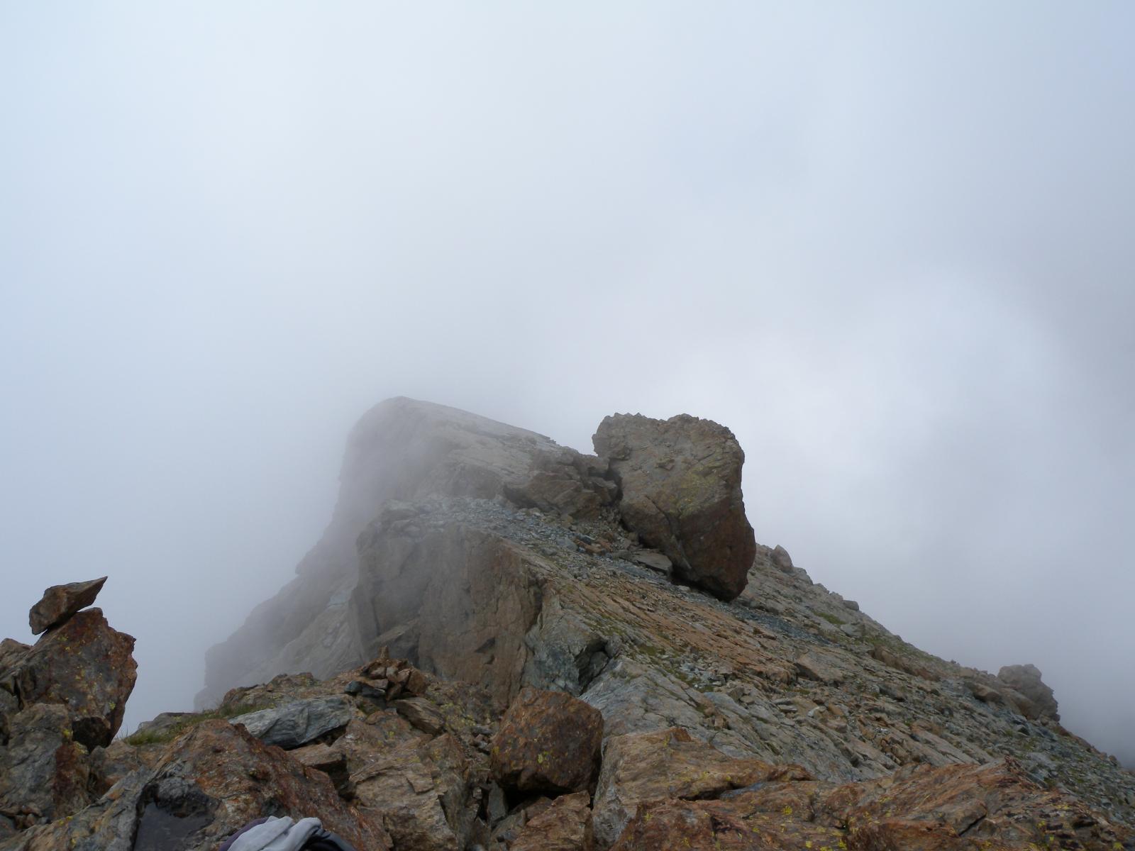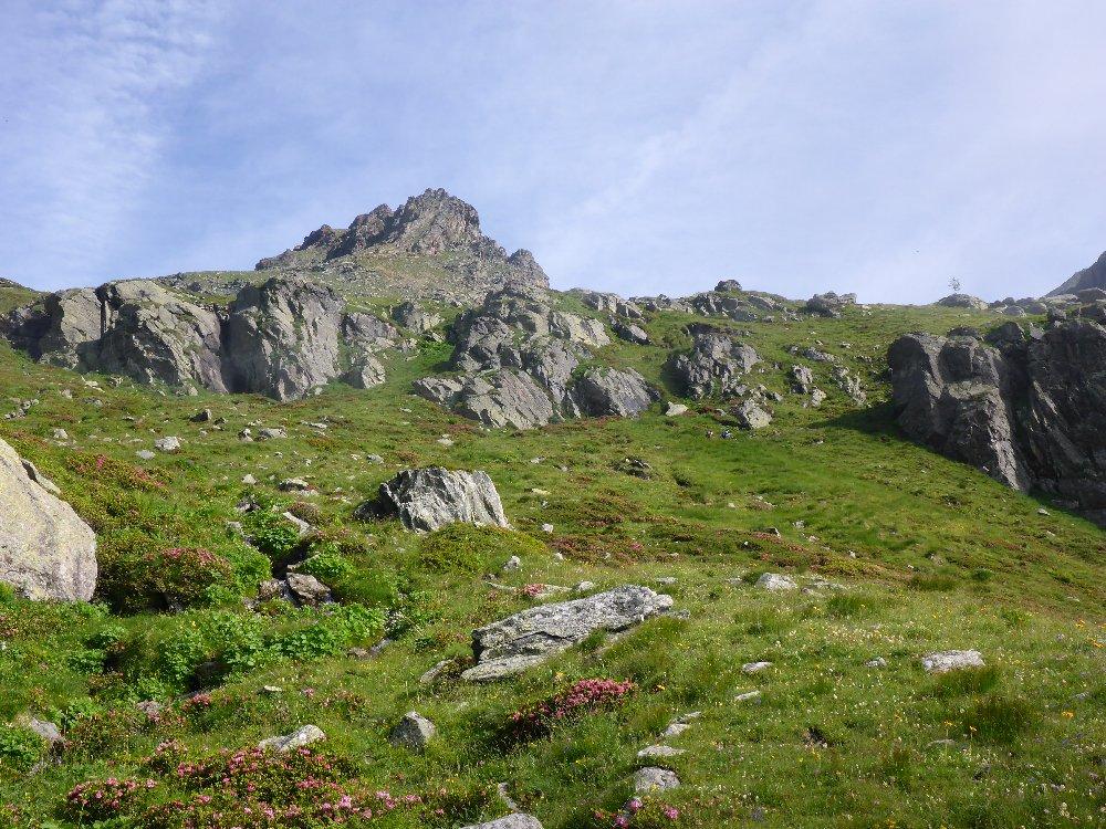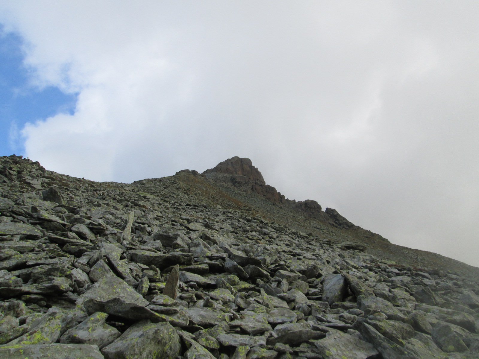 Da qui salire a destra su un dosso di erba e sassi molto ripido. Dopo la pendenza dimiuisce e si continua su pietraie e magri prati, tenendosi quasi sulla cresta a sinistra . La traccia è comunque sempre segnata discretamente con ometti.