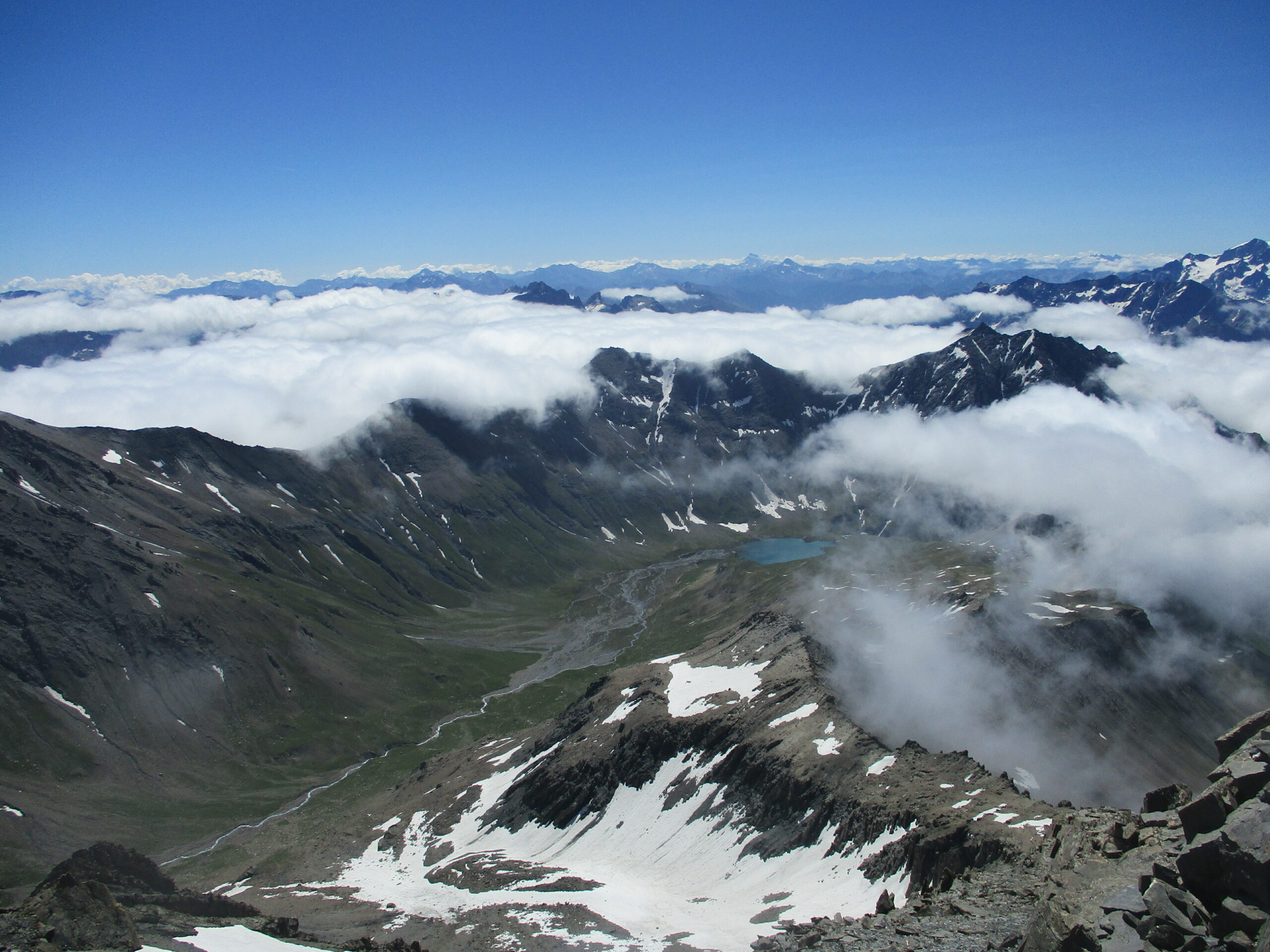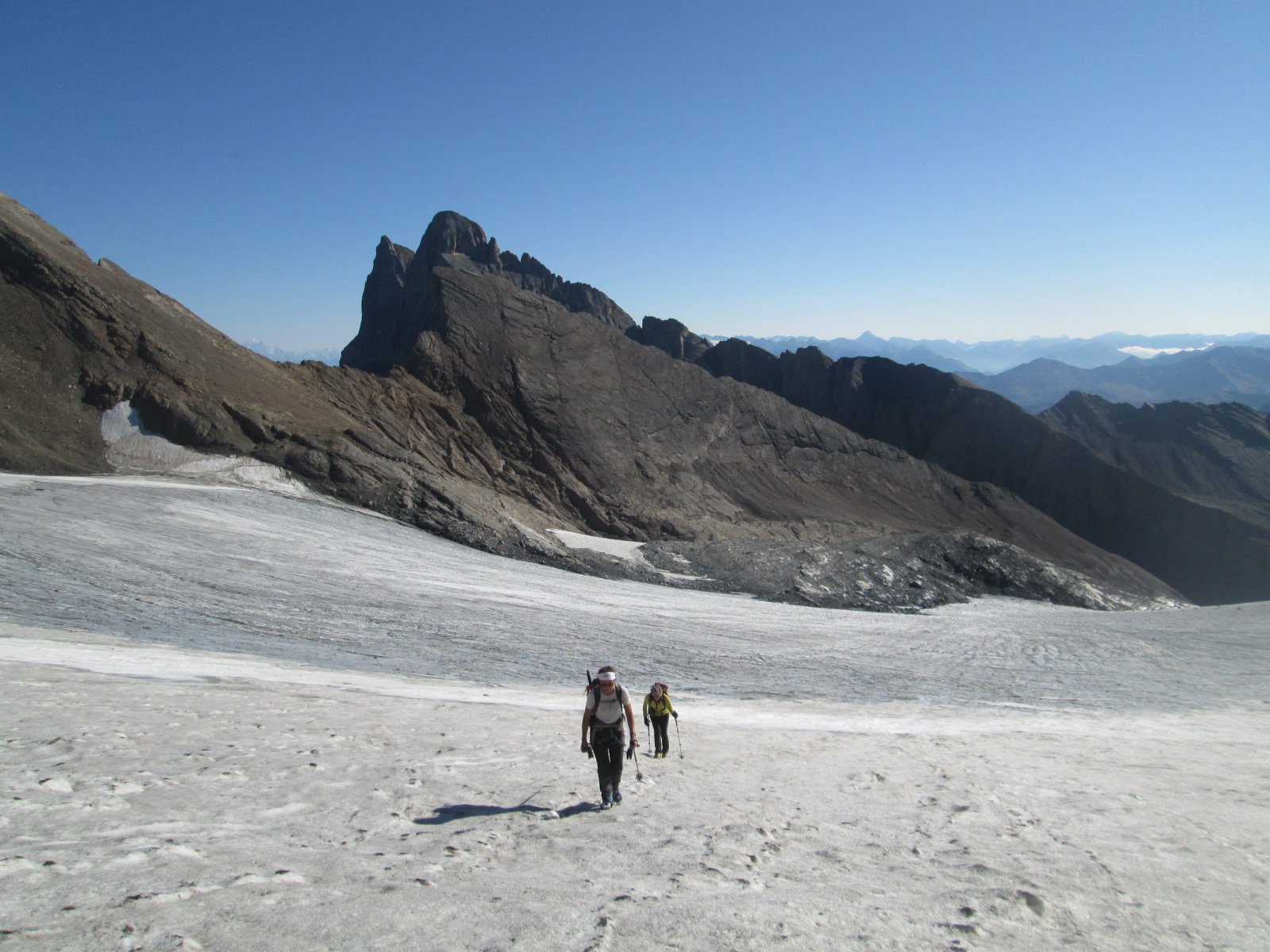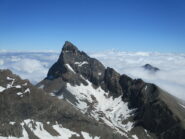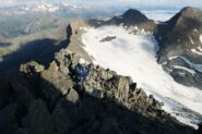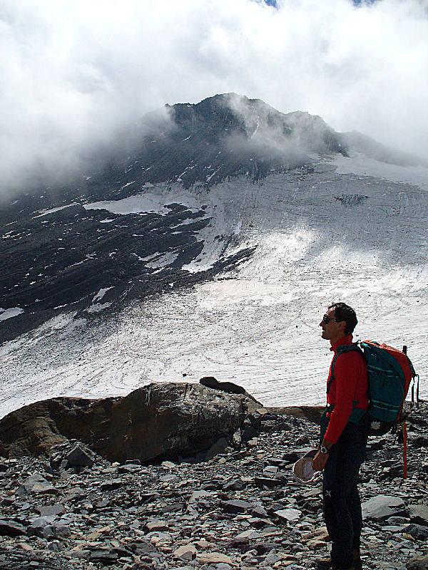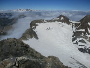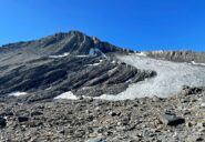 Raggiunta la depressione, si prosegue con percorso pressochè pianeggiante su tracce di sentiero alternate a qualche roccetta banale, fino a giungere alla base della vera e propria cresta, dove si impenna. La cresta si presenta rocciosa, ma in realtà presenta ben pochi passaggi obbligati, tra l’altro su facili gradoni di I/I+, mentre gli ostacoli all’apparenza più ostici (II) si possono sempre aggirare comodamente individuando una marcata traccia di passaggio ora su un lato, ora sull’altro. Occorre avere l’accortezza poi di riguadagnare immediatamente la cresta e non avventurarsi sugli infami sfasciumi dei due versanti (in particolare quello sud). L’ultimo tratto, si percorre su una traccia sul lato del ghiacciaio, per poi risalire in cresta e percorrere i pochi metri che separano dall’ometto sul lato sud.