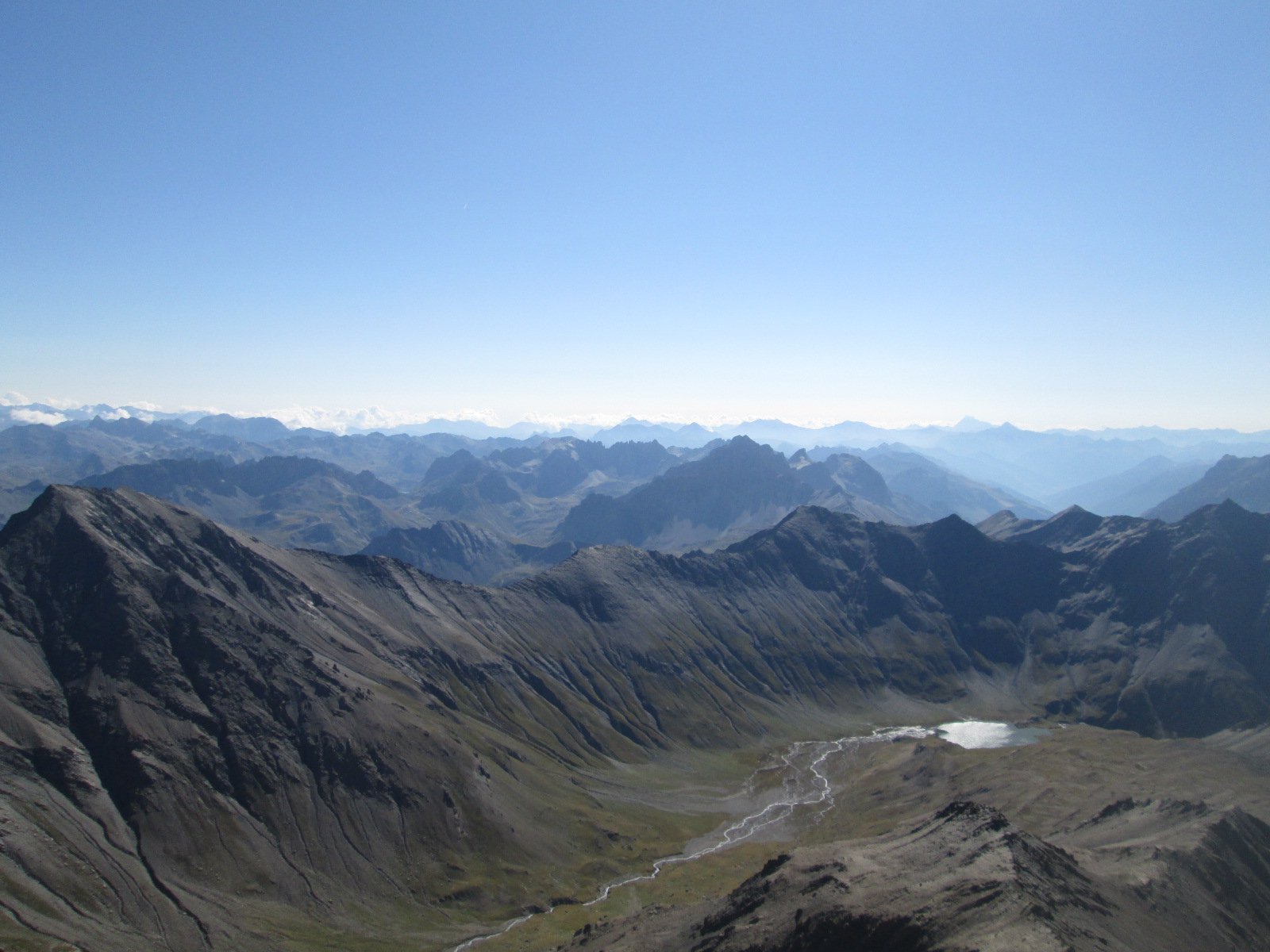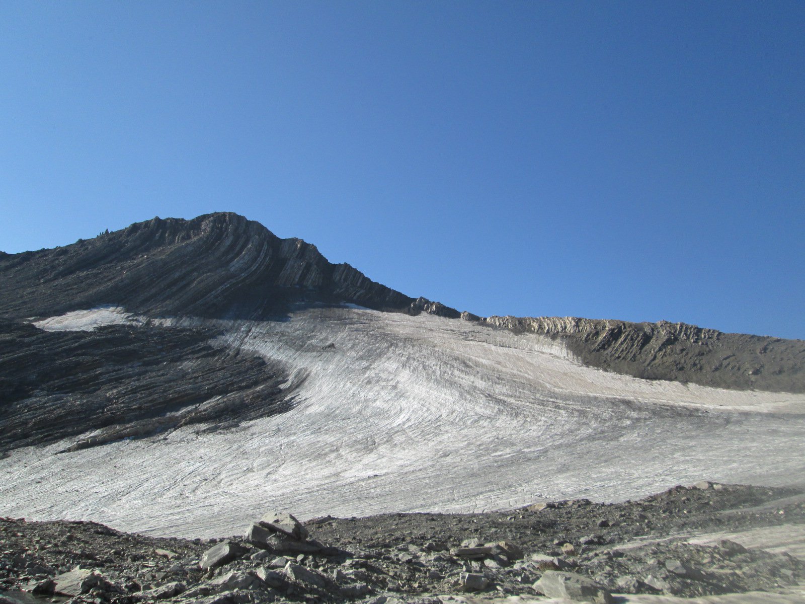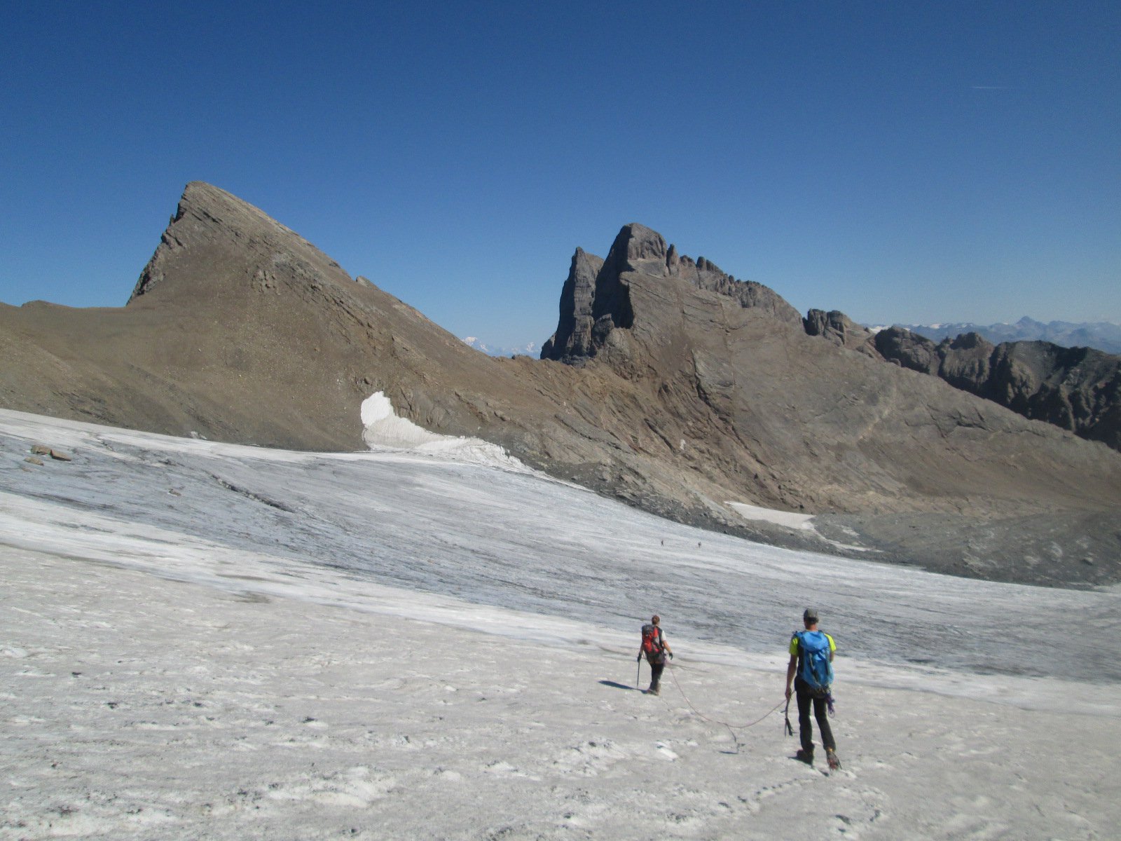 Raggiunta la depressione, si prosegue con percorso pressochè pianeggiante su tracce di sentiero alternate a qualche roccetta banale, fino a giungere alla base della vera e propria cresta, dove si impenna. La cresta si presenta rocciosa, ma in realtà presenta ben pochi passaggi obbligati, tra l’altro su facili gradoni di I/I+, mentre gli ostacoli all’apparenza più ostici (II) si possono sempre aggirare comodamente individuando una marcata traccia di passaggio ora su un lato, ora sull’altro. Occorre avere l’accortezza poi di riguadagnare immediatamente la cresta e non avventurarsi sugli infami sfasciumi dei due versanti (in particolare quello sud). L’ultimo tratto, si percorre su una traccia sul lato del ghiacciaio, per poi risalire in cresta e percorrere i pochi metri che separano dall’ometto sul lato sud.