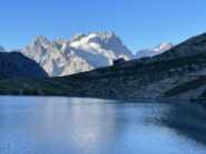 Si prosegue contornando il lago sulla sinistra, su comodo sentiero, per poi proseguire nel lungo vallone che ha origine sulla sinistra, restando sul sentiero che si mantiene 20 m in alto rispetto al pianoro erboso-acquitrinoso (Replat d’Amont). Sempre con percorso in piano o leggera ascesa, si raggiunge l’antico Refuge Carraud 2500 m e si continua a mezza costa fra magri pascoli per iniziare ad aggirare le propaggini dei Rochers du Vallon. Finalmente al termine del ripiano erboso il sentiero riprende a salire più marcatamente, ben delineato attraversando una breve pietraia, per poi proseguire sulla morena, piuttosto agevolmente. Si dovrò attraversare a 2800 m (dove si tralasciano le tracce di destra per il Col Lombard) l’emissario del ghiacciaio, c’è qualche ometto a indicare il punto migliore, in ogni caso conviene attraversarlo dove si forma un piccolo ripiano e dipartono numerosi ruscelli indipendenti. Si riprende quindi a salire ora fra detriti e una breve fascia di rocce montonate, per poi sbucare su un ampio plateau morenico; si prosegue su questo puntando al ghiacciaio du Goleon, ormai molto ridotto e privo di insidie. A seconda della stagione e dell’innevamento lo si attacca nel punto più comodo (non c’è percorso obbligato).