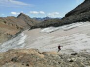 A questo punto si può scegliere se attraversarlo in lieve ascesa con semicerchio da destra a sinistra puntando alla depressione sotto il Bec de Grenier (giro più lungo ma banale), oppure se puntare ad un intaglio a metà della cresta tra la depressione e la cima, affrontando un ultimo tratto in pendenza più marcata (utile in questo caso la piccozza).