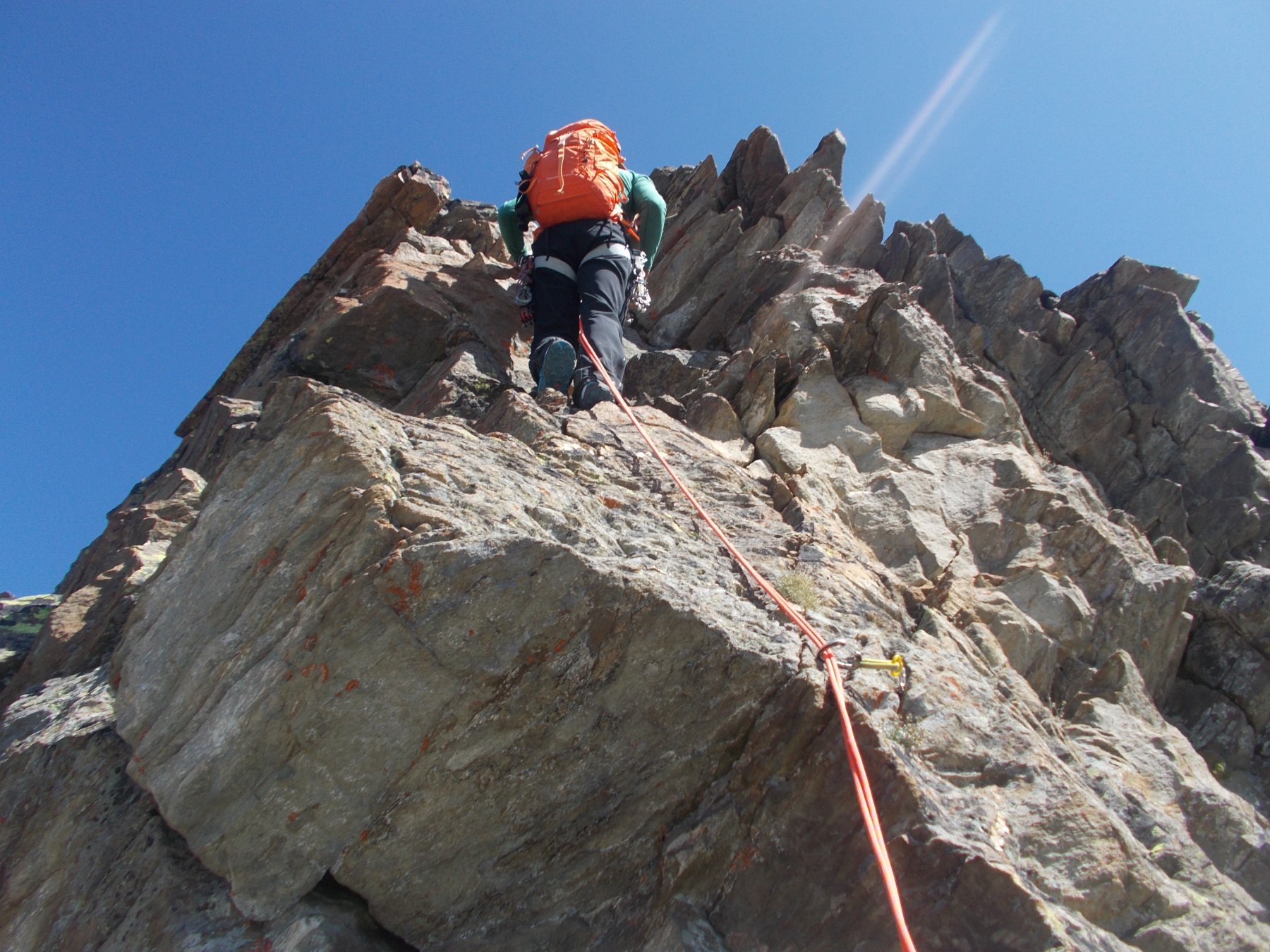 Il primo torrione si affronta lato Valsavaranche con divertente arrampicata su roccia ben salda e facile uscita in cresta.