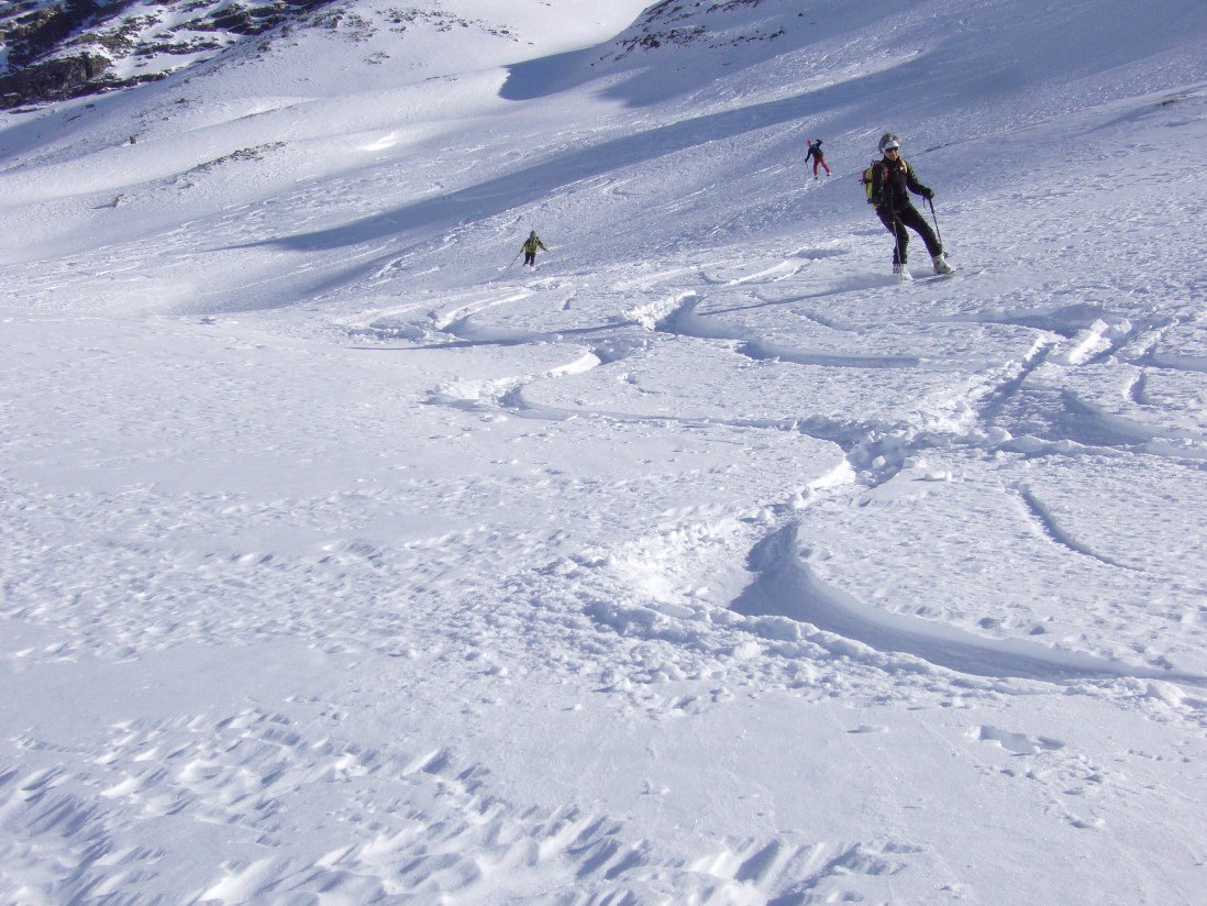 Una trentina di skialp in questa bella gita. Ottima traccia sui pendii superiori, mentre nel bosco era tutta da tracciare ( grazie Barbara). Scesi su neve farinosa trovando ancora molti spazi intonsi.