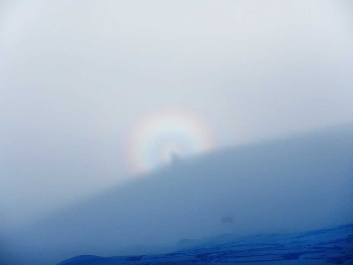 Freddo, nebbia e umido alla partenza da rhemes, oltrepassata la Testa di Entrelor si comincia a vedere chiaro. Abbandoniamo le nebbie che ci regalano un raro fenomeno di “arcobaleno solare” proiettando le nostre immagini all’interno del cerchio iridato. La giornata diventa scintillante, la discesa gioiosa, qualche crosta da vento nei cambi di pendenza. Usciamo dal bosco sulla pista da sci, per evitare brutte placche rigelate tra un larice e l’altro.-11° all’arrivo.