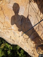 L4) 6b Salire leggermente verso sinistra, rimonta su prese discrete, placca delicata ed elegante su piccole gocce con spittatura leggermente allungata.