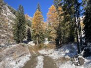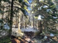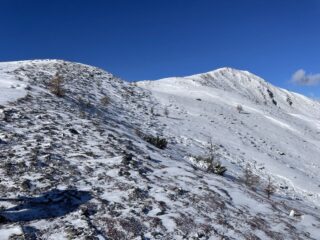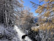 Se si sceglie di scendere in senso antiorario, si raggiunge prima la sella, dove si incontra una mulattiera. Da questo punto, il sentiero prosegue scendendo verso sud fino a circa 1700 metri, per poi deviare a sinistra in direzione della zona degli impianti di risalita.