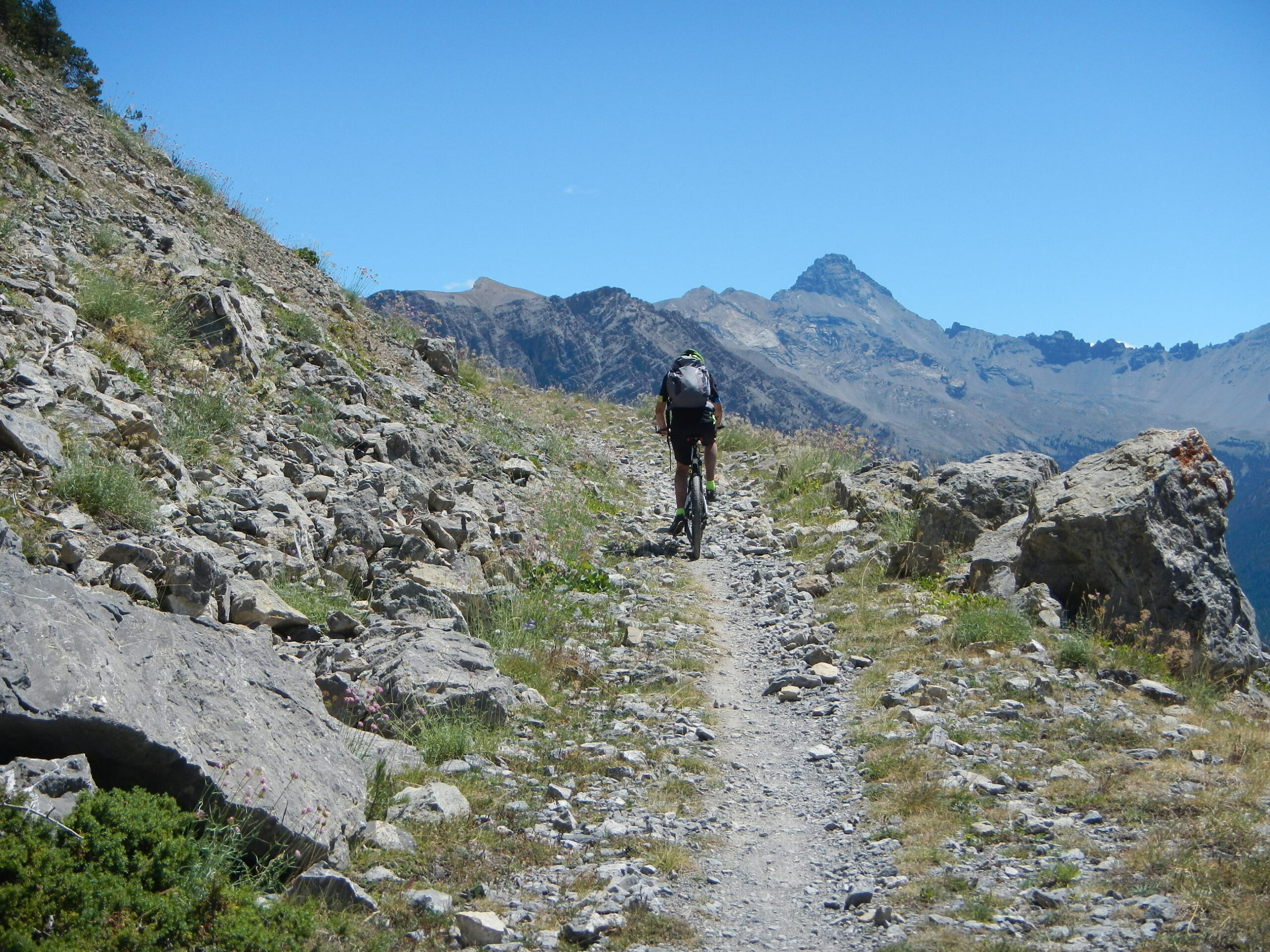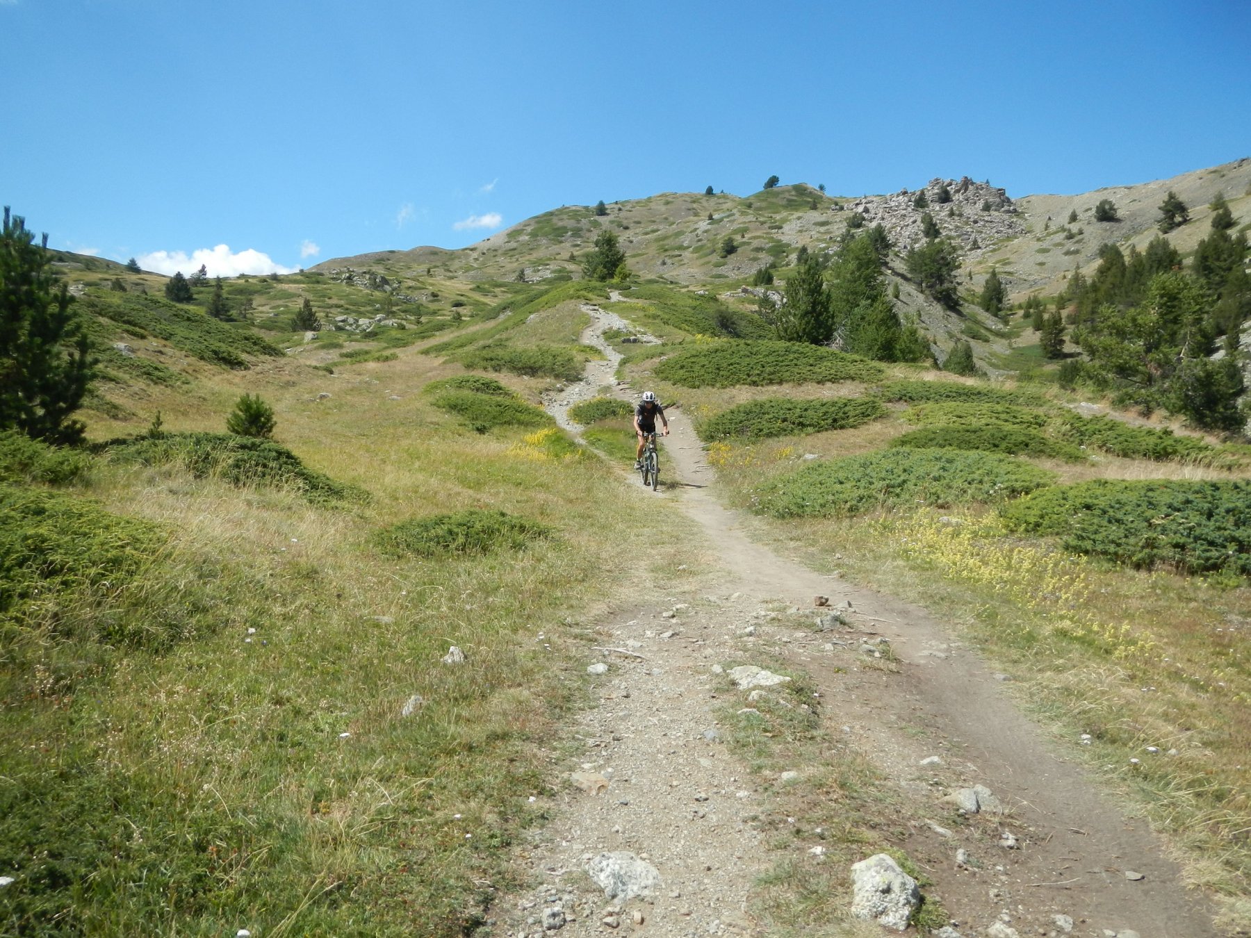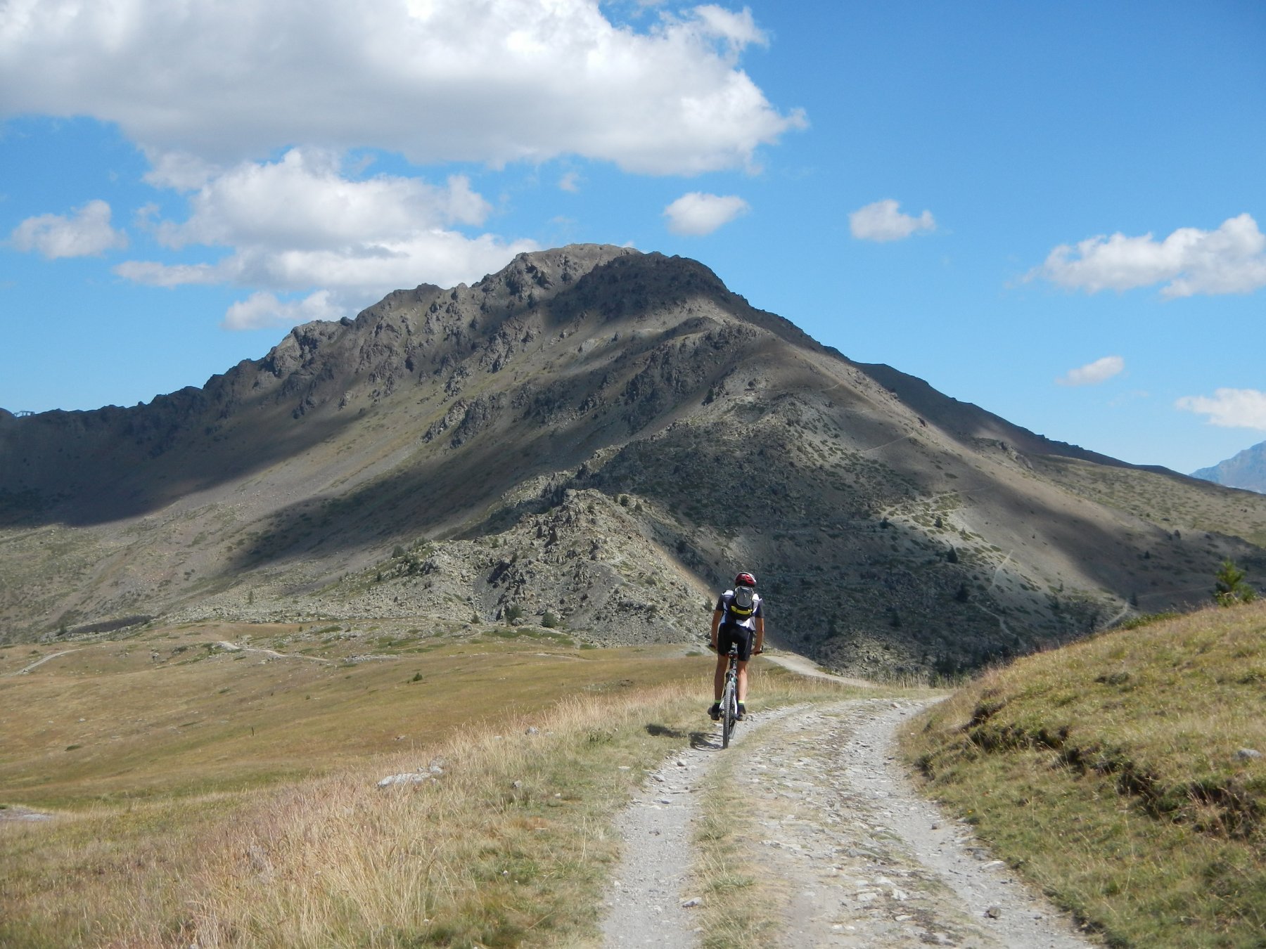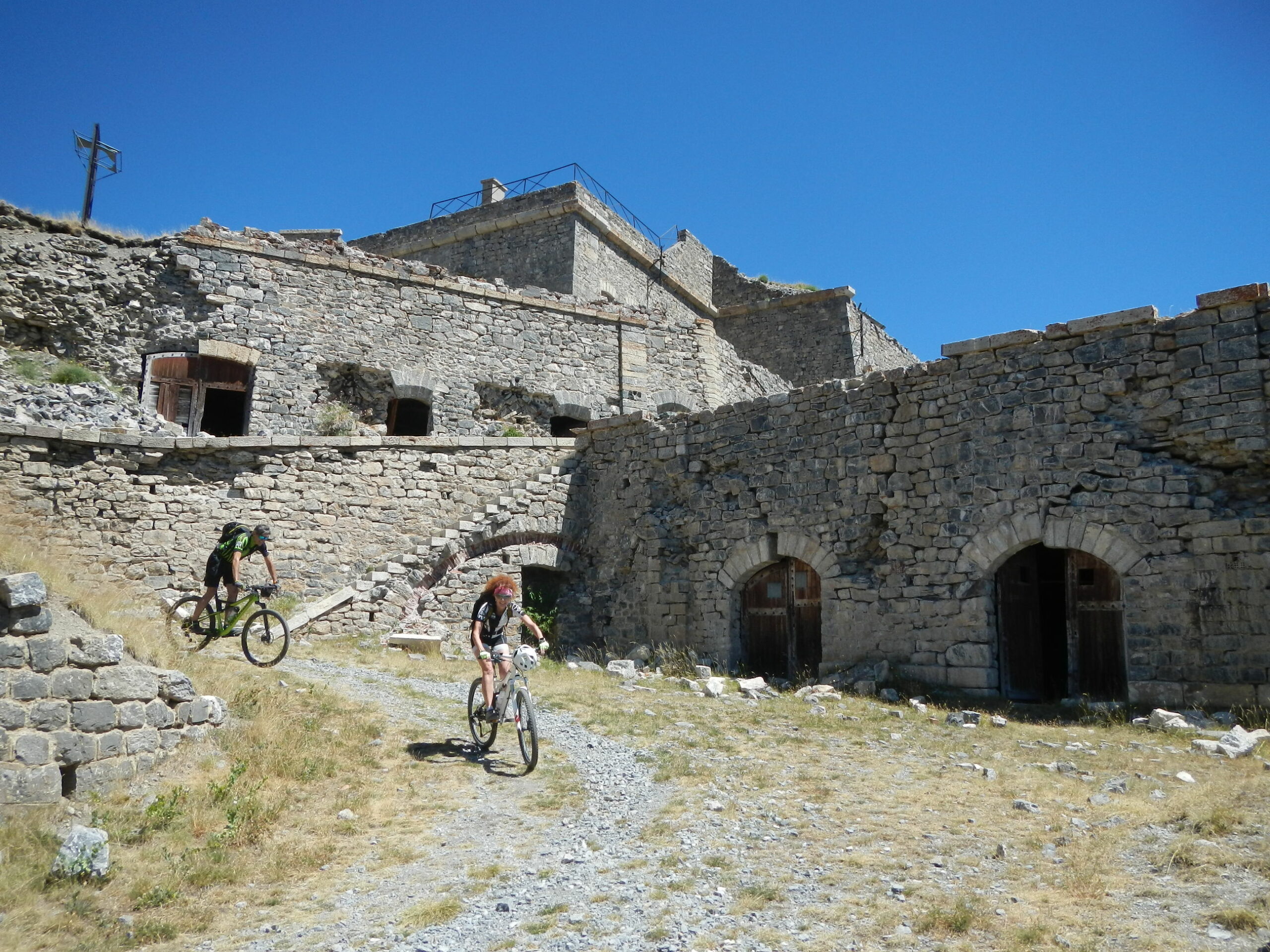 Dal piazzale del Fort du Gondrand si torna indietro per qualche centinaio di metri e si imbocca sulla sinistra uno sterrato in discesa che procede in direzione Est sullo spartiacque tra il versante di Cervieres e quello di Monginevro. Dopo un paio di Km si giunge al piccolo Lac de Sagne Enfonza (2315 m). Qui si imbocca sulla destra un bellissimo sentiero che scende tra i prati, costeggia sulla destra il bellissimo Lac des Sarailles e, dopo un breve tratto difficilmente ciclabile (100 m lineari circa), arriva ad un incrocio (quota 2200 m). Qui si prosegue dritto seguendo sempre le indicazioni per Cervieres. Il sentiero è sempre ampio e ben evidente e ciclabile praticamente al 100%, e termina a La Chau (1900 m circa), dove si raggiunge la strada che percorre il Vallone di Les Fonts. Si svolta a destra e in circa 5 Km di veloce discesa, in gran parte su sterrato, si ritorna a Cervieres.