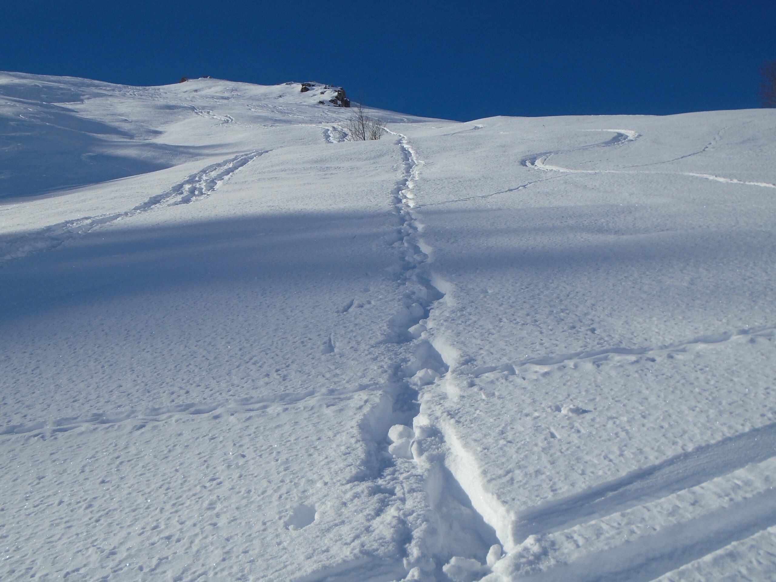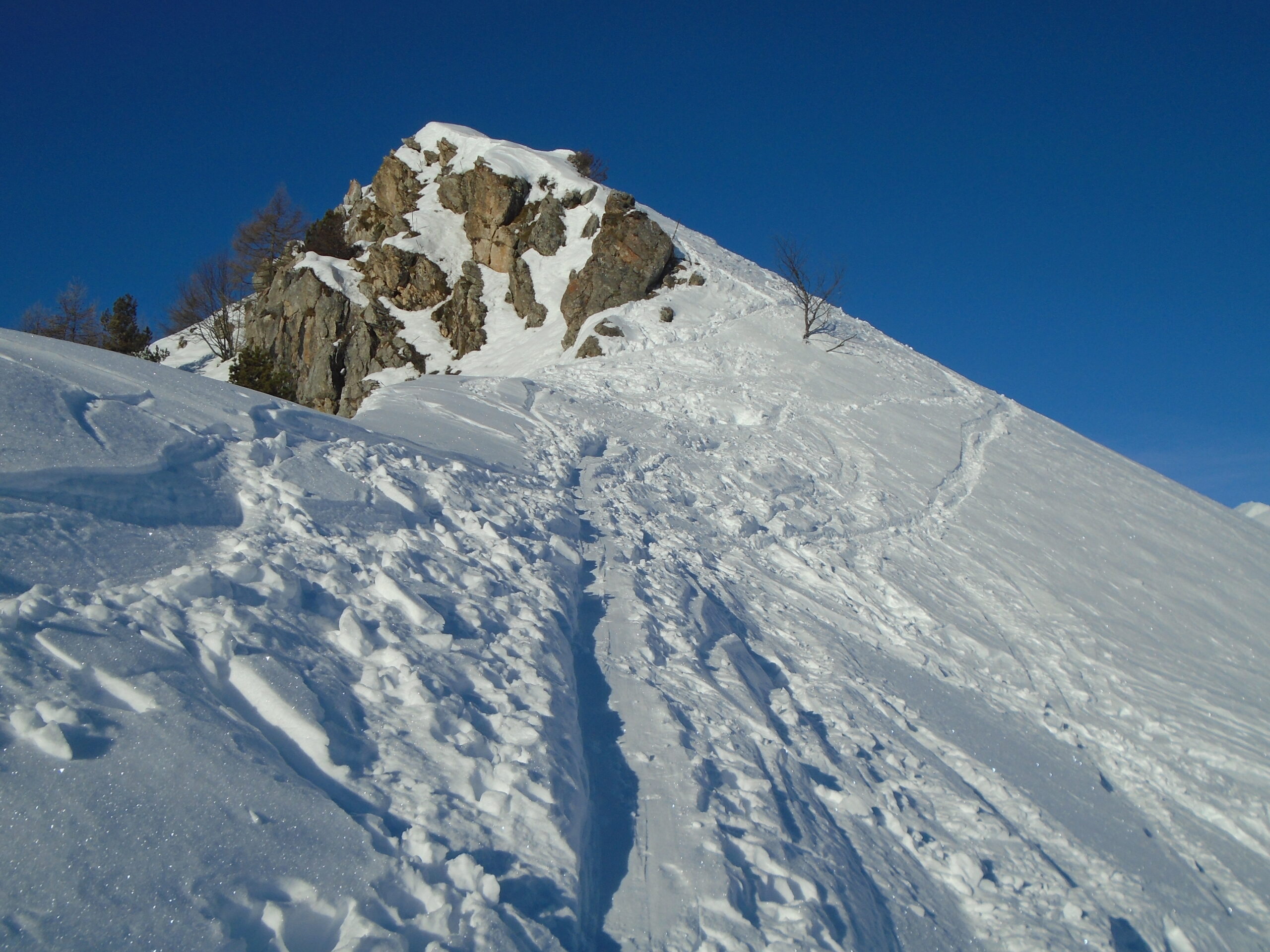 della comba inizia una bella traccia che contorna strettamente il bosco fino all’uscita in cresta e la percorre tutta, su neve abbondante, fino al panettone sommitale. Quindi agevolmente in vetta su traccia al dritto, credo della coppia di giovani scialpinisti velocissimi incontrati alla partenza da S.Giacomo (grazie!).