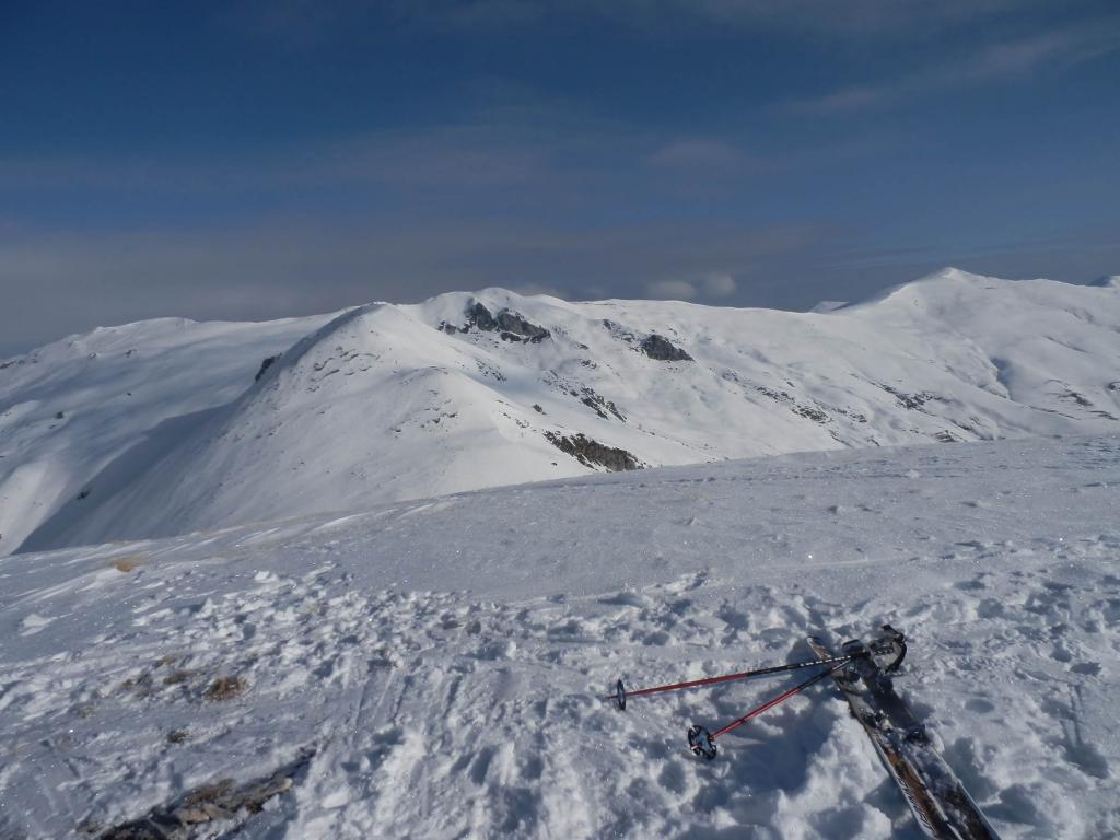 Dalla passerella di ferro in poi, la neve era prevalentemente polverosa, con un pò di crosta sulla sommità. Sono salito si buona traccia dal colletto della Pera Puntua;per un breve tratto poco dopo la Pera Puntua ho dovuto togliere gli sci perchè si toccavano gli sfasciumi di pietre. Sono sceso sul’ampia dorsale Est e poi giù nel pendio NE immerso nella polvere.Stradina velocissima.Mentre scendevo,circa 20 persone salivano al Gorfi.