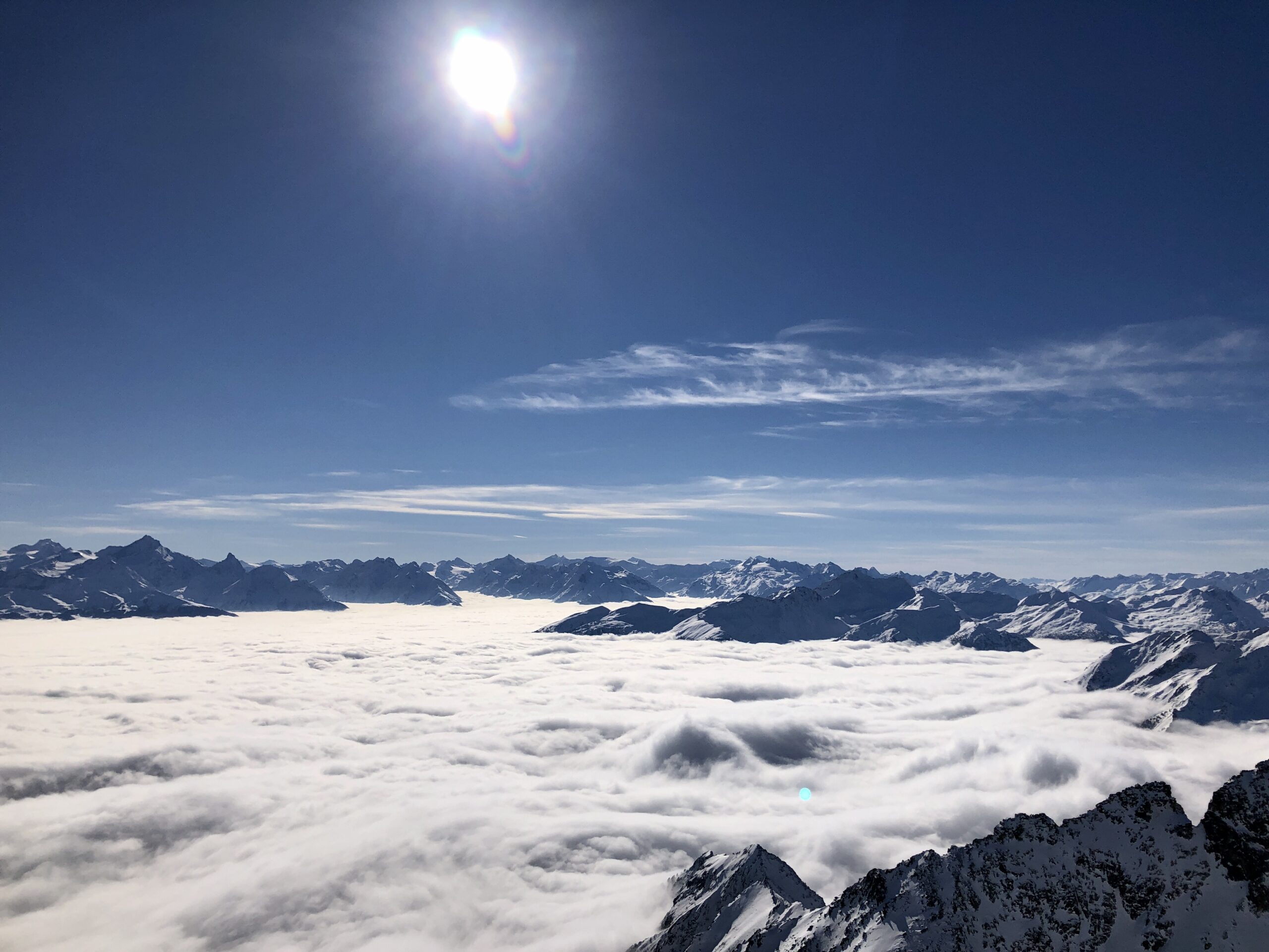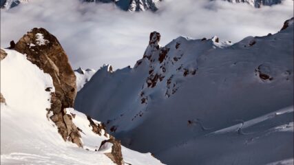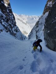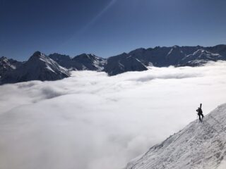 Usciamo dal canalone e finalmente buchiamo le nuvole e siamo avvolti da sole e caldo. Ricambiamo di assetto e iniziamo a pellare puntando il terzo conoide per l’accesso al nostro canale completamente all’ombra ovviamente. Da caldo, a freddo in un attimo. Le bollite ormai, sono il mood della giornata. Tracciamo il canale, dandoci il cambio, e dopo 500 metri usciamo, dirigendoci verso la selletta nevosa sotto la vetta del Gorret. Con un sole tiepido che ci scalda e il mare nubi sotto di noi, ti saluto nasone. Amico e compagno di scorribande su per i monti. Te ne sai andato facendo quello che amavi. Questo canale lo dedichiamo a te “la zampata del Leopardo”.