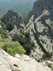 - L6 50mt, 6a: sosta su piccola cengia 2 spit