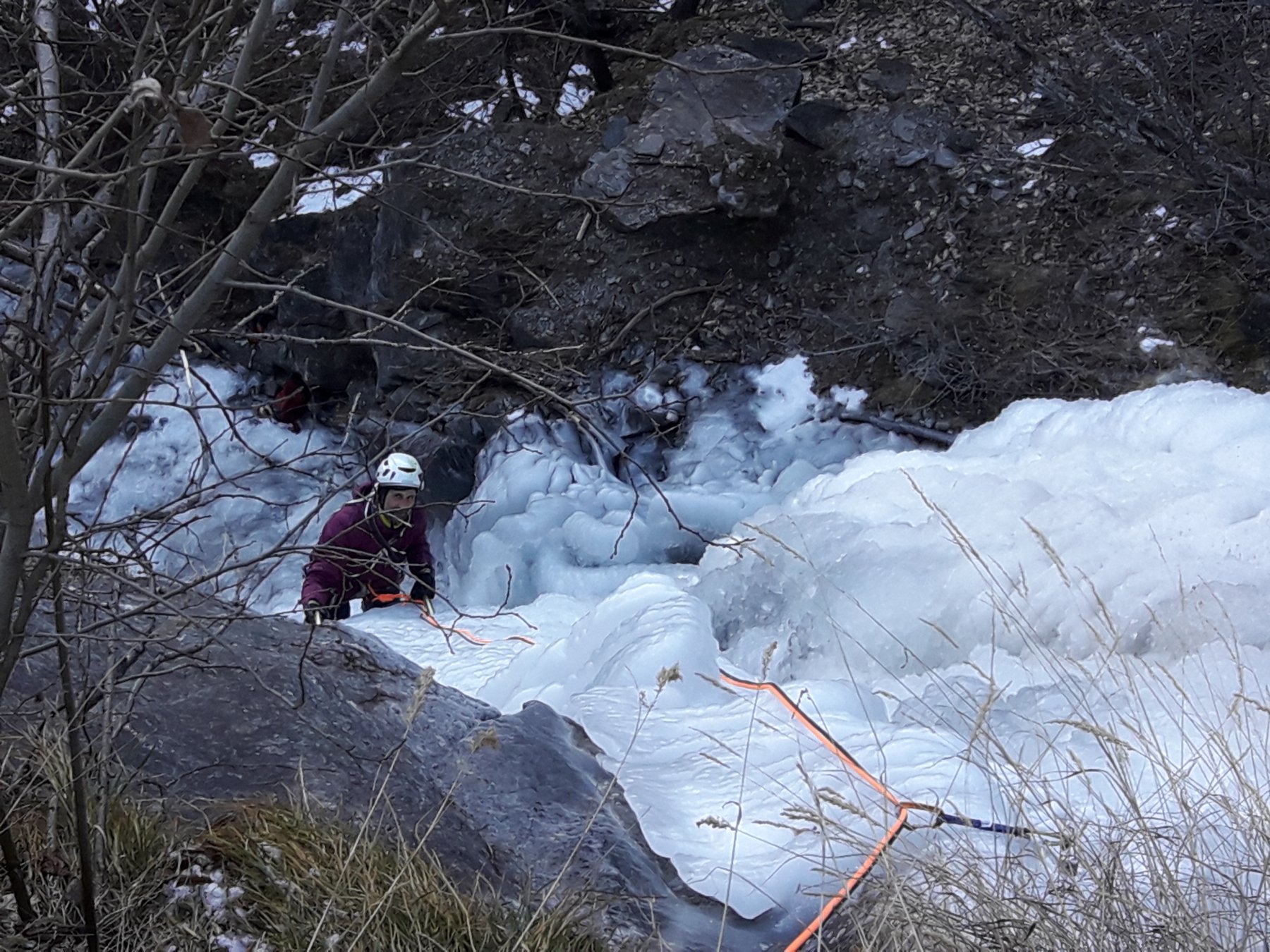 I primi tiri sono abbastanza omogenei( 60°, 70° per circa 5 tiri).Dopo una cengia erbosa salire gli ultimi due salti verticali. il torrente successivamente diventa pianeggiante.