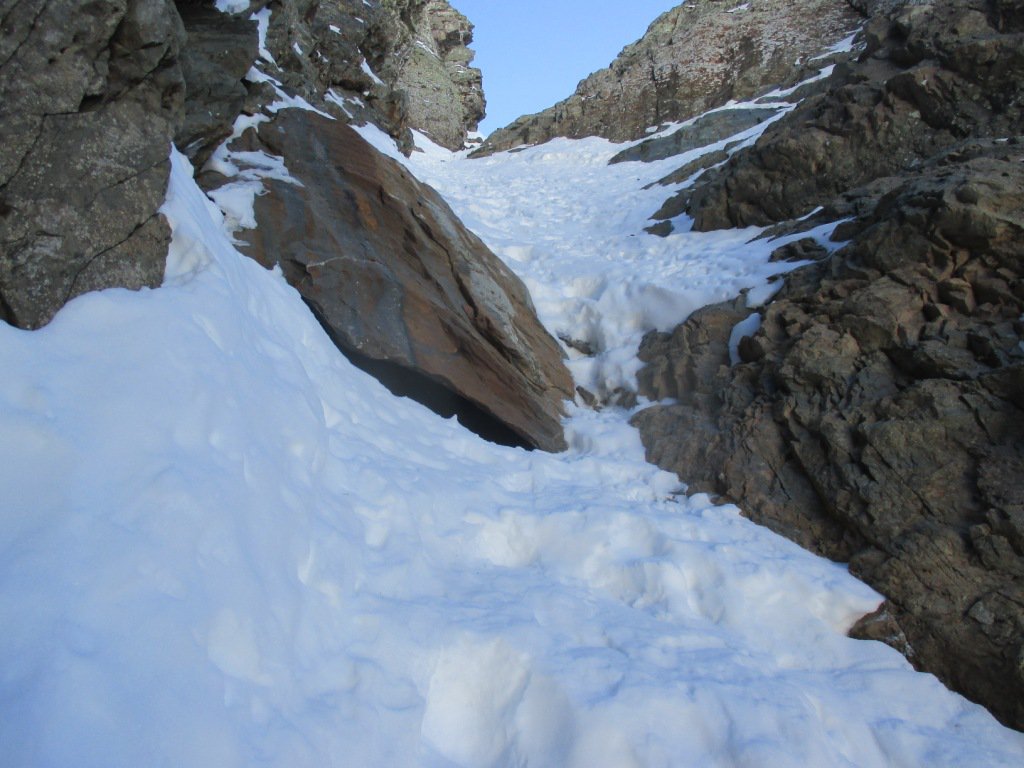 il canale comincia a strinersi, diviene molto tracciato, traccia a tratti ben compattata ma non gelata…e poco dopo si incontra un saltino roccioso con una placchetta da superare, non proprio banale..poi solo neve, fino all’uscita in cresta..con bella cornice..