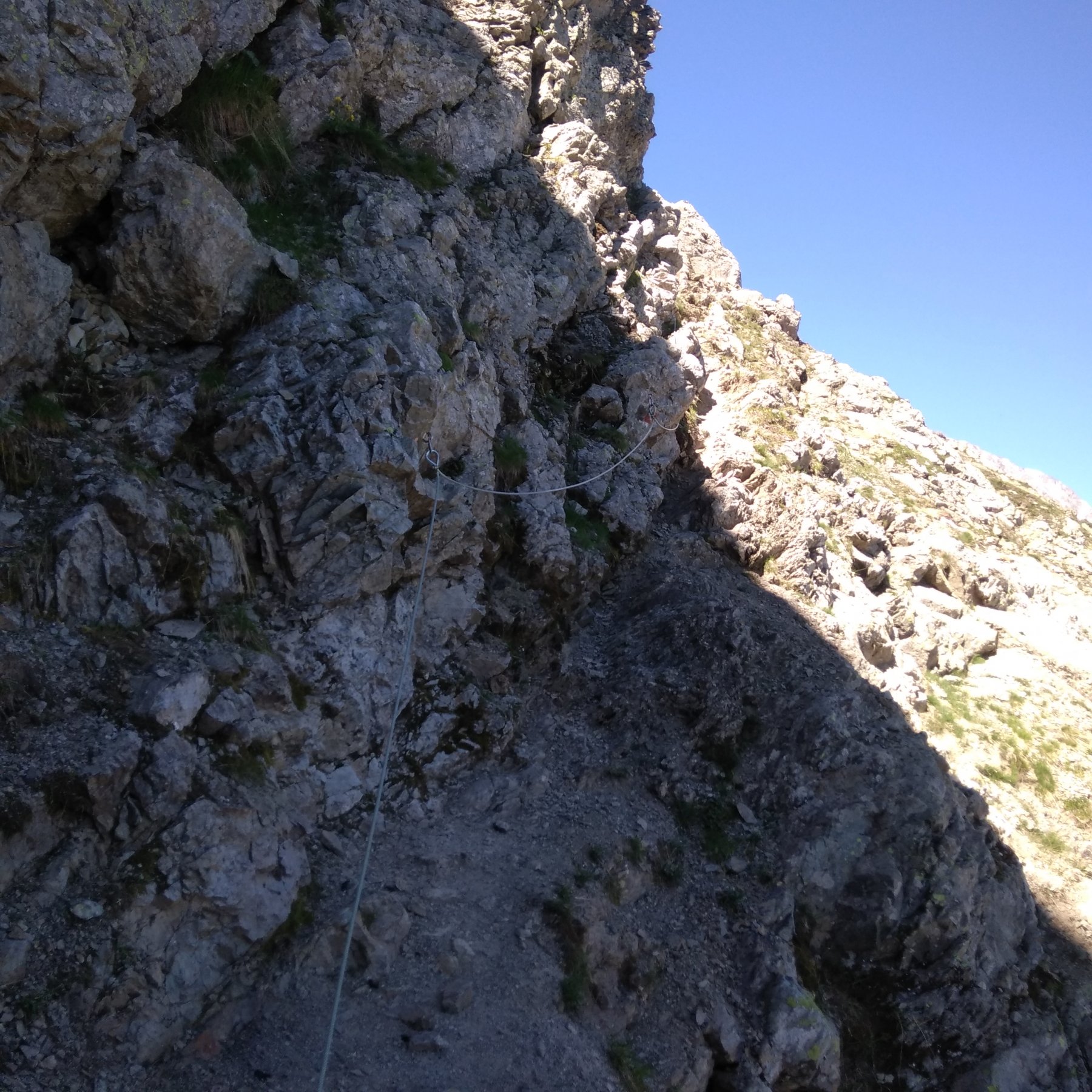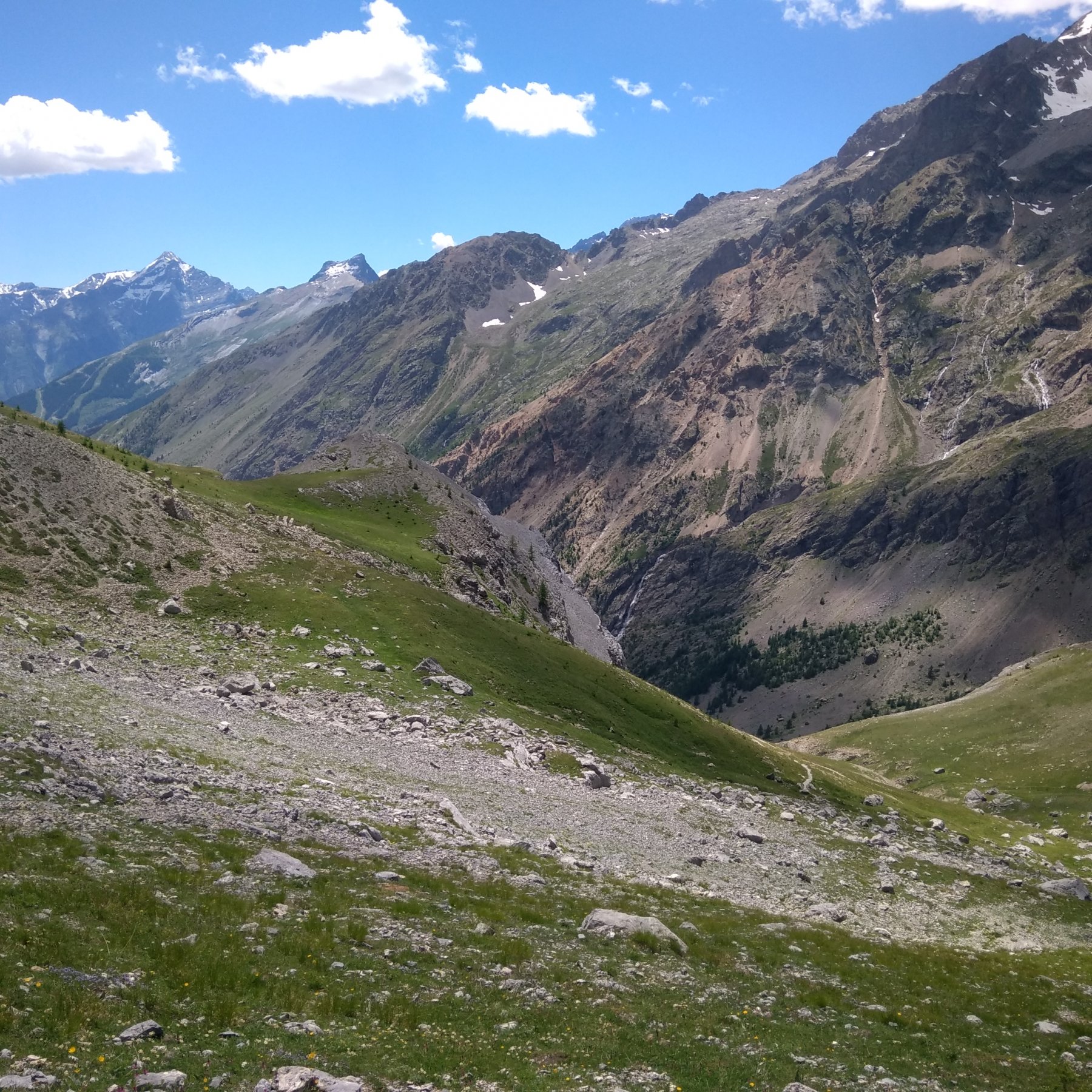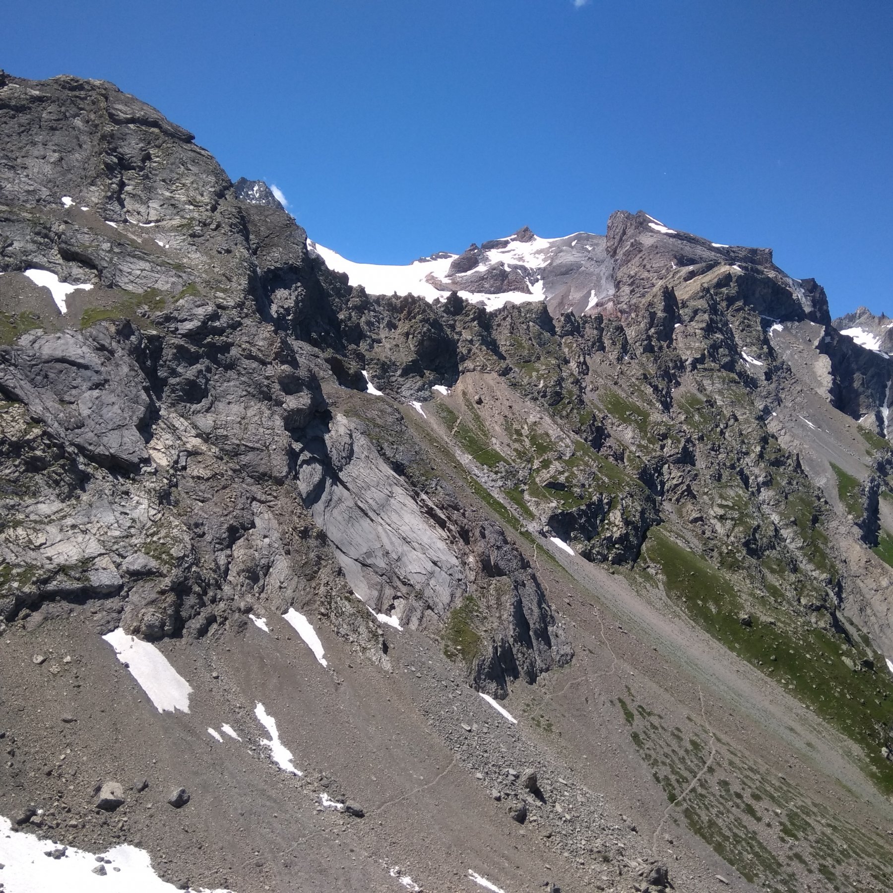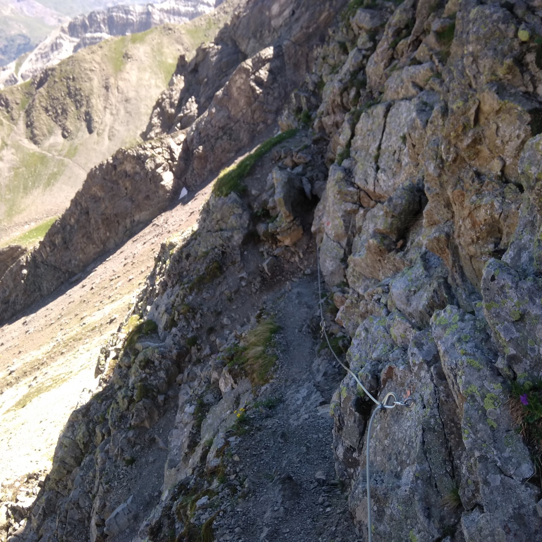 In esplorazione degli Ecrins conosciuti ben poco dal sottoscritto aparte qualche grande classica… pensavo addirittura di trovare neve nell’ultima parte invece addirittura trovo pulita la discesa sul versante Nord-Est del col de Grangettes, al che, dopo rapida consultazione della cartina ,non mi faccio scappare l’anello. Dal colle si può tranquillamente scendere, magari anche disarrampicando utilizzando le rocce ed evitando il cavo (giusto per dare un ottica delle difficoltà con “occhio” escursionistico e assolutamente non alpinistico,) tuttavia per chi patisce questo tipo di terreni sdrucciolevoli consiglio di percorrere il tratto in salita, come fanno tutti… se invece se si è in cerca di facile difficoltà: no problem.
