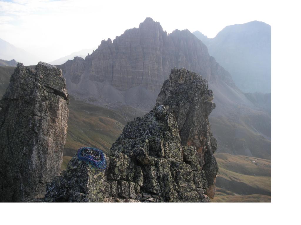 Dal colletto aggirare ora il torrione 4 abbassandosi nel canale SO di qualche metro, risalire quindi sulla dx il camino verticale che adduce al colletto fra i torrioni 3 e 4. Da qui per salire al torrione 3 aggirare la cresta sul lato N (esposto) quindi tornare sul lato sud e proseguire per ripide rocce gradinate. Sosta in cima (cordoni su spuntone) per una doppia di 25 m. Per salire il torrione 4 dal colletto fra questo e il torrione 3 seguire lo spigolo.
