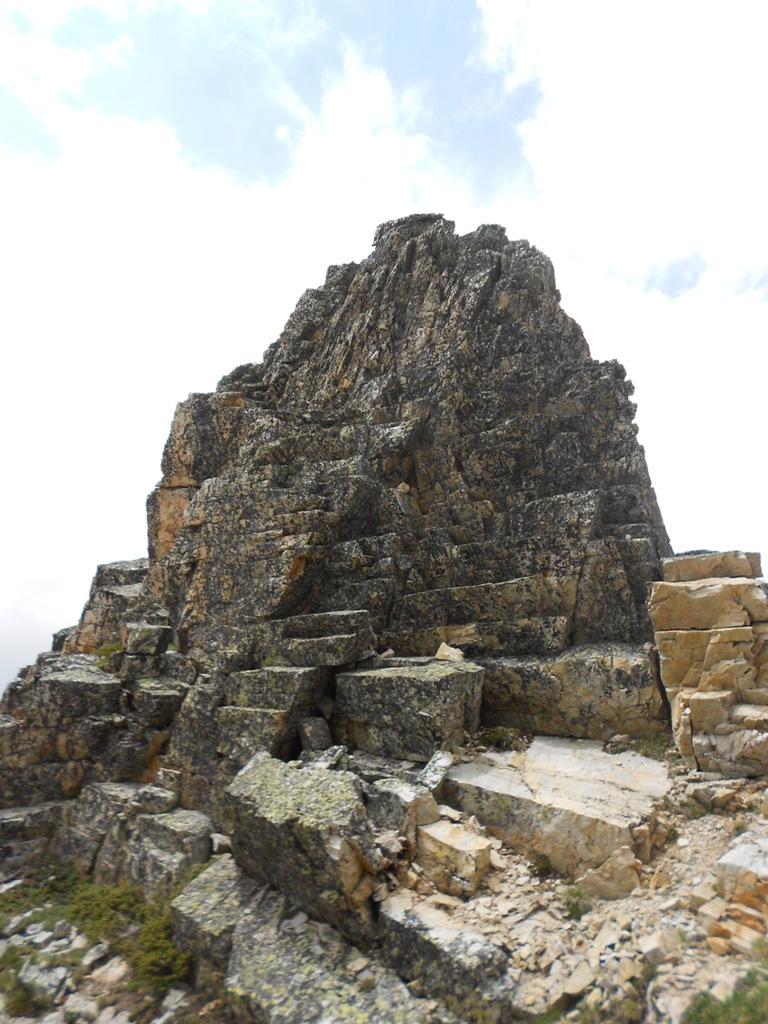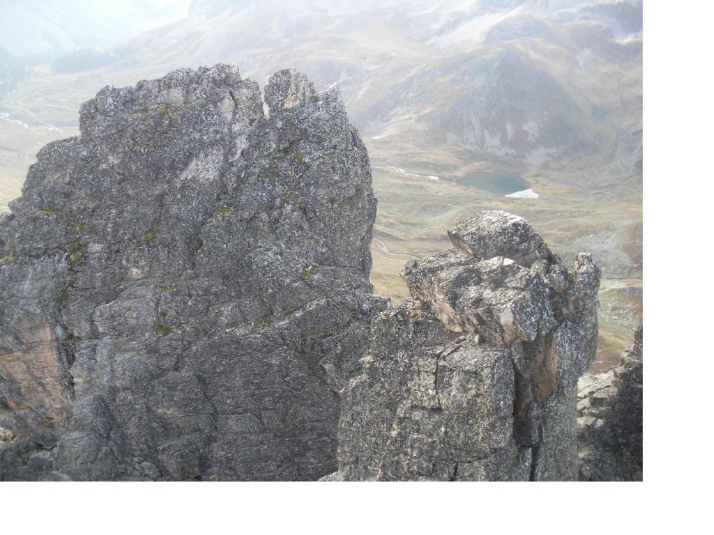 Dal colletto fra i torrioni 1 e 2 salire il torrione 1 per una fessura verticale (chiodo) e quindi per una rampa a sx della cresta. Discesa in doppia (sosta con un solo chiodo poco sotto la cima). Dallo stesso colletto salire il torrione 2 per più facili gradoni. Sosta in cima (due chiodi e cordoni) per una doppia a scendere.