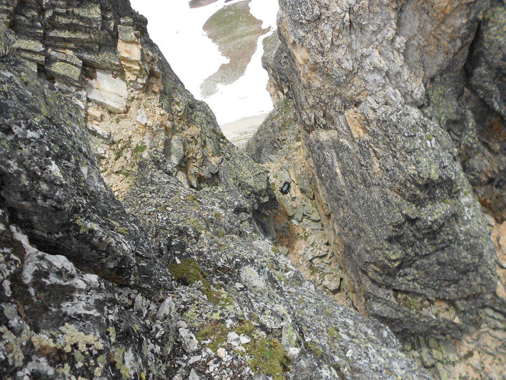 Salire un canalino franoso in mezzo alle prime roccette e portarsi al sovrastante ghiaione. Risalirlo e iniziare la salita del canale detritico adducente al colletto al centro dei torrioni con qualche passo di facili rocce. Attenzione al vetrato.