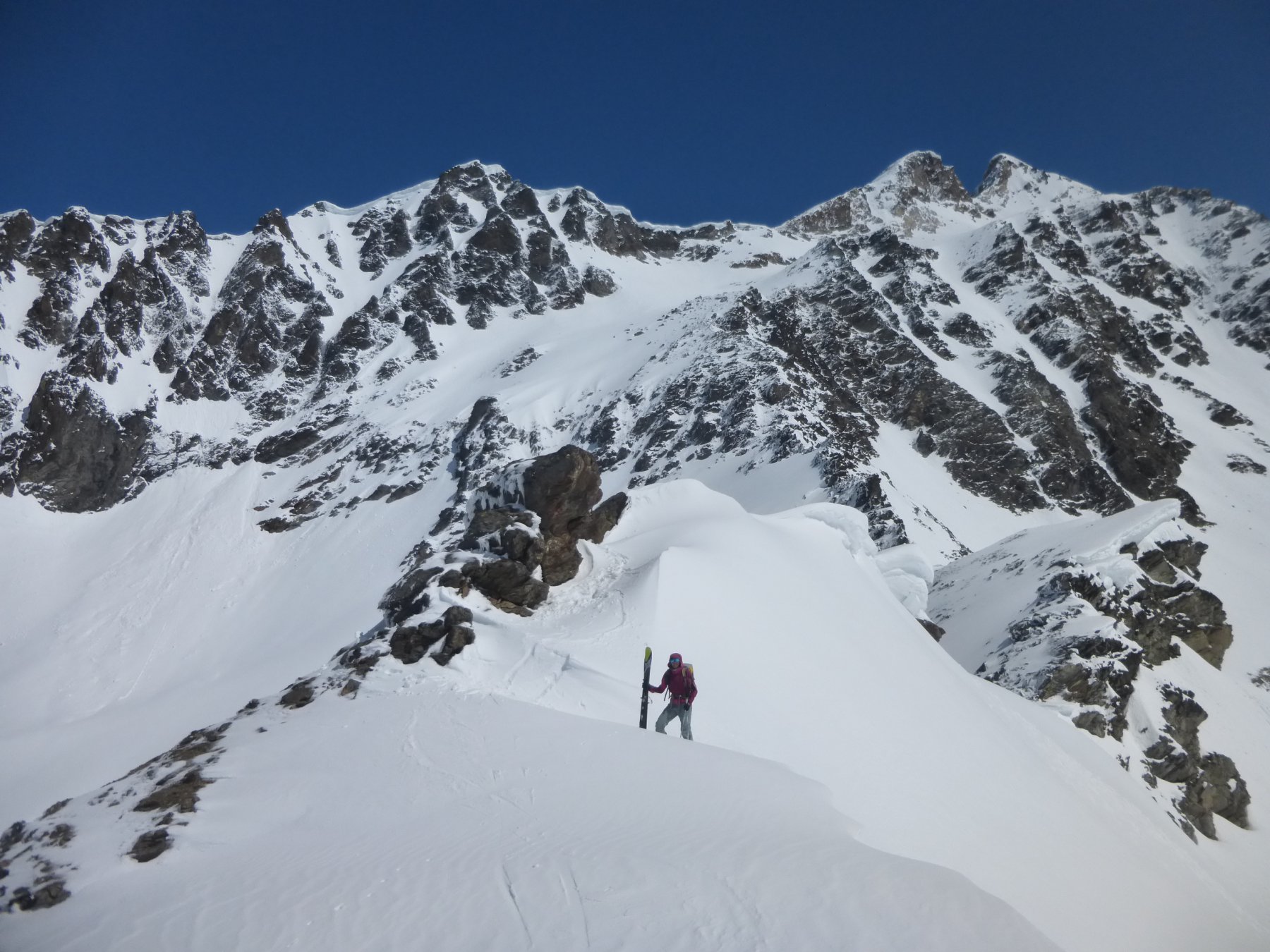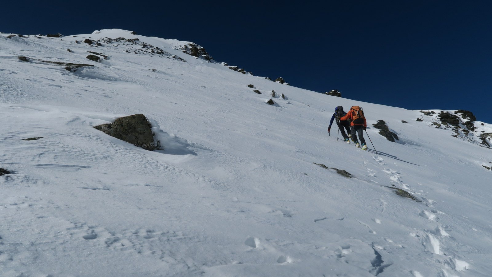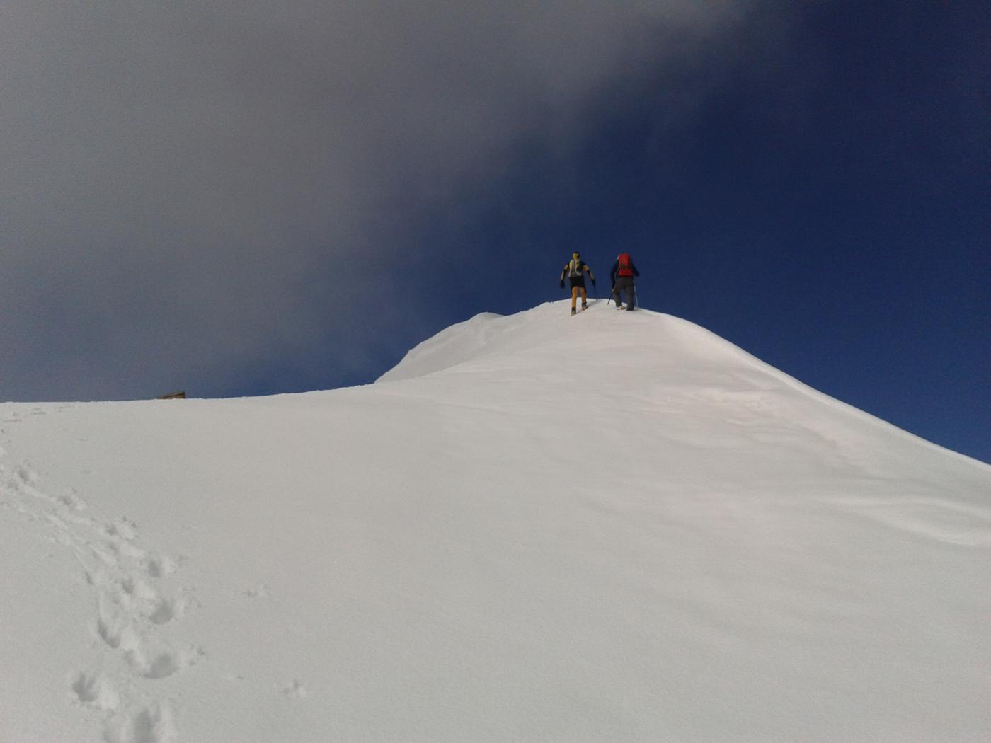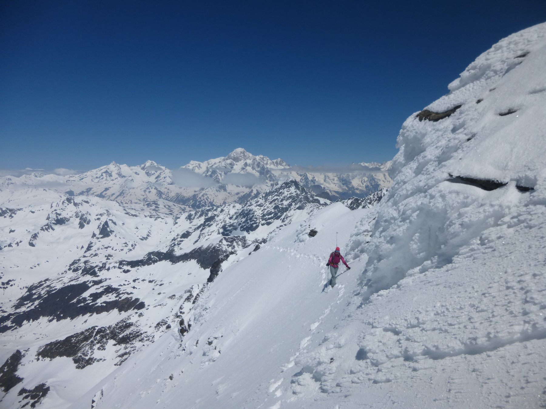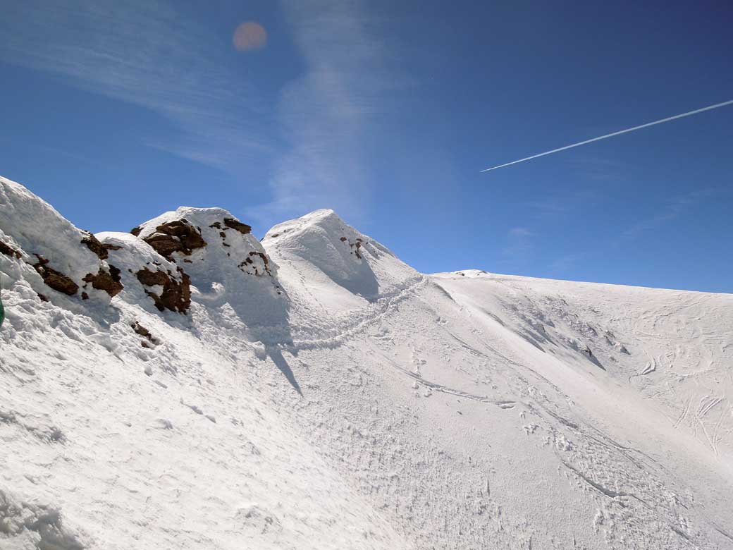 raggiungere la cresta nel punto migliore a secondo dell’innevamento; seguire poi la cresta superando alcuni tratti più’ affilati portandosi sul versante francese o italiano; infine dopo un tratto nevoso pianeggiante raggiungere la bella e panoramica vetta .