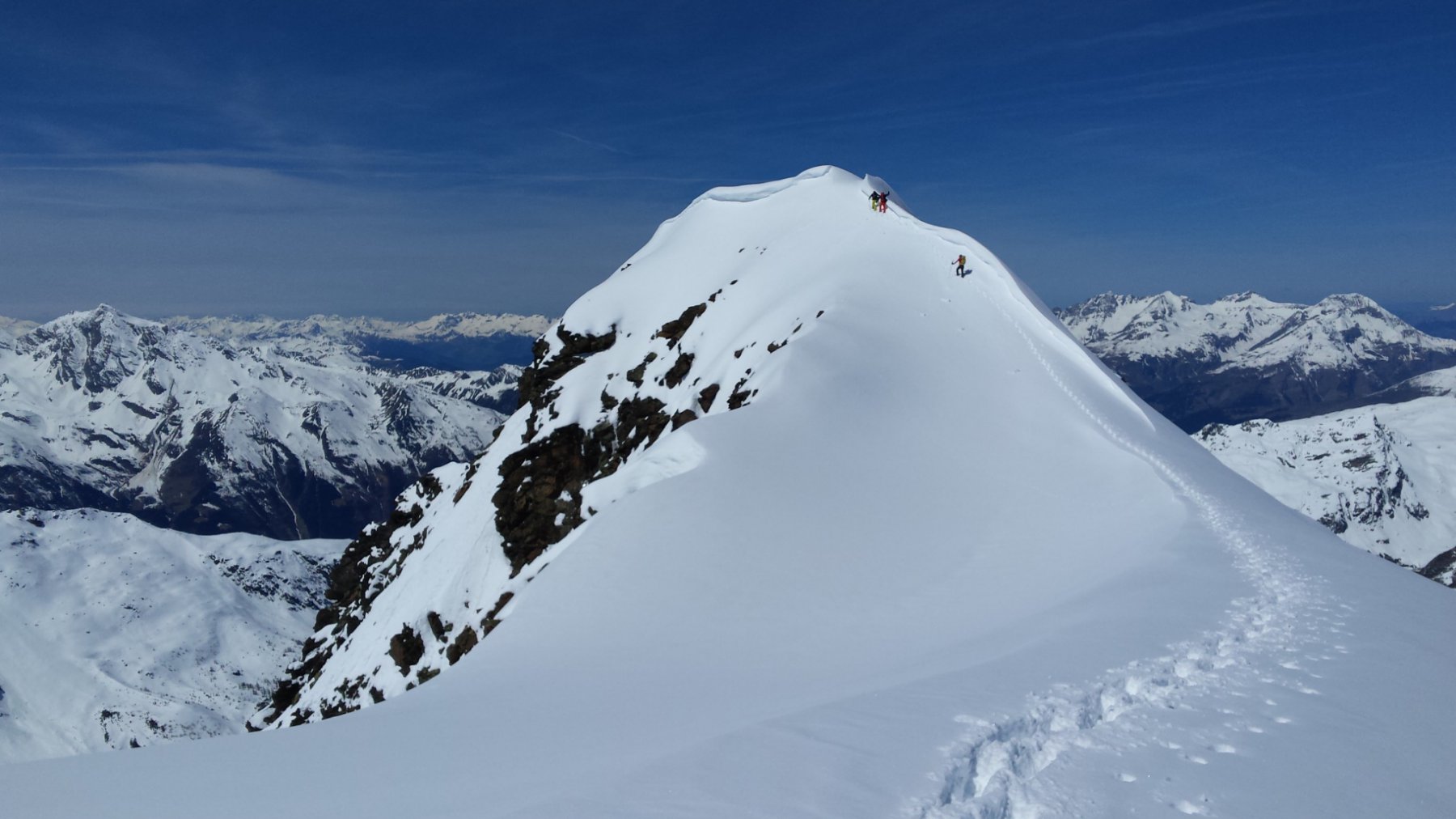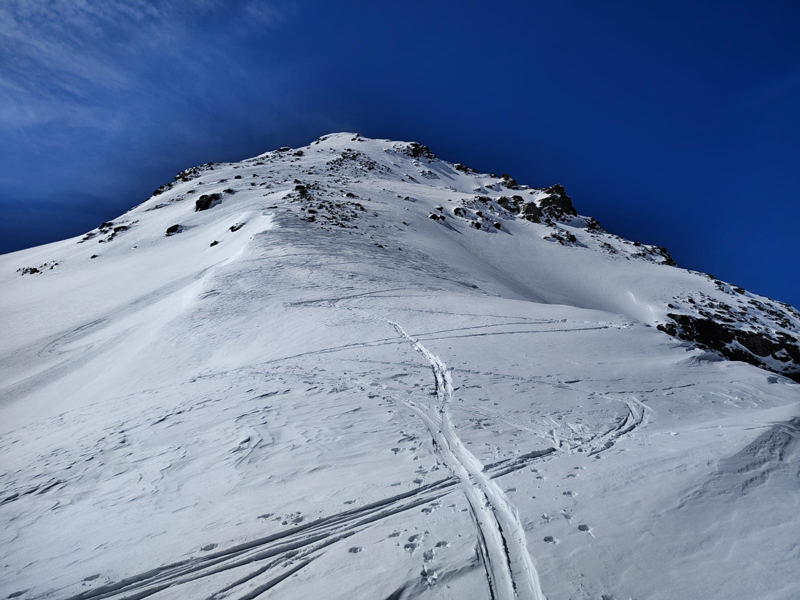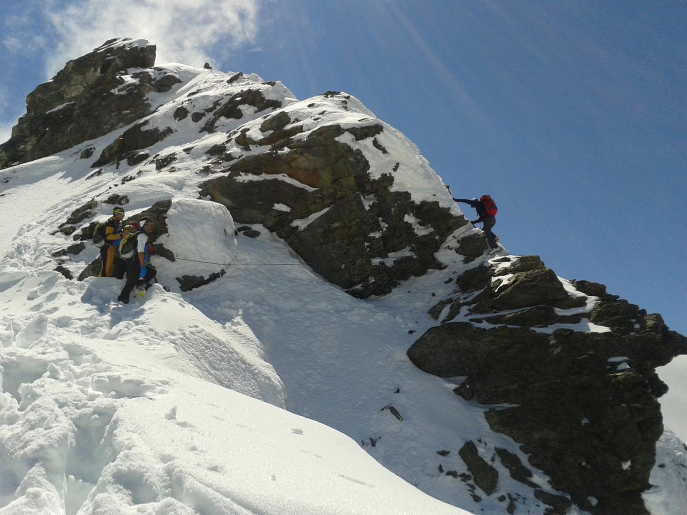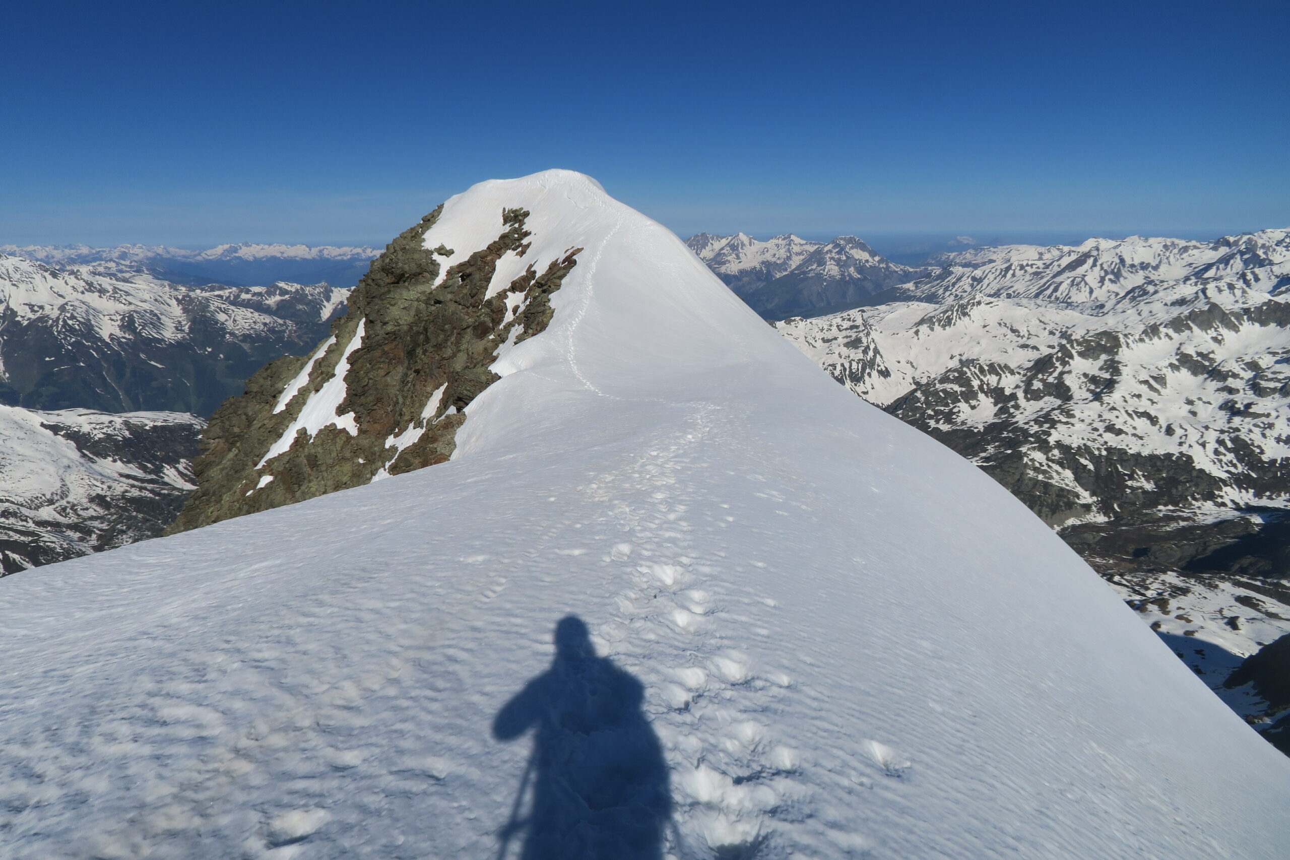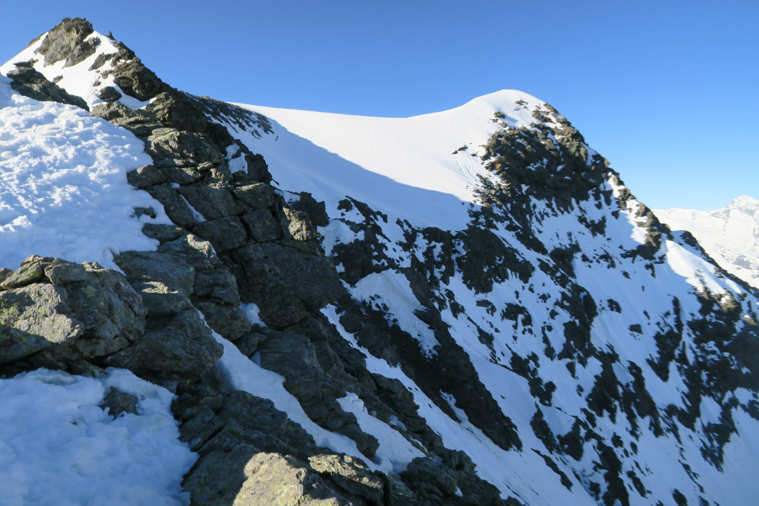 raggiungere la cresta nel punto migliore a secondo dell’innevamento; seguire poi la cresta superando alcuni tratti più’ affilati portandosi sul versante francese o italiano; infine dopo un tratto nevoso pianeggiante raggiungere la bella e panoramica vetta .