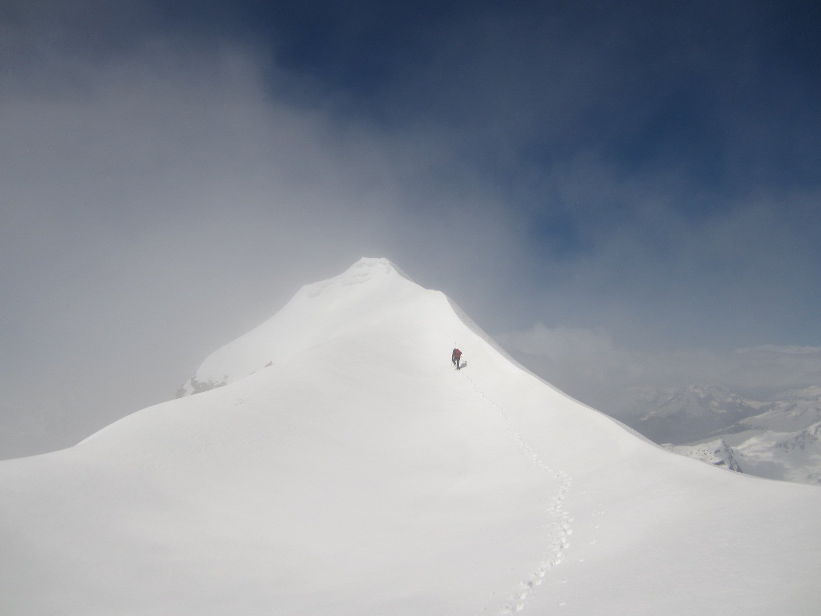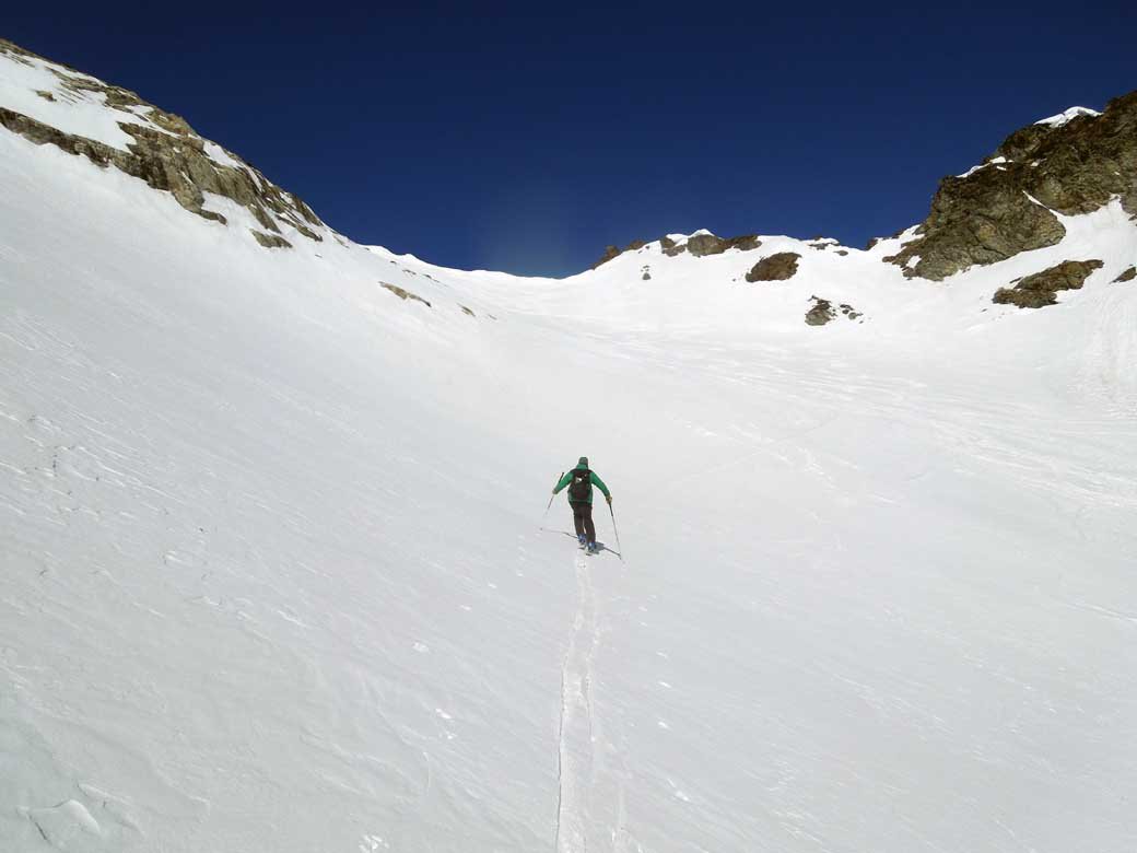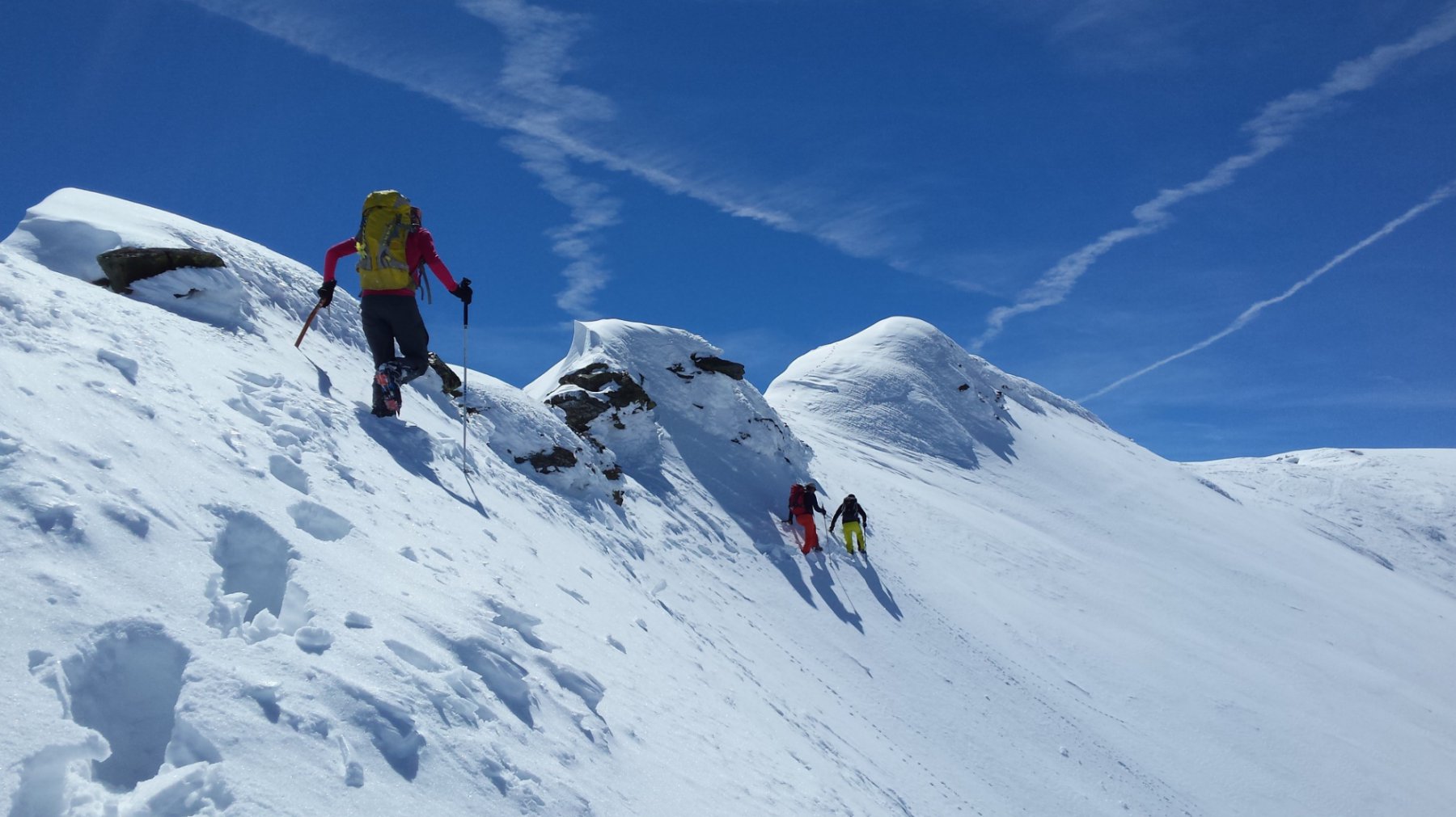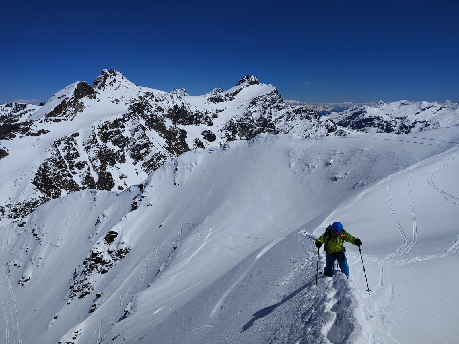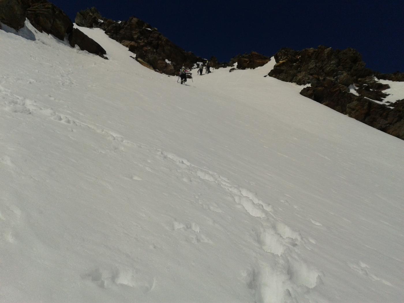 raggiungere la cresta nel punto migliore a secondo dell’innevamento; seguire poi la cresta superando alcuni tratti più’ affilati portandosi sul versante francese o italiano; infine dopo un tratto nevoso pianeggiante raggiungere la bella e panoramica vetta .