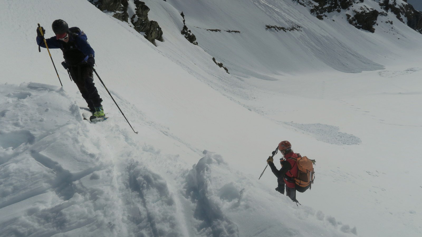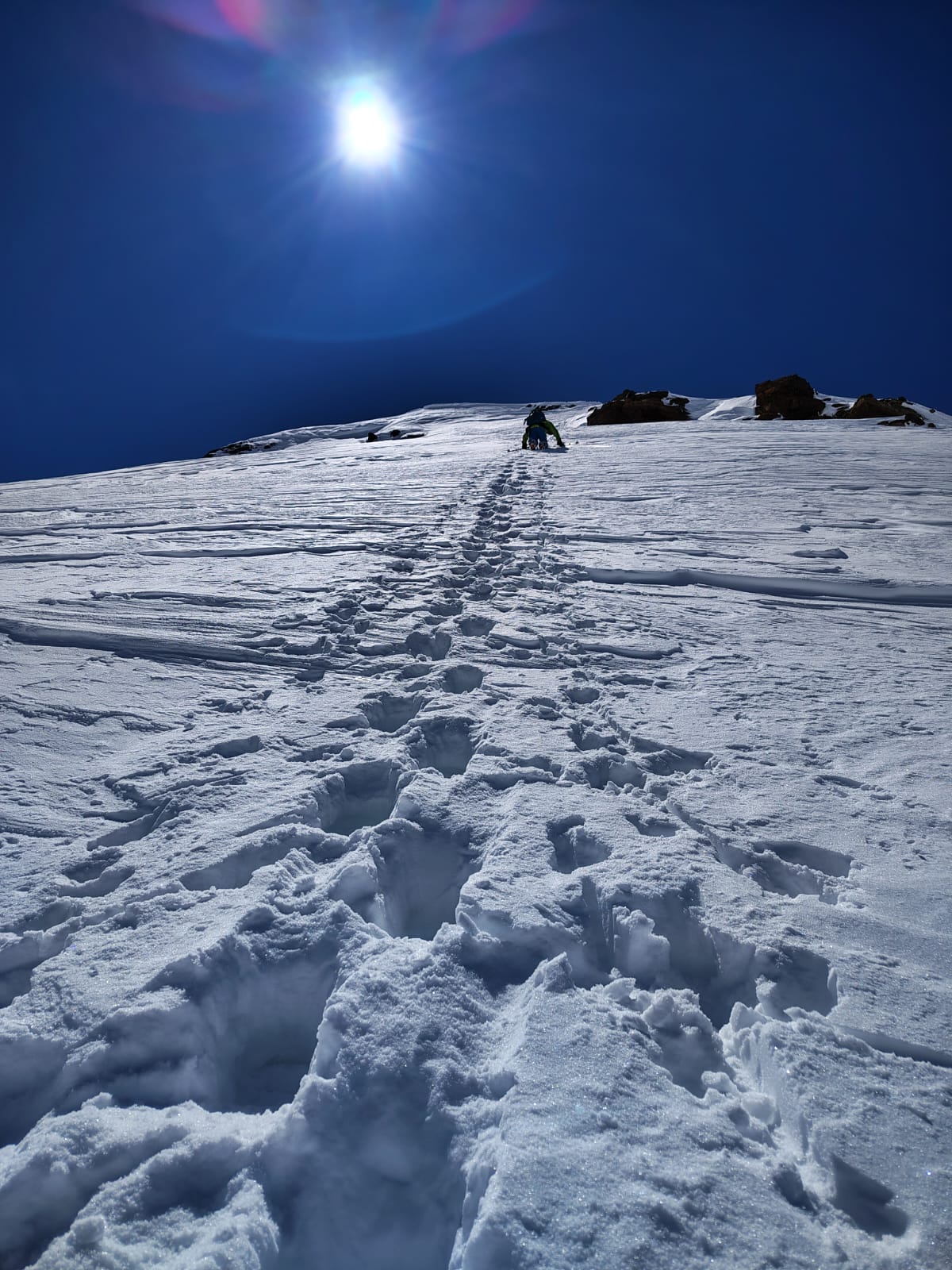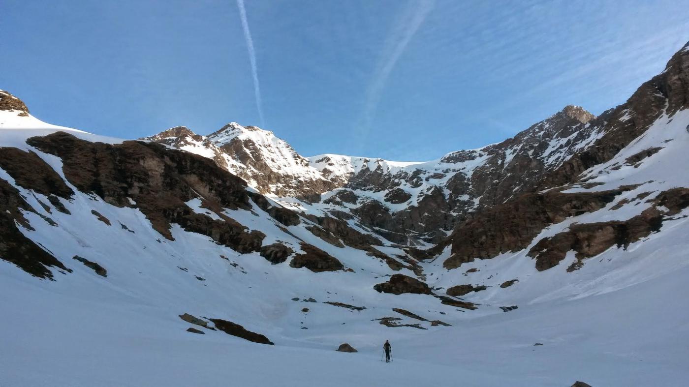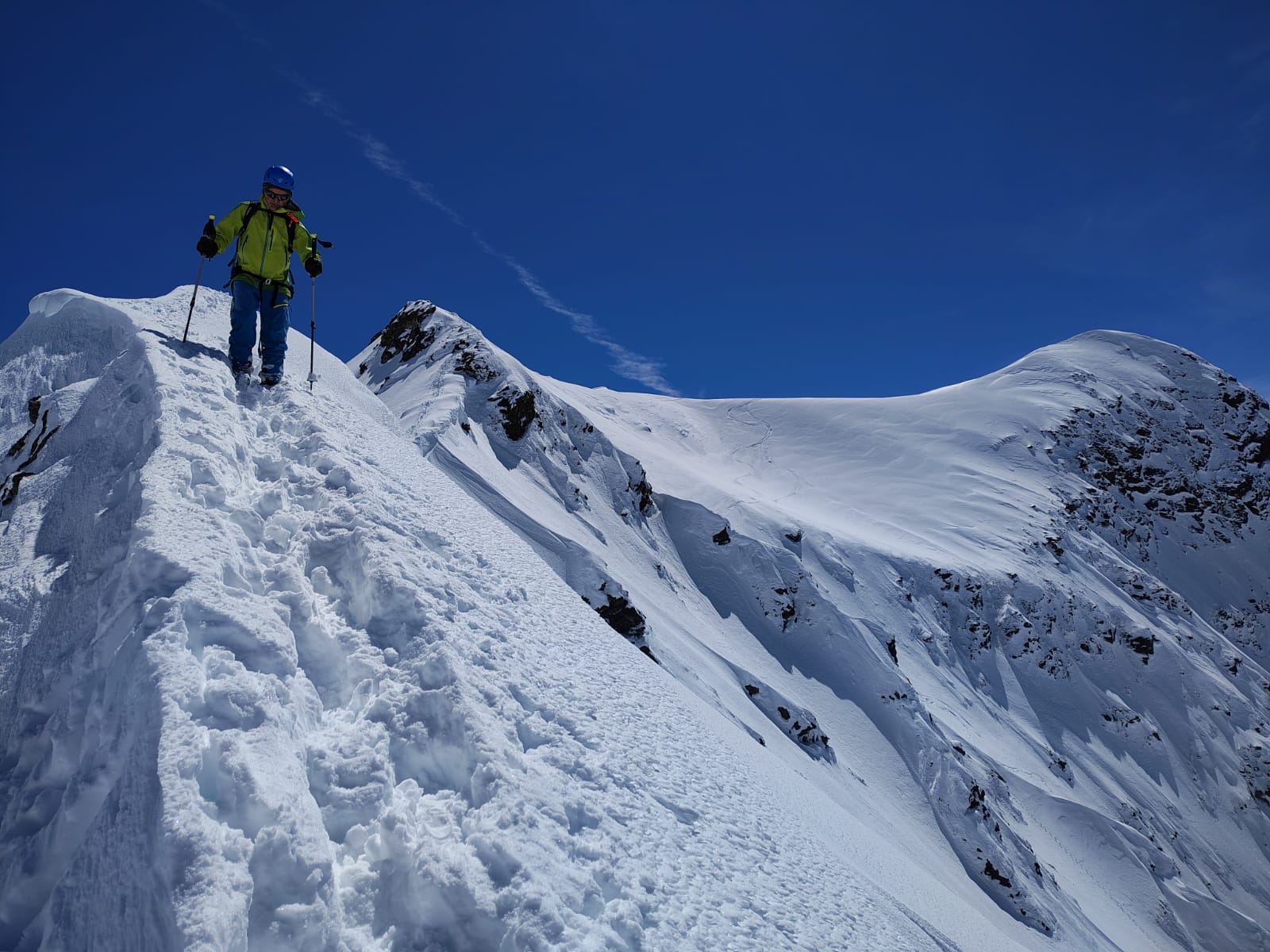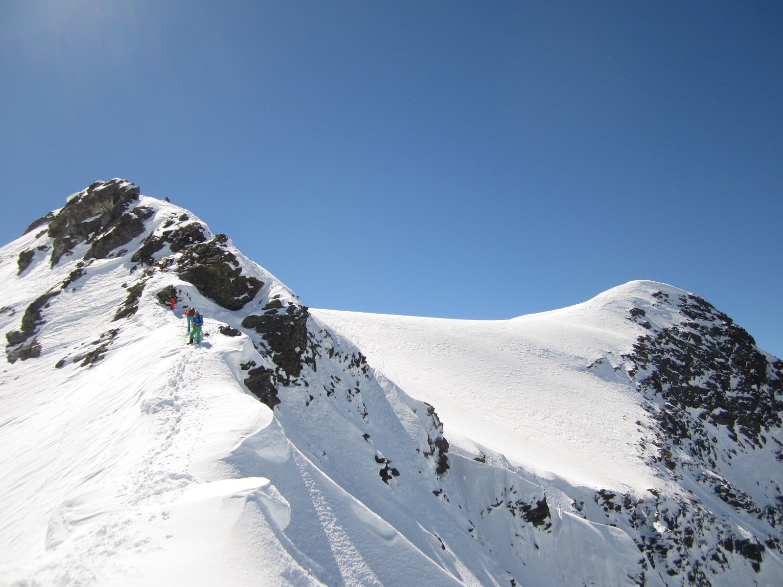 raggiungere la cresta nel punto migliore a secondo dell’innevamento; seguire poi la cresta superando alcuni tratti più’ affilati portandosi sul versante francese o italiano; infine dopo un tratto nevoso pianeggiante raggiungere la bella e panoramica vetta .