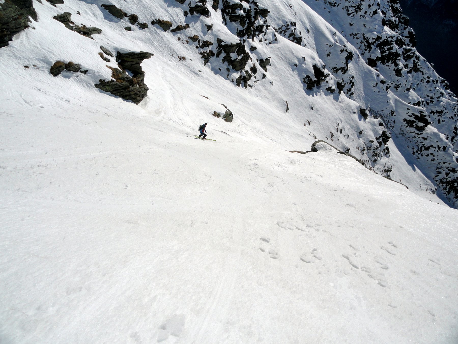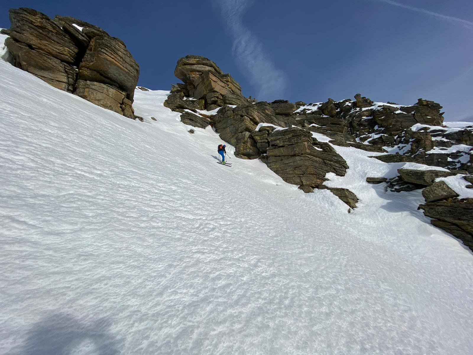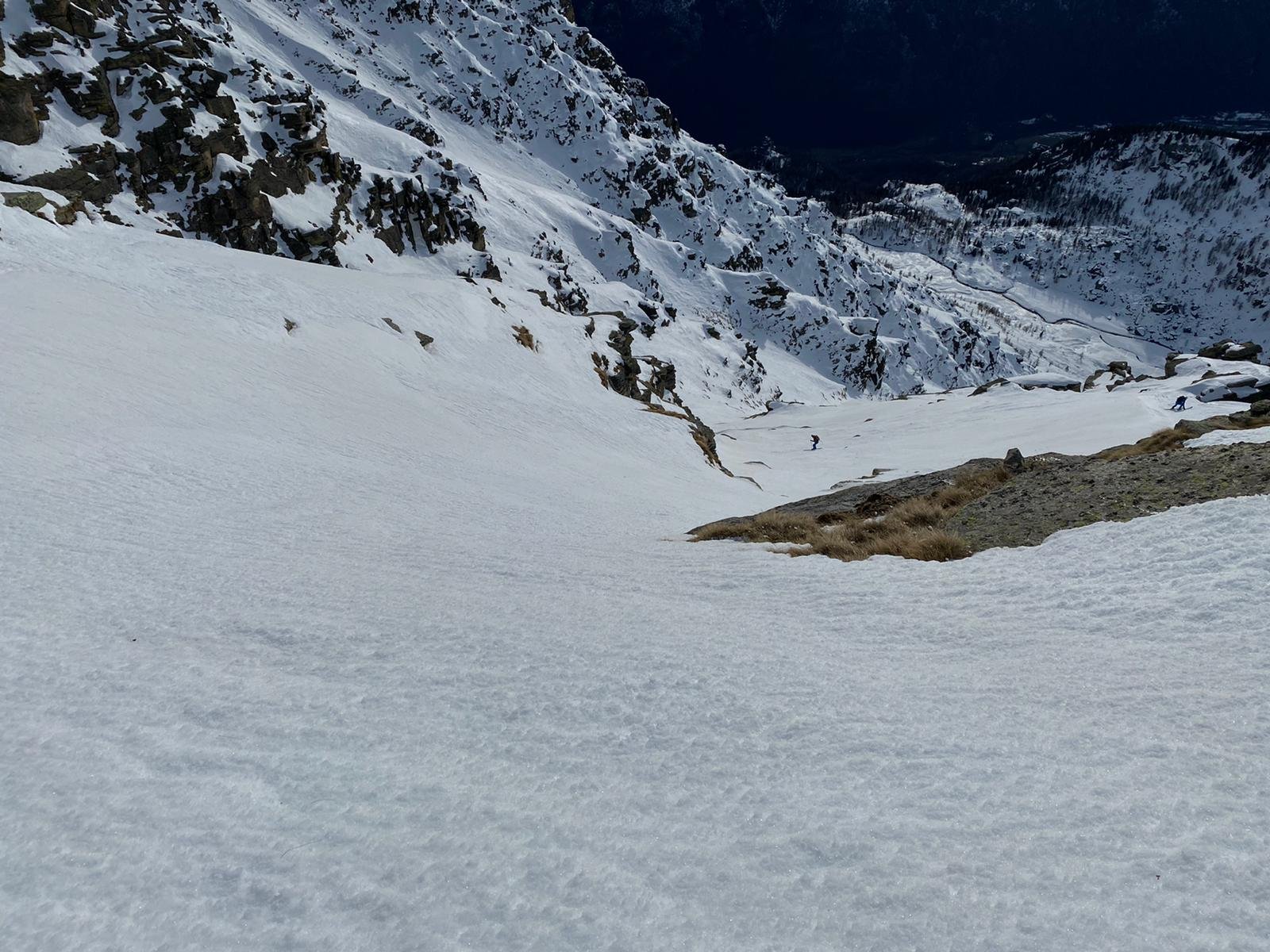 Il pendio si raddrizza man mano che si sale, l’esposizione sia nella parte alta che in quella bassa non consente grandi errori.