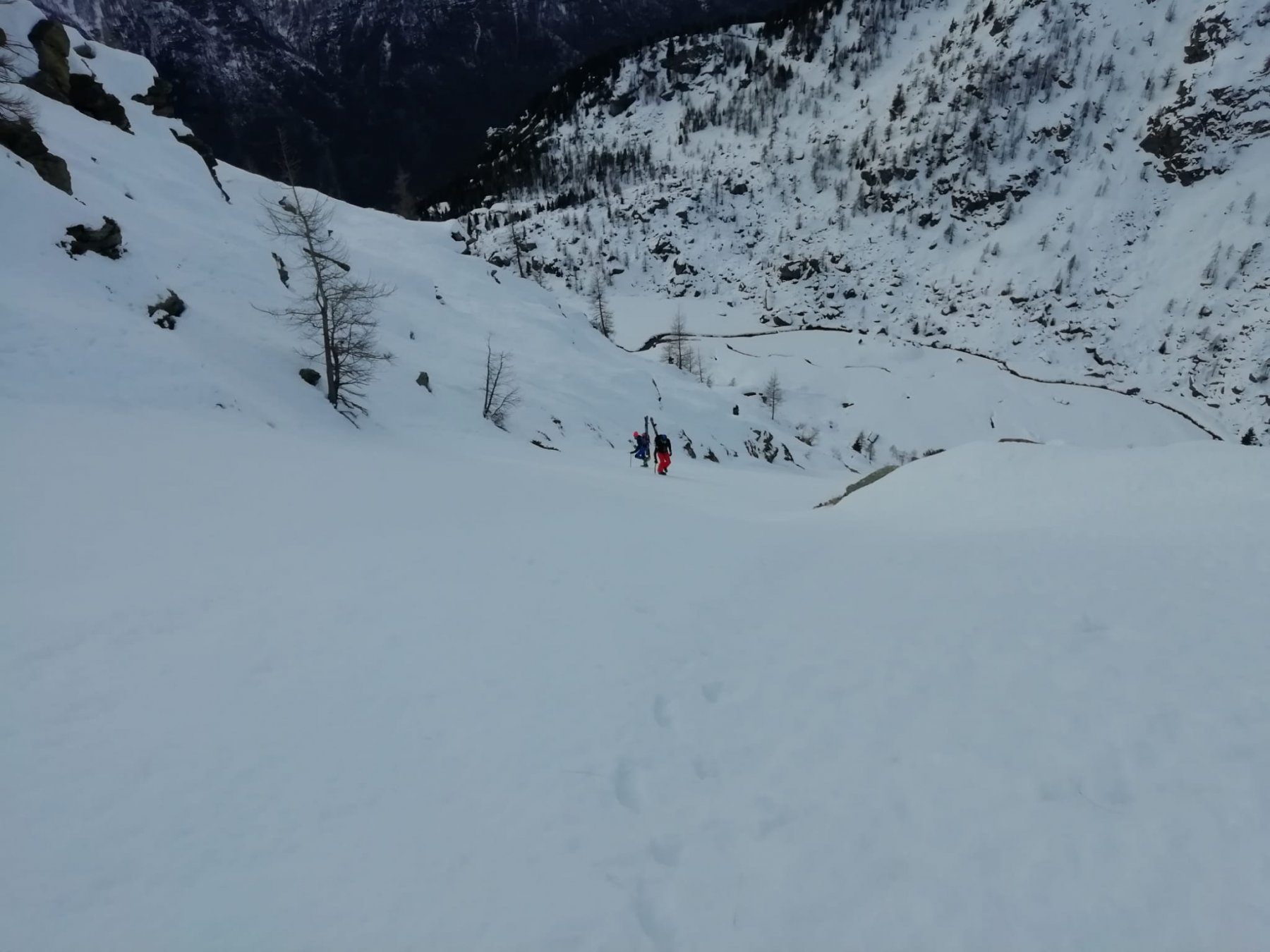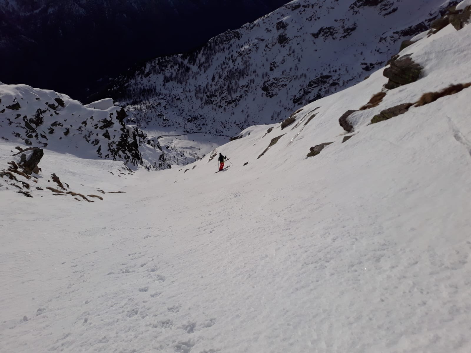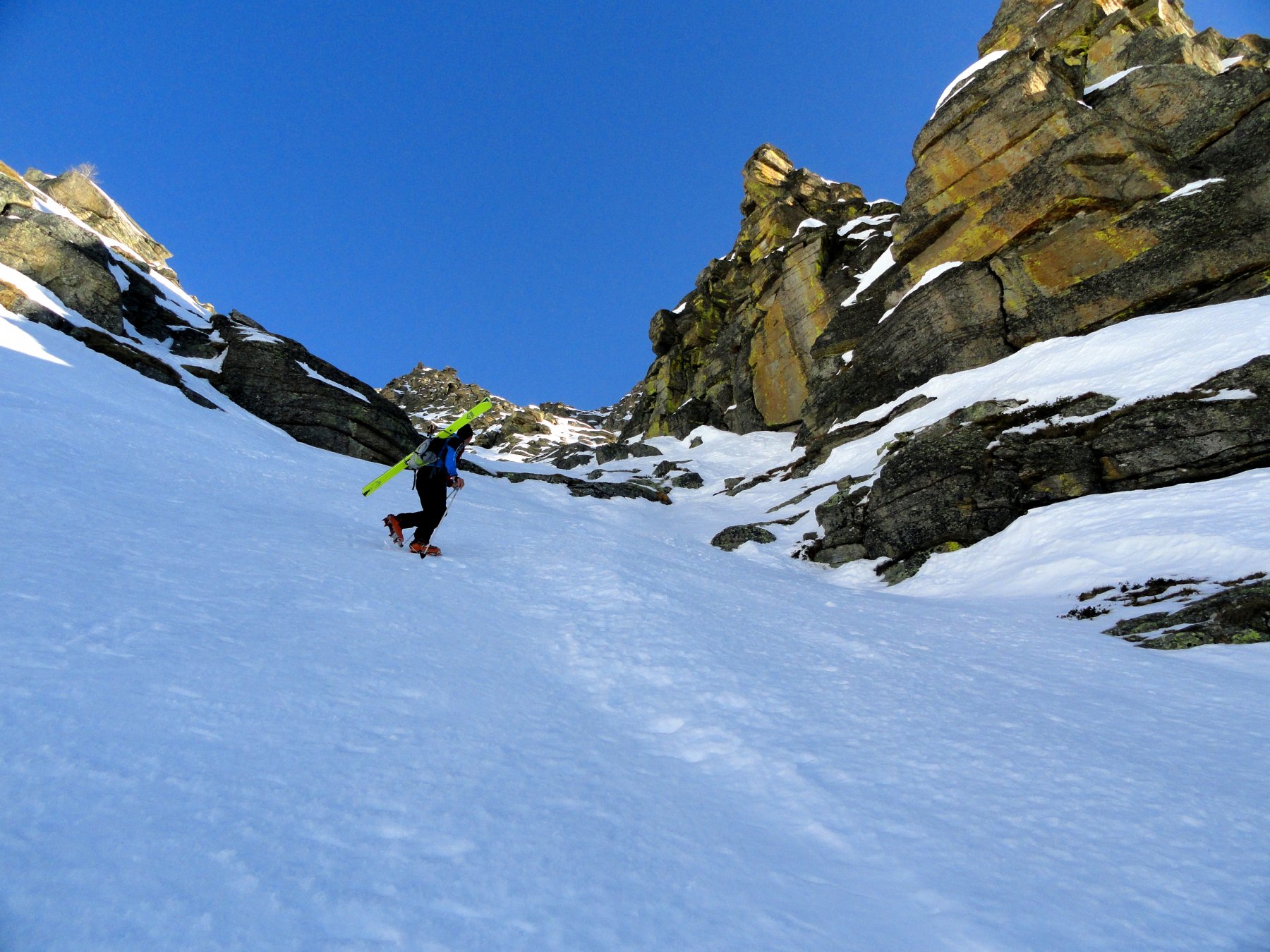 Il pendio si raddrizza man mano che si sale, l’esposizione sia nella parte alta che in quella bassa non consente grandi errori.