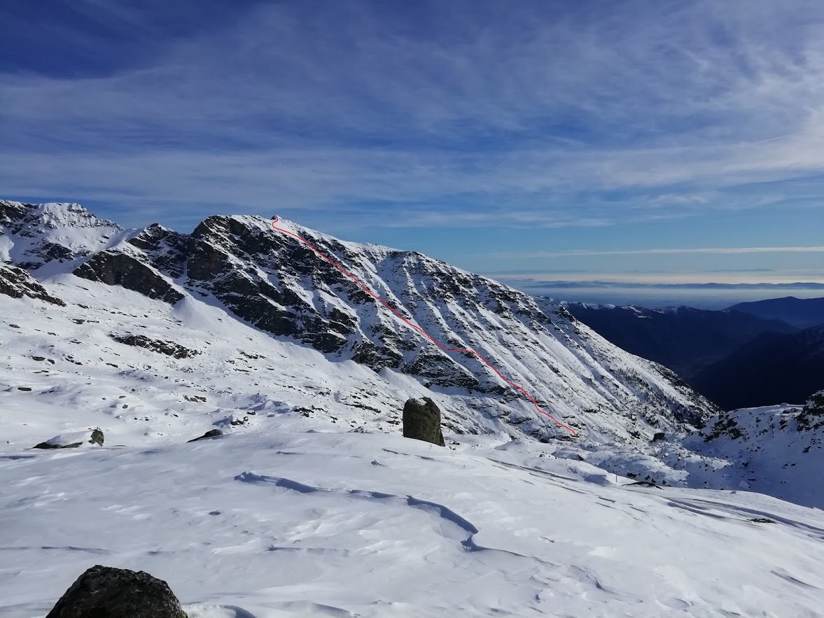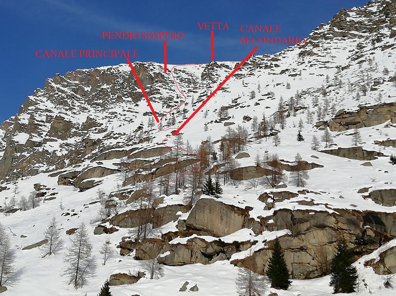 Spostandosi verso il centro del pianoro si vede bene la linea che solca l’intricata parete. Bisogna puntare all’ampio pendio sospeso a triangolo visibile sotto la vetta. Nella parte bassa la linea del canale è interrotta da una piccola cascata, pertanto per accedervi bisogna salire un canale a destra secondario che si abbandona traversando in quello principale.
