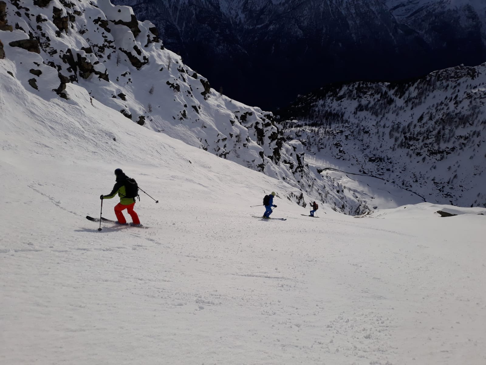 Incamminarsi sul sentiero n°323 per i Laghi d’Unghiasse, posti alla testata dell’omonimo vallone. Ci si sposta a destra verso il Bec Di Mea fino ad immettersi su una strada sterrata che sale (se innevata si sale bene sci ai piedi e servirà anche a scendere) fino all’Alpe Vaccheria. Qui la si abbandona e si prosegue sul sentiero (salibile e abbastanza scendibile sci ai piedi con buon innevamento) fino al Pianoro delle Riane, dominato sulla destra dall’imponente bastionata del Gran Bernardè.