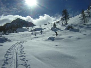 saliti da Champoluc su un pistone appena innevato dalla nevicata della notte; arrivati solo al colle Perrin; oggi farina da urlo……..fin troppa (dai 40 agli 80 cm su alcuni pendii riportata dal vento), battuta la traccia dal crest al colle; pendii molto carichi; risaliti sulla dorsale di destra (salendo) spazzata dal vento e con qualche pietra affiornante, per non traversare sotto al colle; la valletta sopra al Lago è scarsamente innevata.