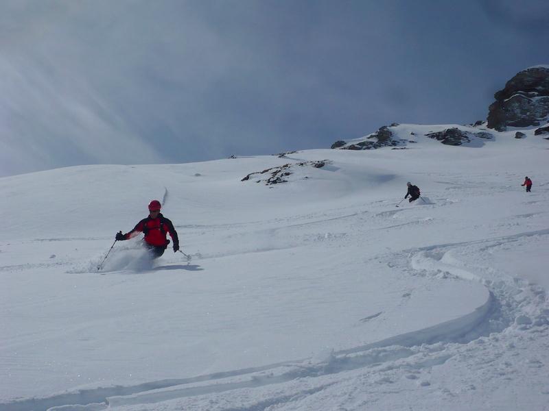 Fermati al Col Perrin sia per scendere con buon margine di sicurezza sia per gustarci la bellissima neve fresca che il sole alle 11 incominciava a scaldare!
