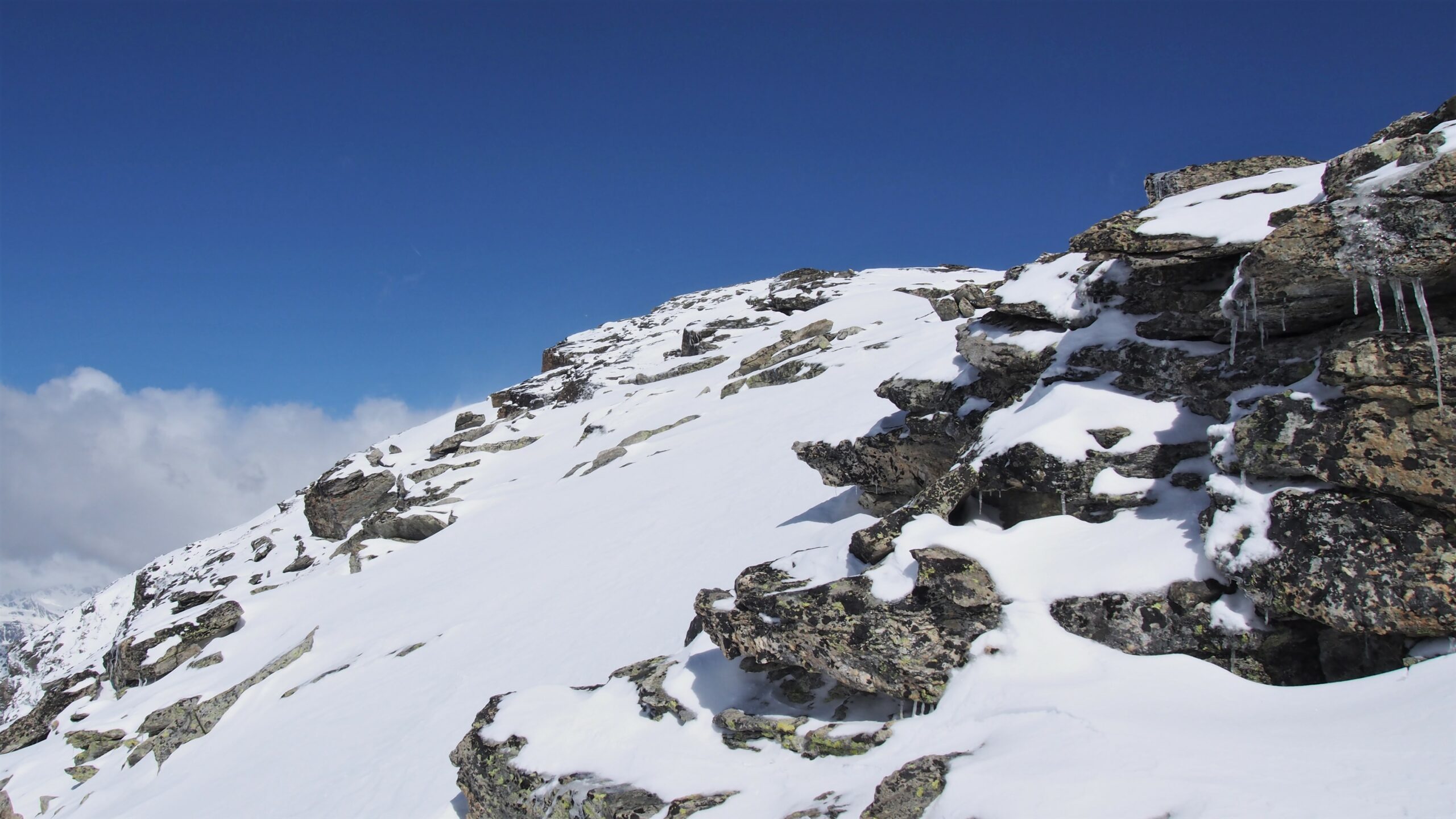 Lasciati gli sci ed in 10min a piedi (ramponi non necessari, cautela sulle roccette) si è in vetta.