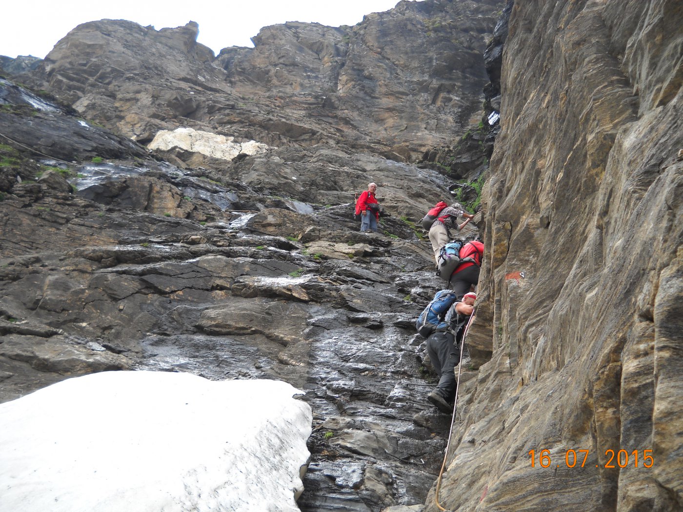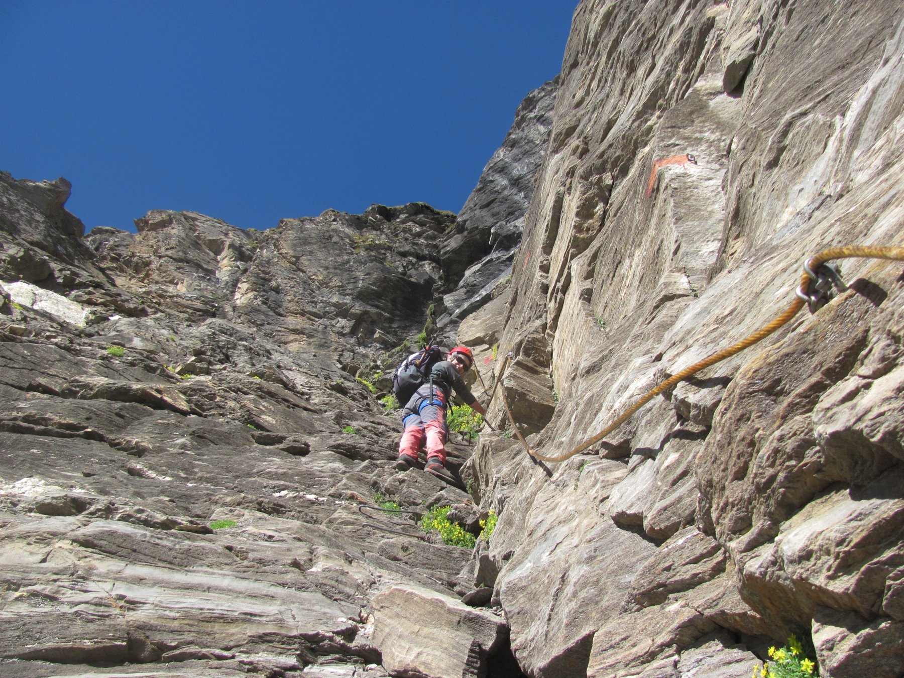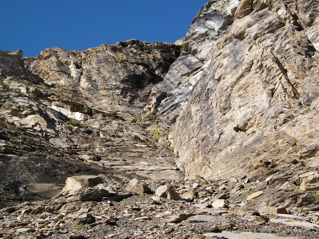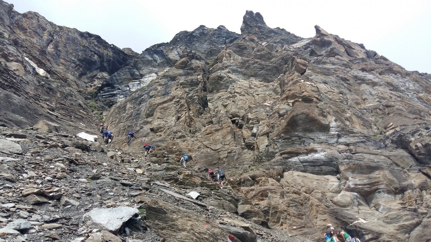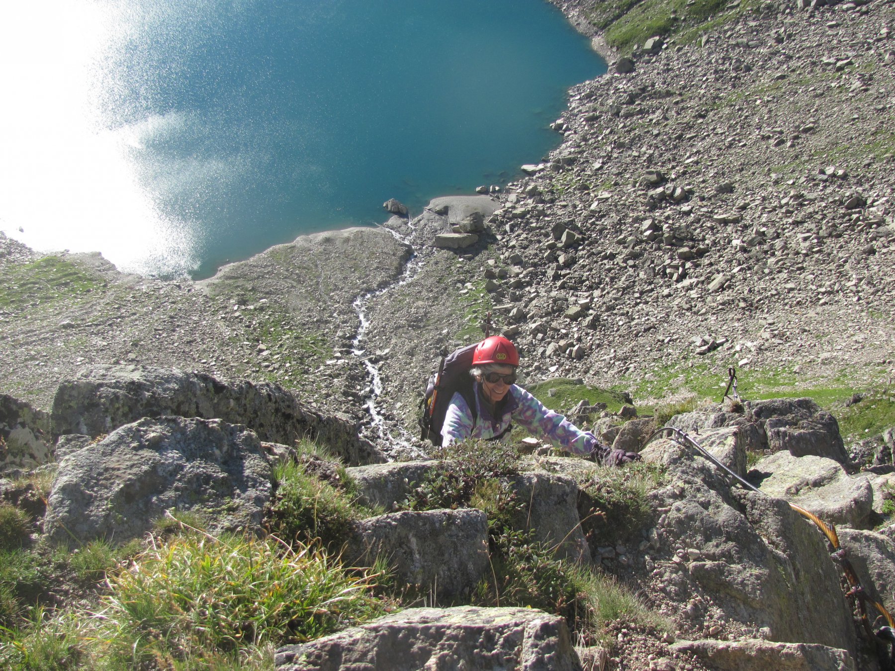 Raggiunto il ponte sulla cascata del piano, dirigersi verso OSO e risalire un lungo cono di deiezione di pietrame instabile, puntando ad un colatoio ben marcato dalla barriera rocciosa sommitale. Alla base di questa inizia l’ultimo faticoso tratto ripido che porta al colle; anche questa parte è attrezzata con corde fisse e scalini in acciaio.