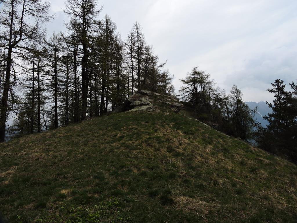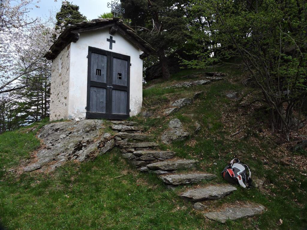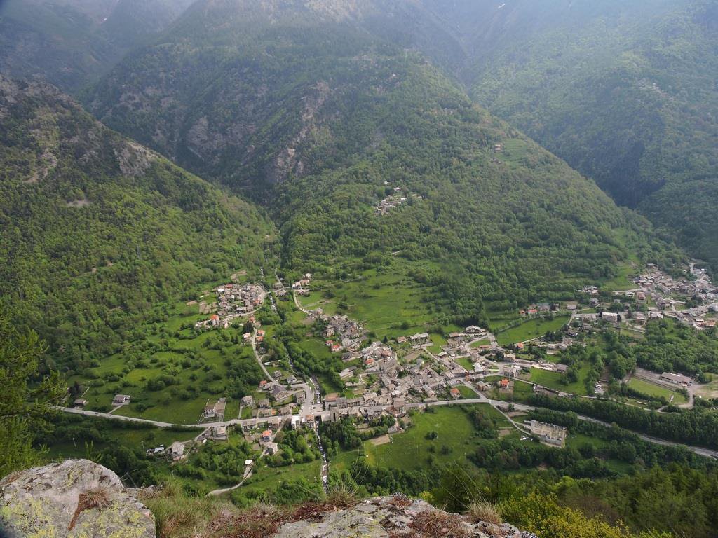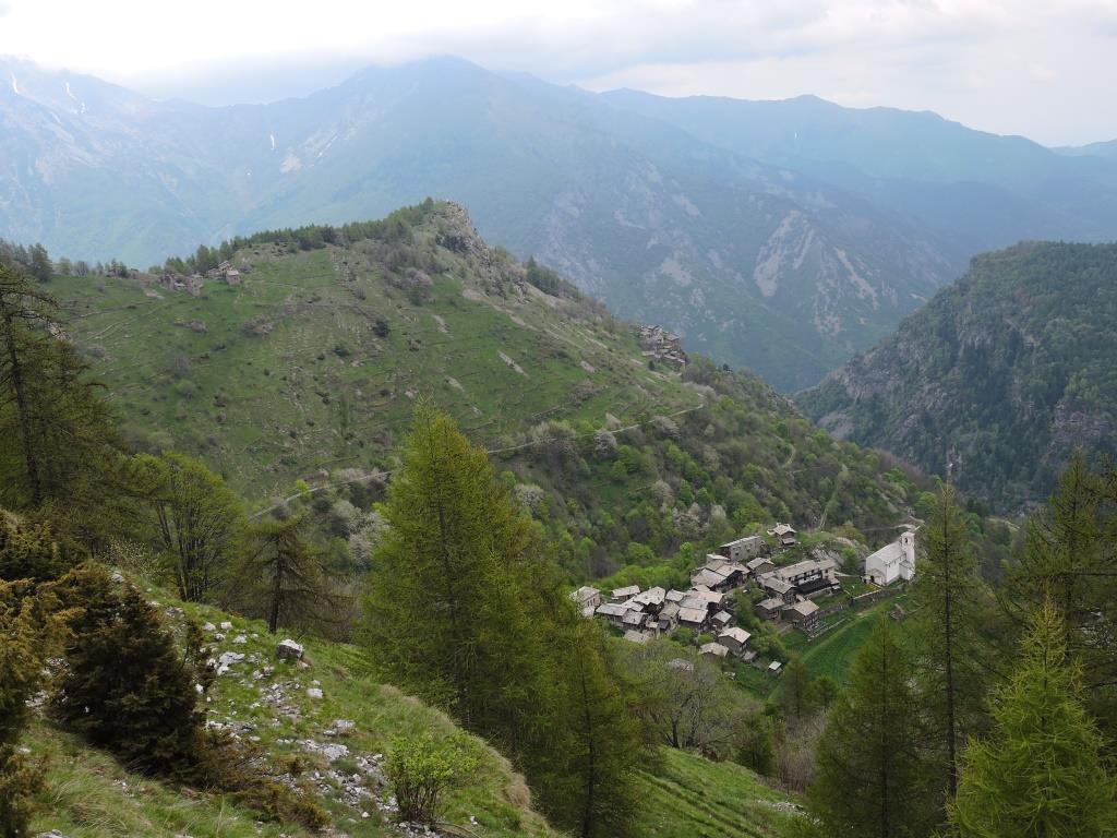 Oltrepassata la cappella e le baite si arriva alla croce di vetta che offre una splendida veduta sulla Val Chisone. Si torna indietro alla borgata e si scende a sinistra, dalla parte opposta a quella che si è saliti, per circa 150 di dislivello nel bosco, per imboccare successivamente il sentiero sulla destra che risale alla Borgata di Cleo di monte .
