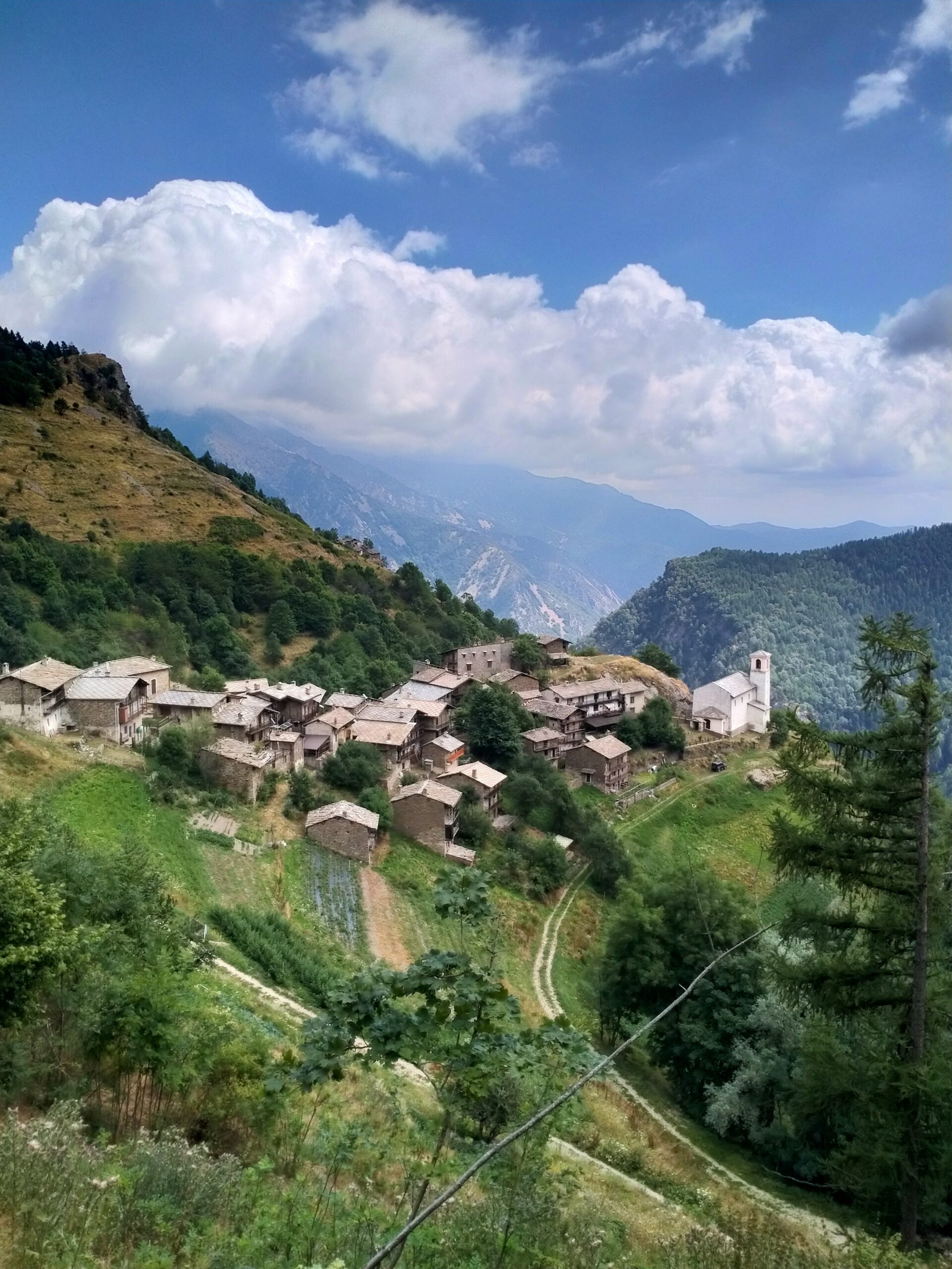 Raggiunto il punto culminale del giro, si ridiscende per sentiero che taglia il versante pascolivo fino all’Alpe Serre (m. 1.723), si continua per la pista che porta alla Borgata di Chasteiran (m. 1.594) ed al Rif. Serafin.