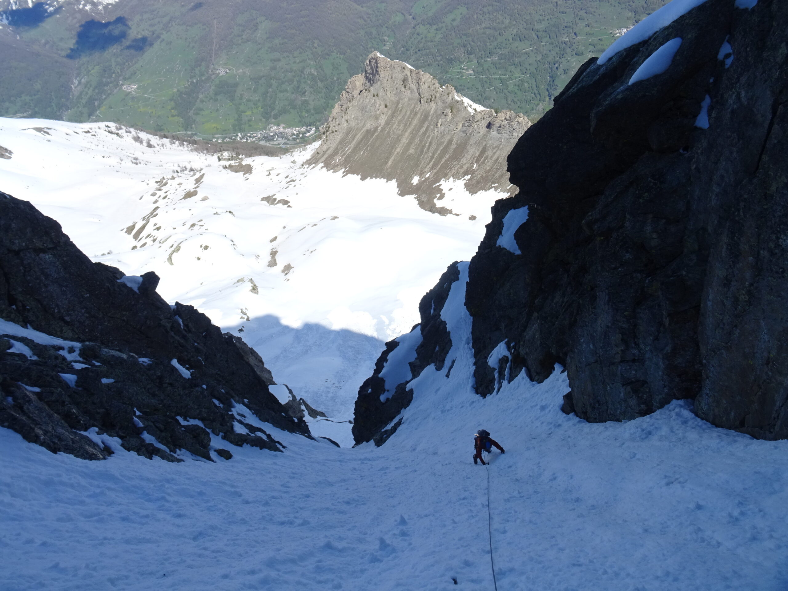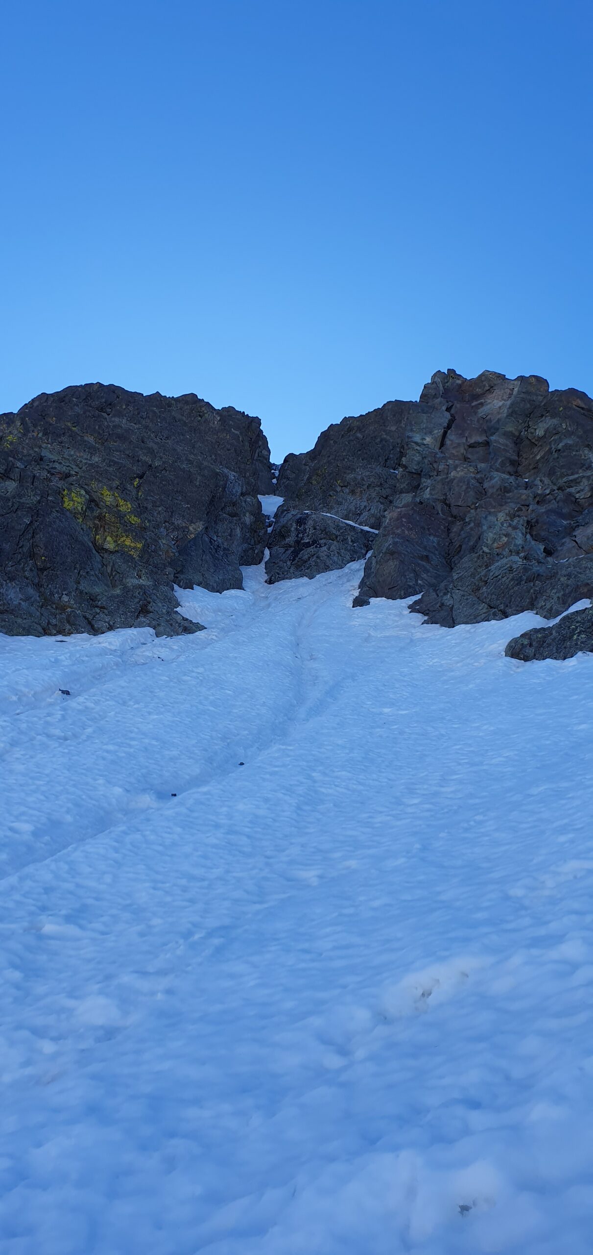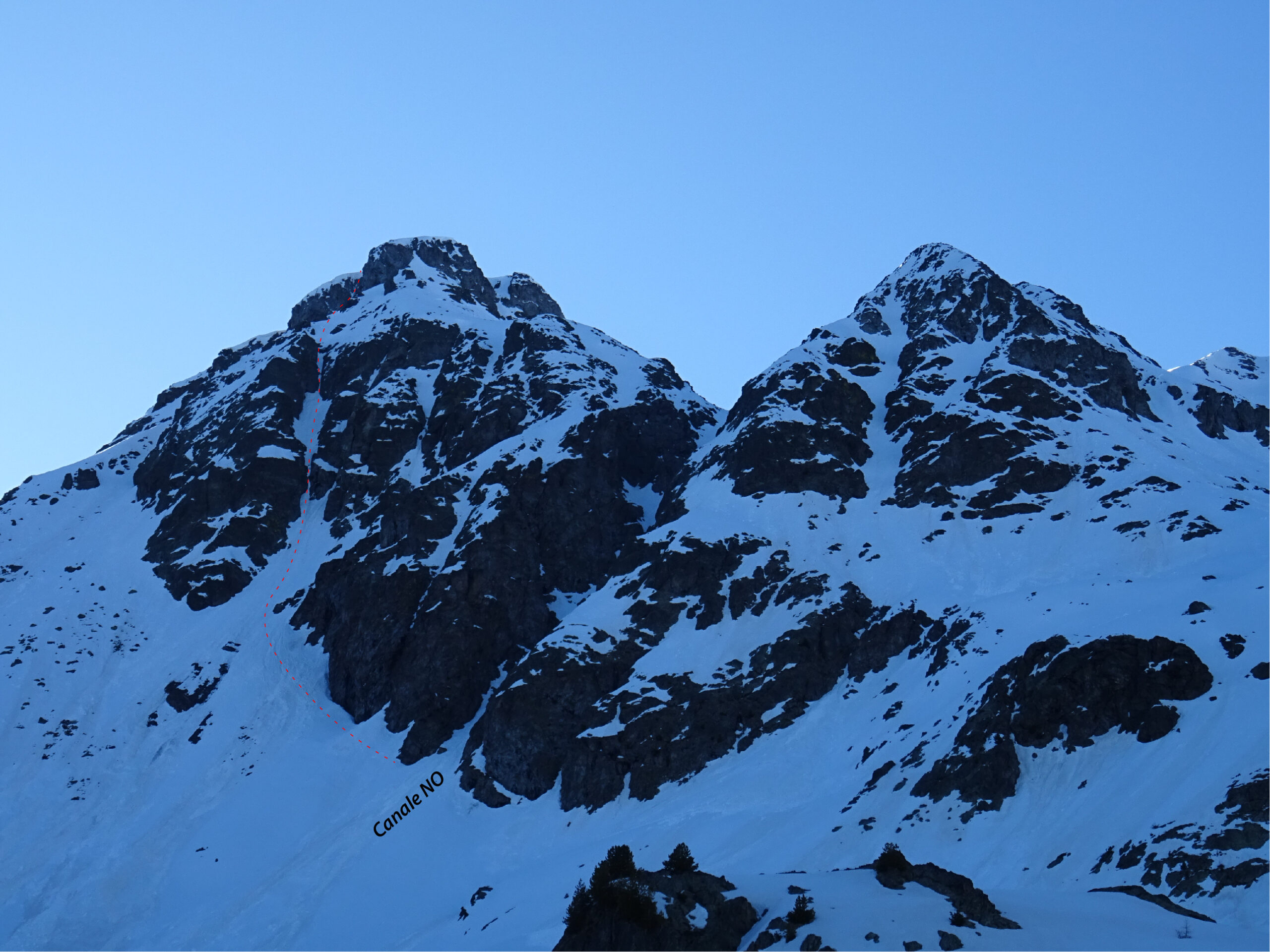 Dalla base del canale NO seguire il ripido pendio che sale a sx all’attacco del couloir (150m a 40-45°, ultimi metri a 50°).