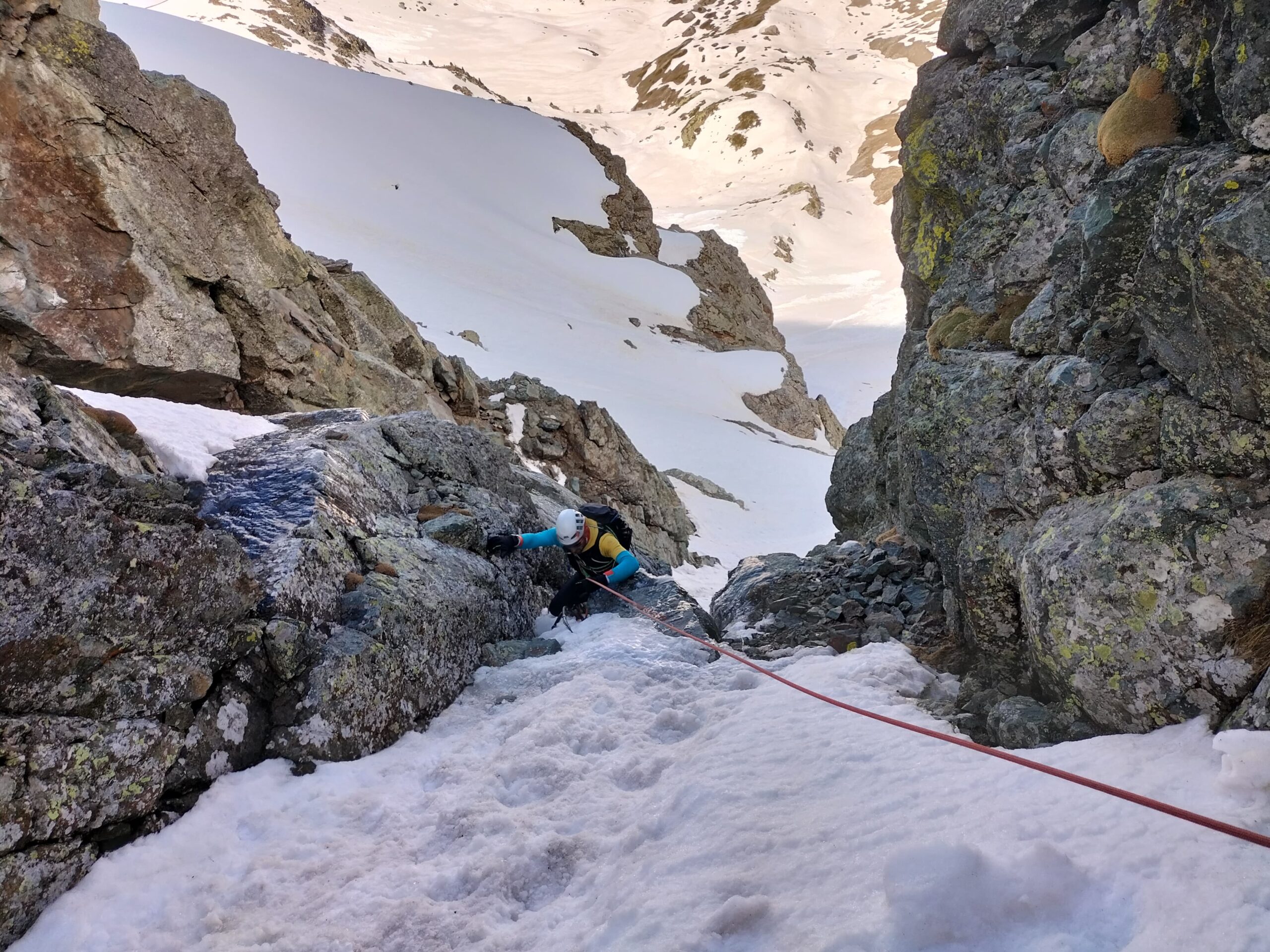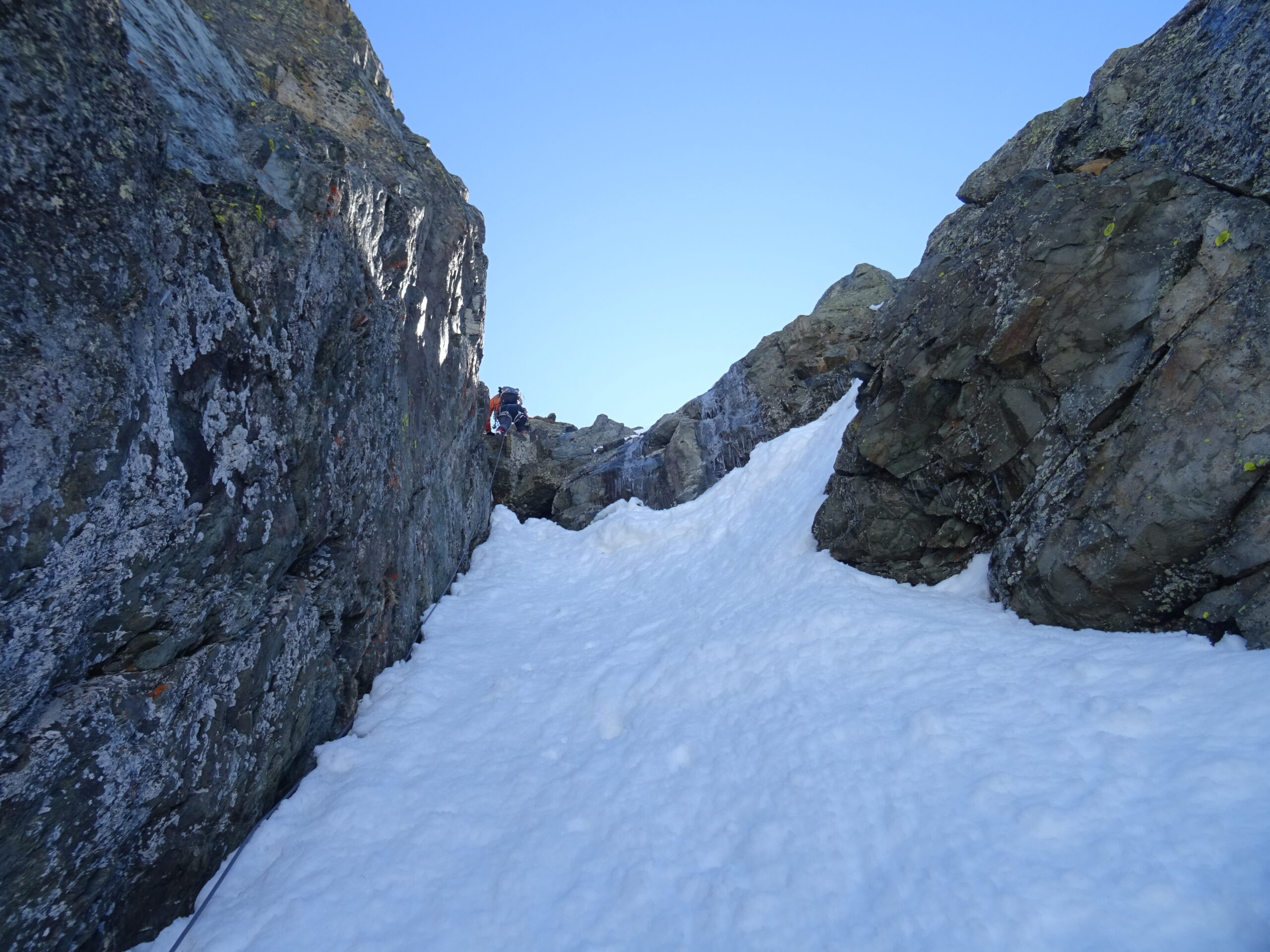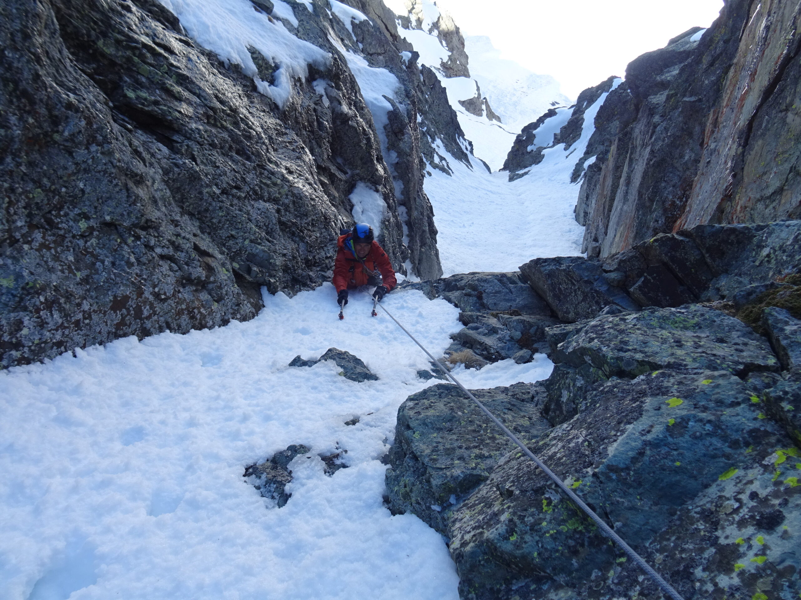 - L3: risalire la seconda goulotte (65°), quindi un passo più delicato permette di raggiungere una strettoia in roccia (M3/M4), sosta al suo termine sulla sx su un evidente spuntone (da attrezzare con cordino). 25m