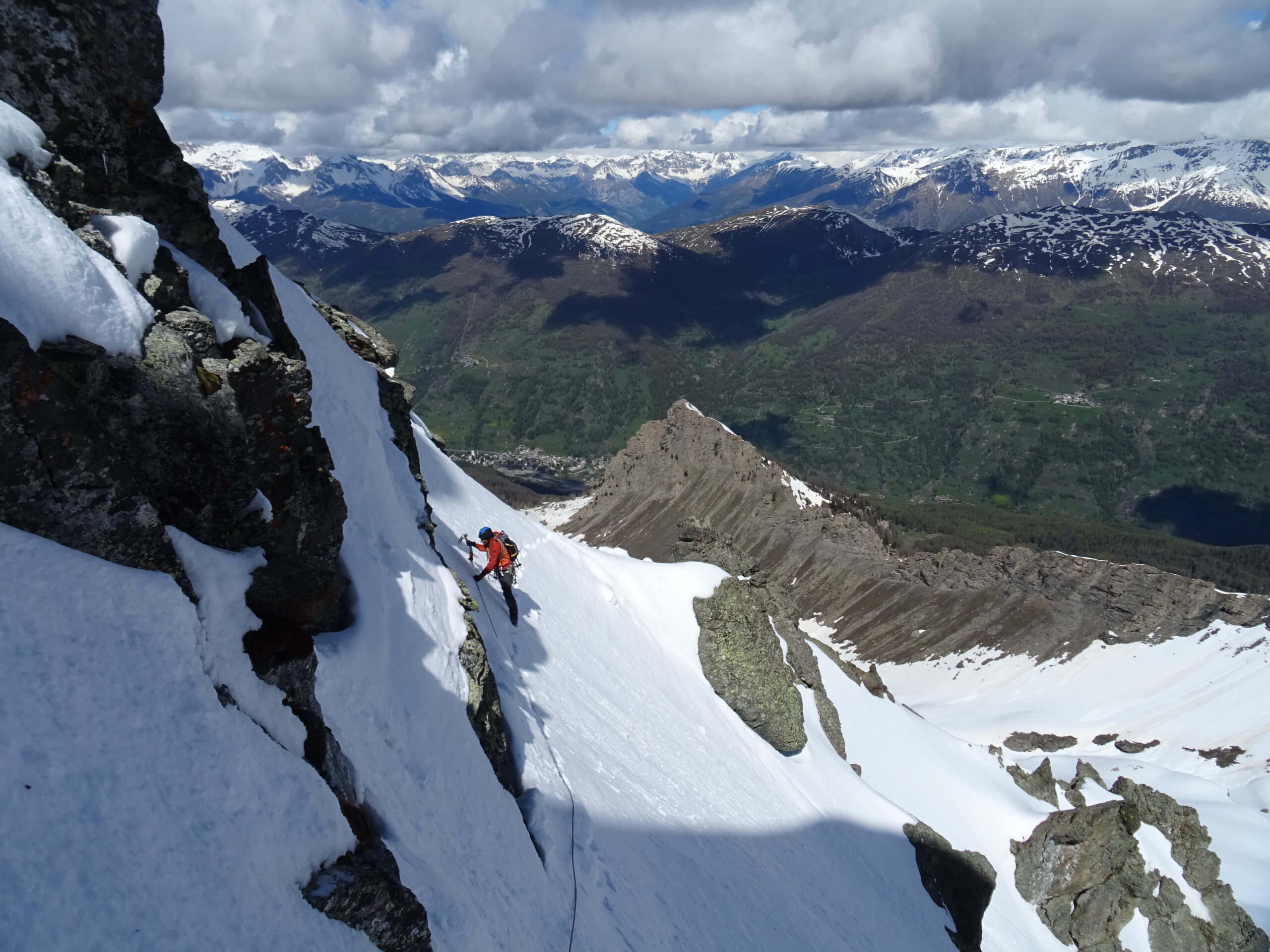 - L5: salire qualche metro costeggiando la cresta quindi, giunti sotto il castello roccioso sommitale, andare in traverso verso sx, puntando all’evidente canale terminale (50°), risalirlo fino a fine corda e quindi sostare sulle rocce a sx.