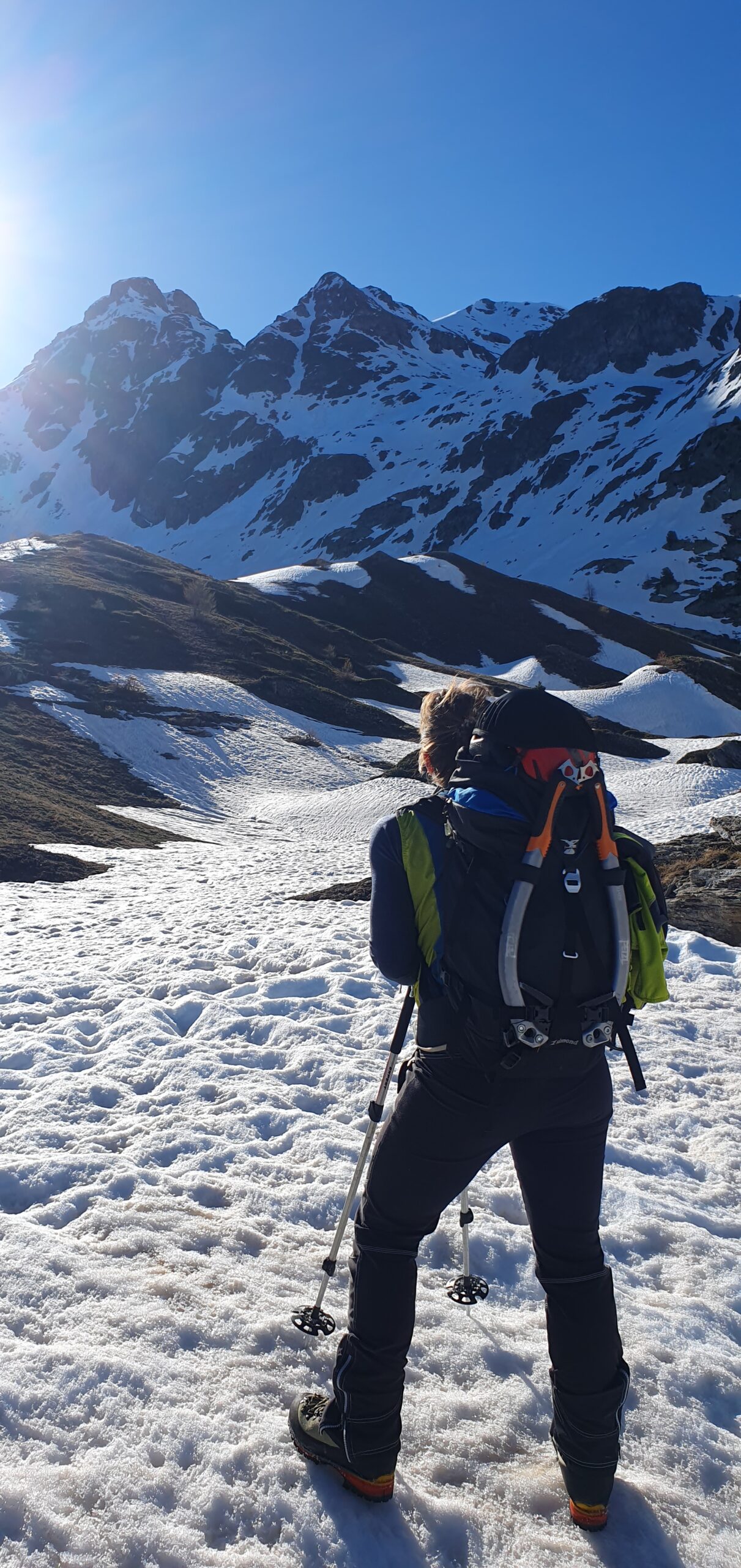 Materiale necessario: corda da almeno 40m, 4-6 rinvii, set di friend, nut, 2 chiodi a lama, 2-3 viti da ghiaccio corte, qualche cordino.