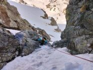- L2: trasferimento nel nevaio sospeso (50° per 40m), sosta da allestire su friend alla base della goulotte successiva sulla dx.