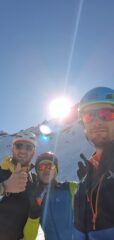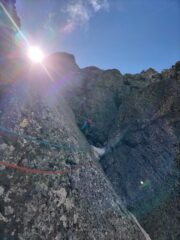 La via si presenta ancora con neve buona e ottimamente portante nei canali. Tuttavia i passaggi di misto iniziano ad essere abbastanza delicati per l’esiguo quantitativo di neve e/o ghiaccio che ormai li caratterizza. Al momento la cornice di uscita non presenta problematiche particolari e pare ben solida; uscita comoda tutto a destra.