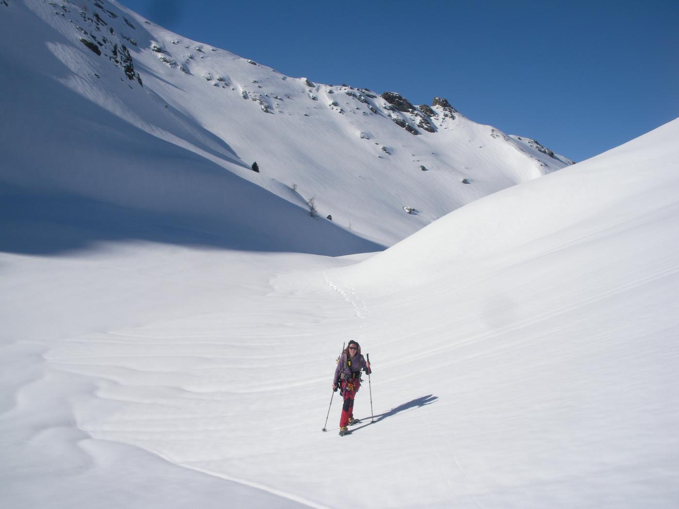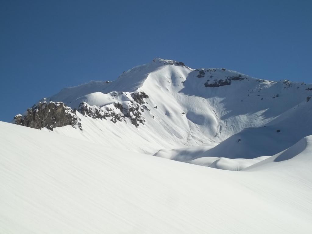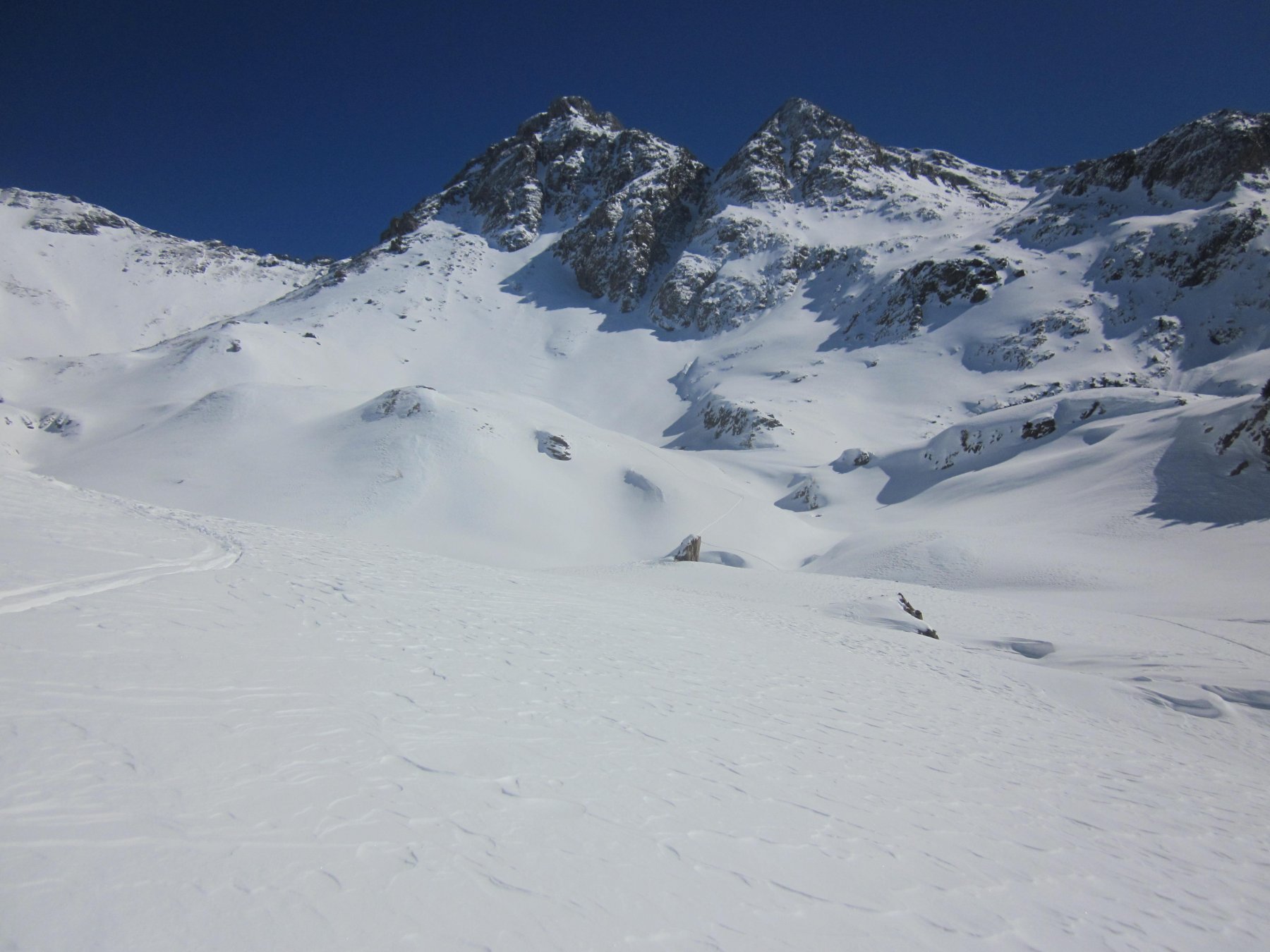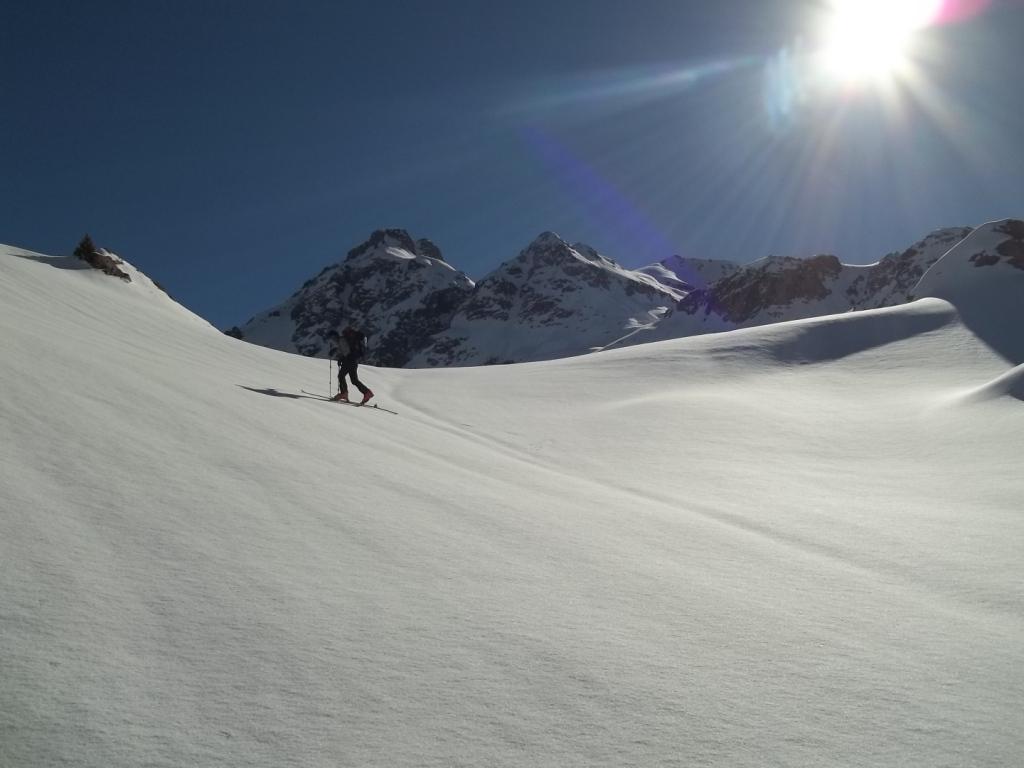 Discesa: verso nord in direzione dell’Albergian, per poi piegare decisamente a sx e tornare nel piano delle marmotte, oppure verso ovest, scendendo in piani inferiori da dove si divalla al piano delle marmotte per ripidi pendii e/o canali.