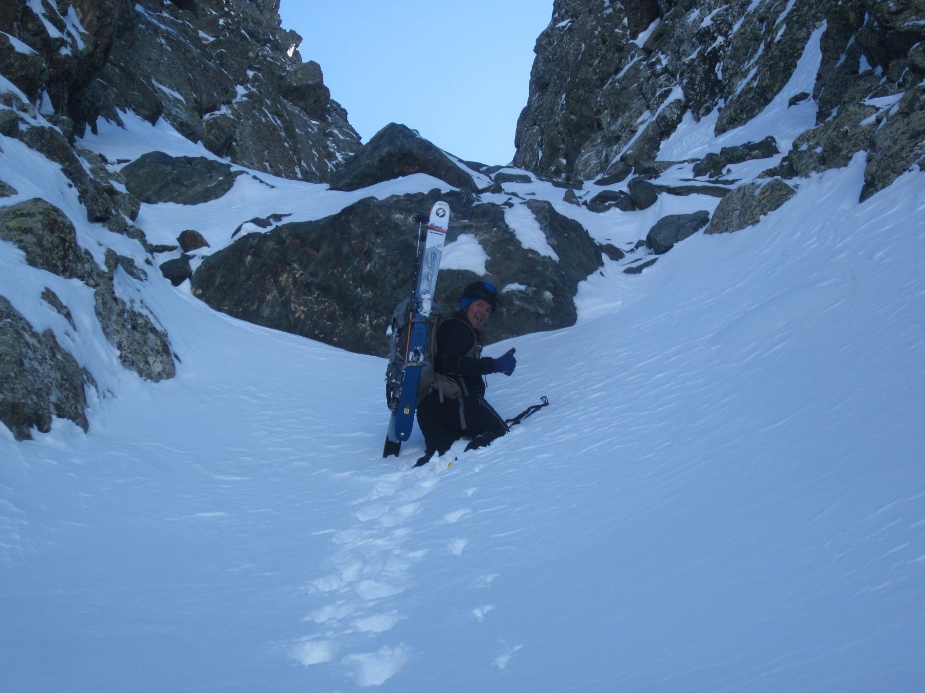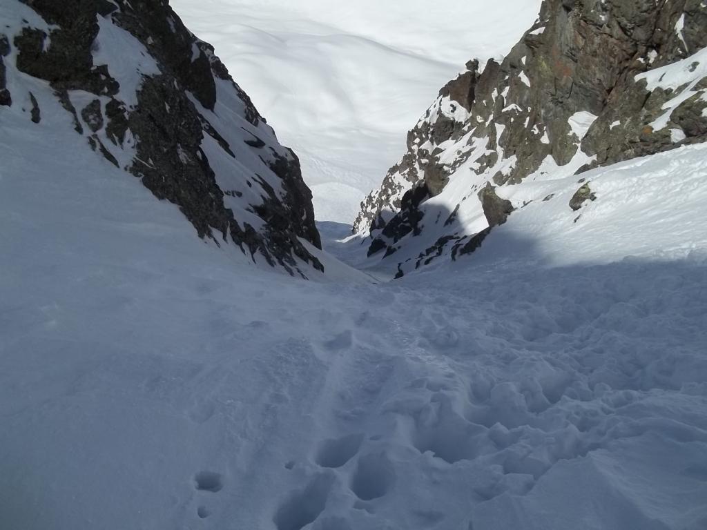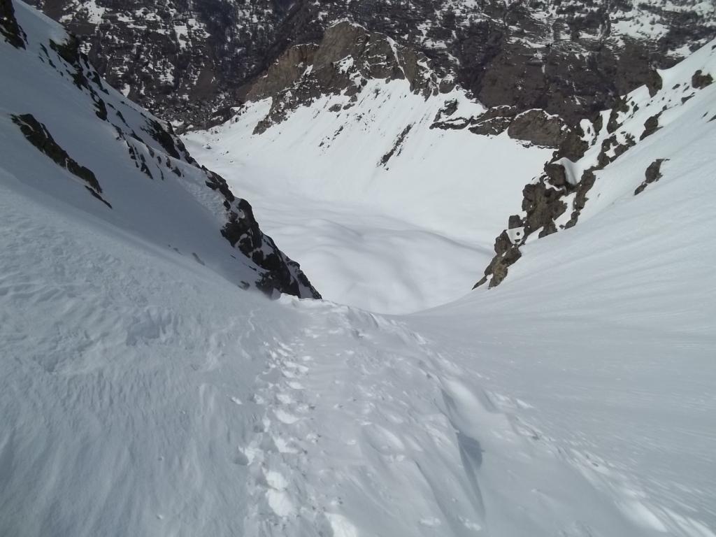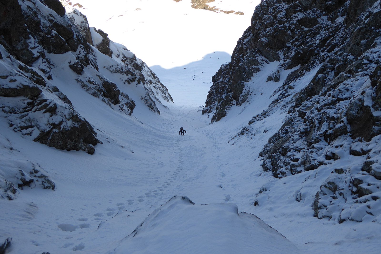 Si prosegue nel vallone costeggiando le ripide pareti rocciose della destra orografica, fino a trovarsi di fronte al canalone di salita, sul versante opposto. Si risalgono conoide e canale, che ha una lunghezza di 200 metri e una pendenza media di 40-45 gradi, con due “muri” più ripidi di circa 50 gradi in corrispondenza di salti rocciosi (passaggi di misto delicati con poca neve). A quota 2850 m circa si esce in una piccola conca sospesa (laghetto in estate) al fondo della quale vi è la poco evidente cima del Gran Miul (ometto di pietre).